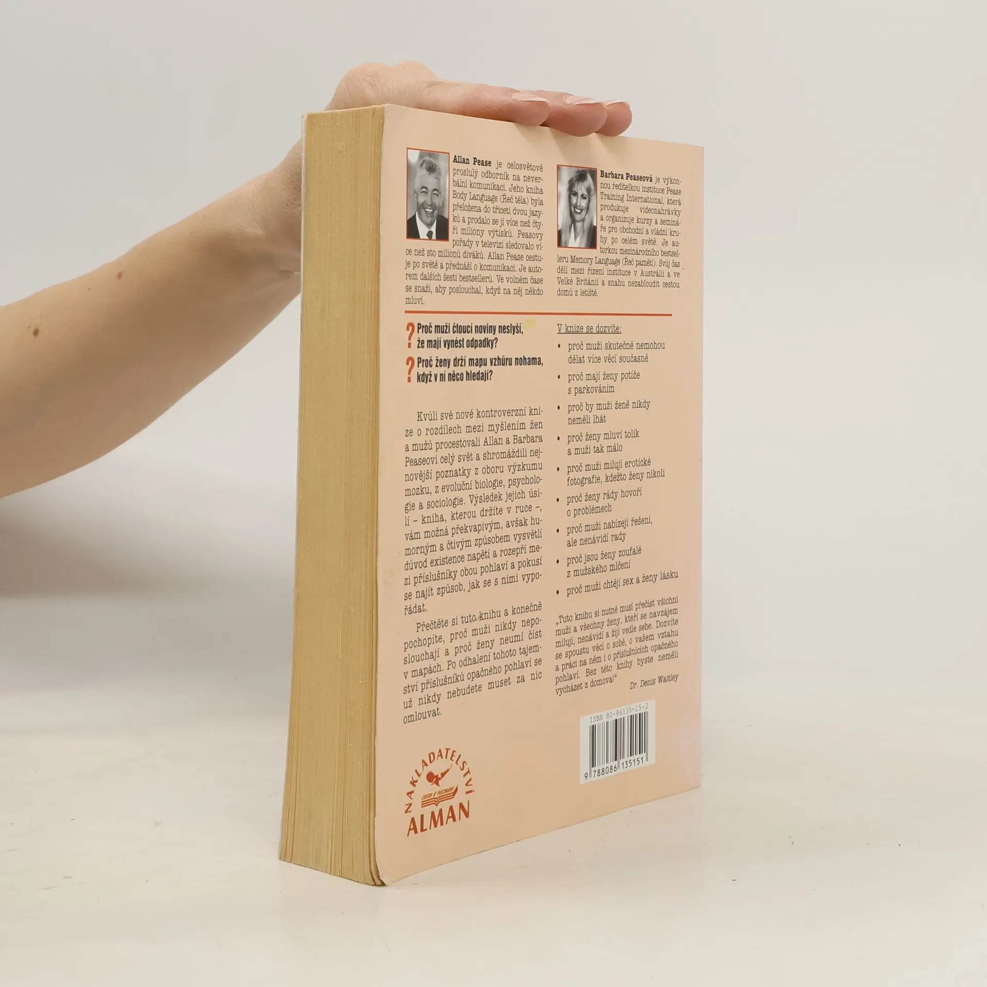 Kvůli své kontroverzní knize o rozdílech mezi myšlením žen a mužů procestovali Allan a Barbara Peaseovi celý svět a shromáždili nejnovější poznatky z oboru výzkumu mozku, z evoluční biologie, psychologie a sociologie. Výsledek jejich úsilí, vám možná překvapivým, avšak humorným a čtivým způsobem vysvětlí důvod existence napětí rozepří mezi příslušníky obou pohlaví a pokusí se najít způsob, jak se s nimi vypořádat. Přečtěte si tuto knihu a konečně pochopíte, proč muži nikdy neposlouchají a proč ženy neumí číst v mapách. Po odhalení tohoto tajemství příslušníků opačného pohlaví se už nikdy nebudete muset za nic omlouvat.