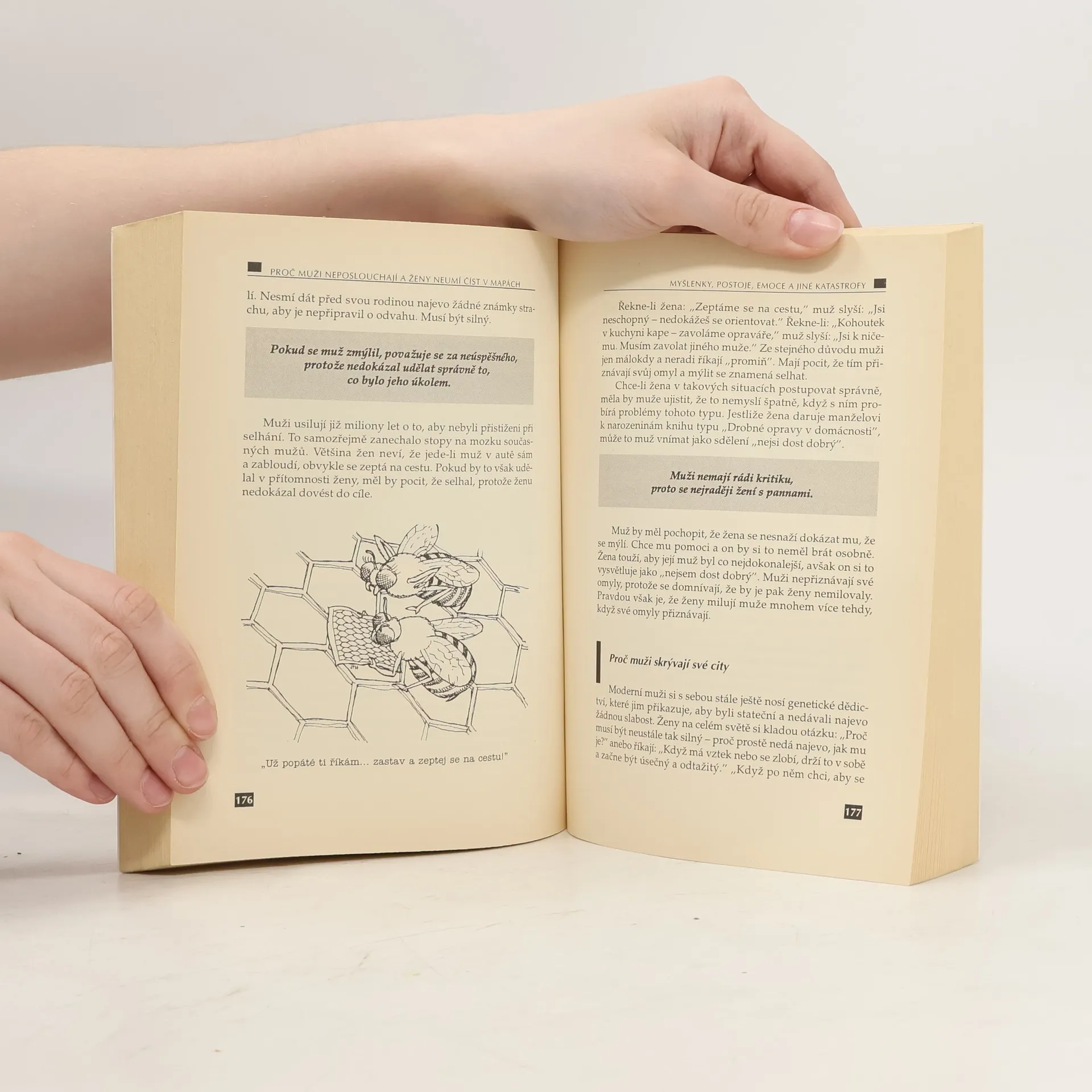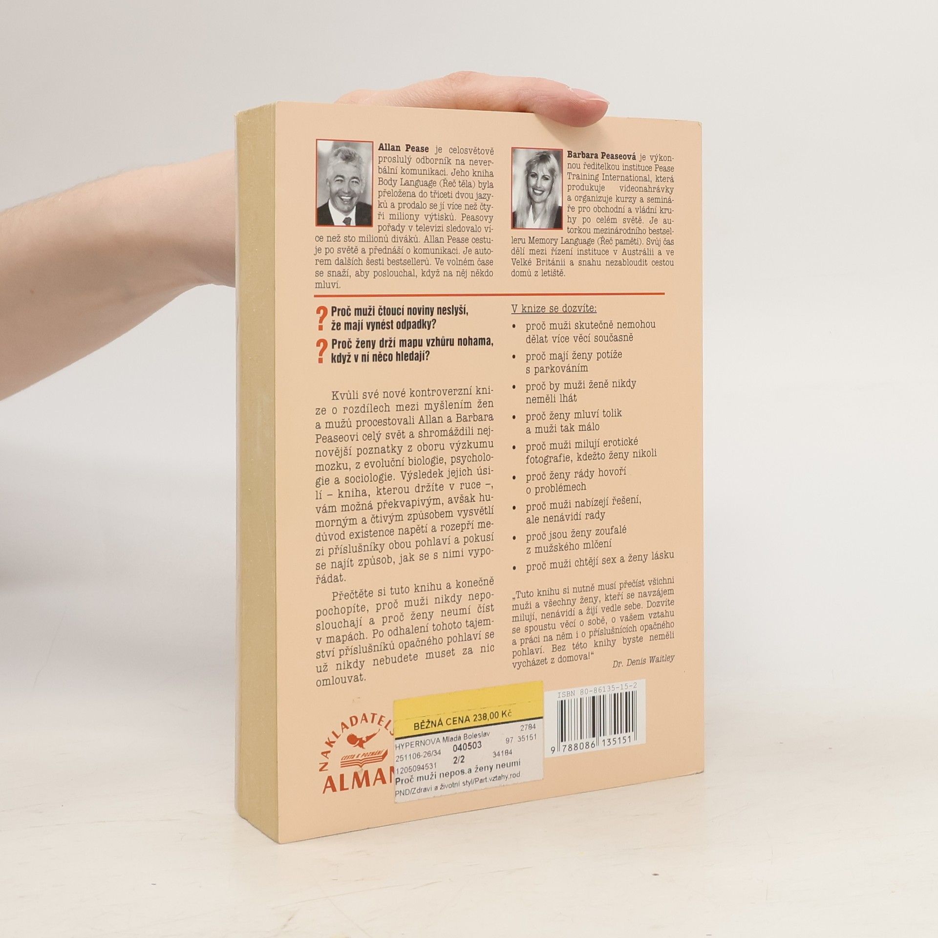 Kvůli své kontroverzní knize o rozdílech mezi myšlením žen a mužů procestovali Allan a Barbara Peaseovi celý svět a shromáždili nejnovější poznatky z oboru výzkumu mozku, z evoluční biologie, psychologie a sociologie. Výsledek jejich úsilí, vám možná překvapivým, avšak humorným a čtivým způsobem vysvětlí důvod existence napětí rozepří mezi příslušníky obou pohlaví a pokusí se najít způsob, jak se s nimi vypořádat. Přečtěte si tuto knihu a konečně pochopíte, proč muži nikdy neposlouchají a proč ženy neumí číst v mapách. Po odhalení tohoto tajemství příslušníků opačného pohlaví se už nikdy nebudete muset za nic omlouvat.