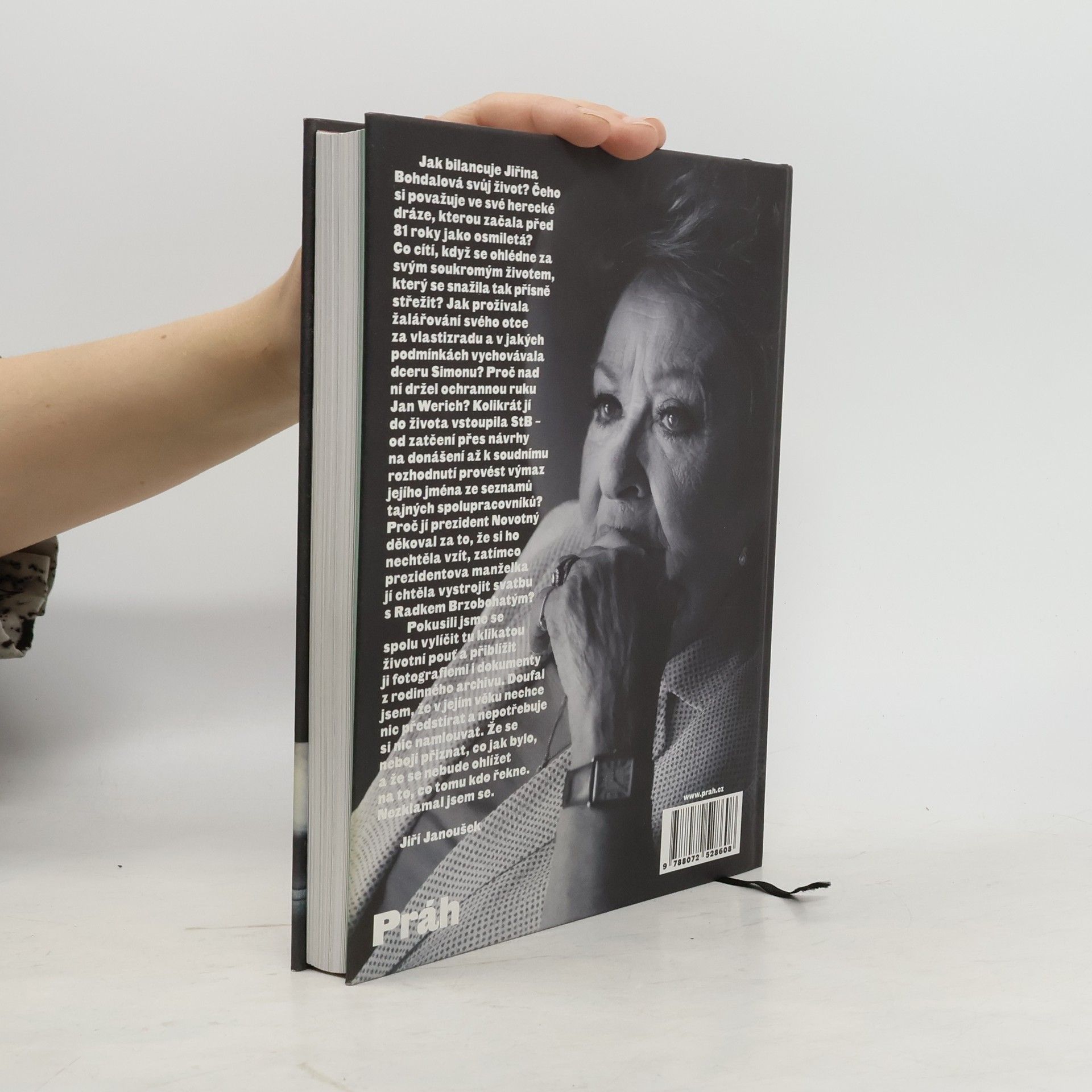 Knižní událost podzimu – Jiřina Bohdalová téměř v devadesáti letech vypráví o svém životě. Poprvé knižně. Fotografie z osobního archivu. Jak Jiřina Bohdalová bilancuje svůj život? Čeho si považuje ve své herecké dráze, kterou začala před 81 lety jako osmiletá? Co cítí, když se ohlédne za svým soukromým životem, který se snažila tak přísně střežit? Jak prožívala žalářování otce za vlastizradu a v jakých podmínkách vychovávala dceru Simonu? Proč nad ní držel ochrannou ruku Jan Werich? Kolikrát jí do života vstoupila StB – od zatčení přes návrhy na donášení až k soudnímu rozhodnuté provést výmaz jejího jména ze seznamů spolupracovníků? Proč jí prezident Novotný děkoval za to, že si ho nevzala, zatímco prezidentova manželka jí chtěla vystrojit svatbu s Radkem Brzobohatým? Jiří Janoušek ke spolupráci s Jiřinou Bohdalovou říká: „Pokusili jsme se spolu vylíčit tu klikatou životní pouť a přiblížit ji fotografiemi i dokumenty z rodinného archivu. Doufal jsem, že v jejím věku nechce nic předstírat a nepotřebuje si nic namlouvat. Že se nebojí přiznat, co jak bylo, a že se nebude ohlížet na to, co tomu kdo řekne. Nezklamal jsem se.“