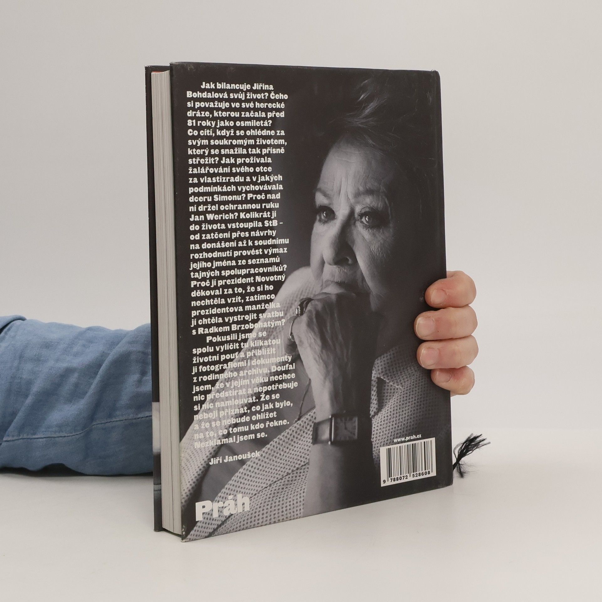 Knižní událost podzimu – Jiřina Bohdalová téměř v devadesáti letech vypráví o svém životě. Poprvé knižně. Fotografie z osobního archivu. Jak Jiřina Bohdalová bilancuje svůj život? Čeho si považuje ve své herecké dráze, kterou začala před 81 lety jako osmiletá? Co cítí, když se ohlédne za svým soukromým životem, který se snažila tak přísně střežit? Jak prožívala žalářování otce za vlastizradu a v jakých podmínkách vychovávala dceru Simonu? Proč nad ní držel ochrannou ruku Jan Werich? Kolikrát jí do života vstoupila StB – od zatčení přes návrhy na donášení až k soudnímu rozhodnuté provést výmaz jejího jména ze seznamů spolupracovníků? Proč jí prezident Novotný děkoval za to, že si ho nevzala, zatímco prezidentova manželka jí chtěla vystrojit svatbu s Radkem Brzobohatým? Jiří Janoušek ke spolupráci s Jiřinou Bohdalovou říká: „Pokusili jsme se spolu vylíčit tu klikatou životní pouť a přiblížit ji fotografiemi i dokumenty z rodinného archivu. Doufal jsem, že v jejím věku nechce nic předstírat a nepotřebuje si nic namlouvat. Že se nebojí přiznat, co jak bylo, a že se nebude ohlížet na to, co tomu kdo řekne. Nezklamal jsem se.“