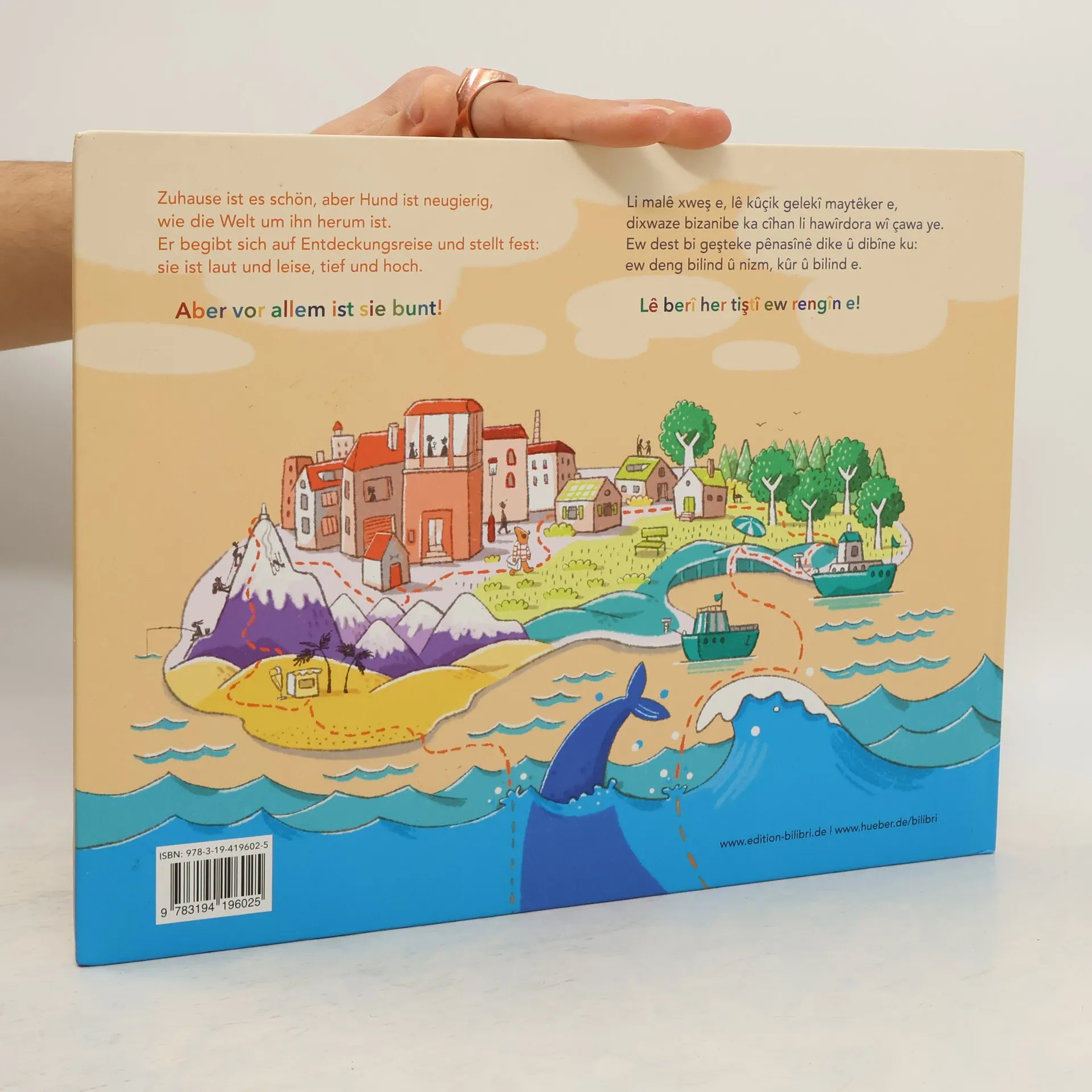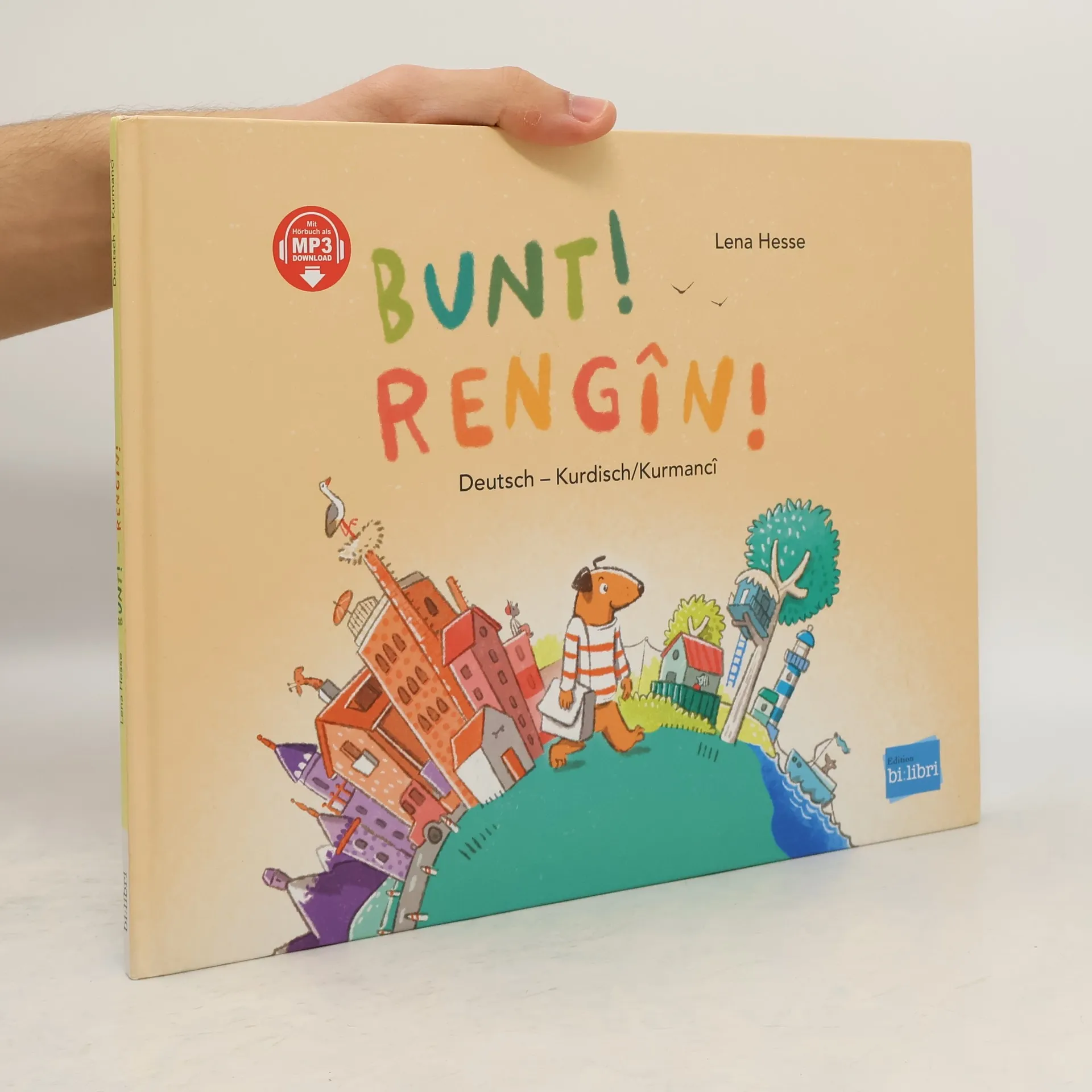 Zweisprachiges Kinderbuch Deutsch-Kurmancî ab 3 Jahren Zuhause ist es schön, aber Hund ist neugierig, wie die Welt um ihn herum ist. Er begibt sich auf Entdeckungsreise und stellt fest: sie ist laut und leise, tief und hoch. Aber vor allem ist sie bunt! „Bunt!“ ist eine Geschichte über menschliche, sensorische, landschaftliche und biologische Diversität. Auf seiner Reise entdeckt Hund unterschiedliche Menschen, eine Vielfalt an Tieren und Pflanzen, Chaos und Ruhe, Höhen und Tiefen und dabei wird die Welt immer bunter. Es ist ein subtiler Aufruf, Diversität nicht nur zu begrüßen, sondern sie aufzusuchen. Ein besonderes Buch für unsere multilinguale und multikulturelle Leserschaft und Gesellschaft. Durchgehend farbig illustriert, mit MP3-Hörbuch zum Herunterladen. Erhältlich in weiteren Sprachausgaben.