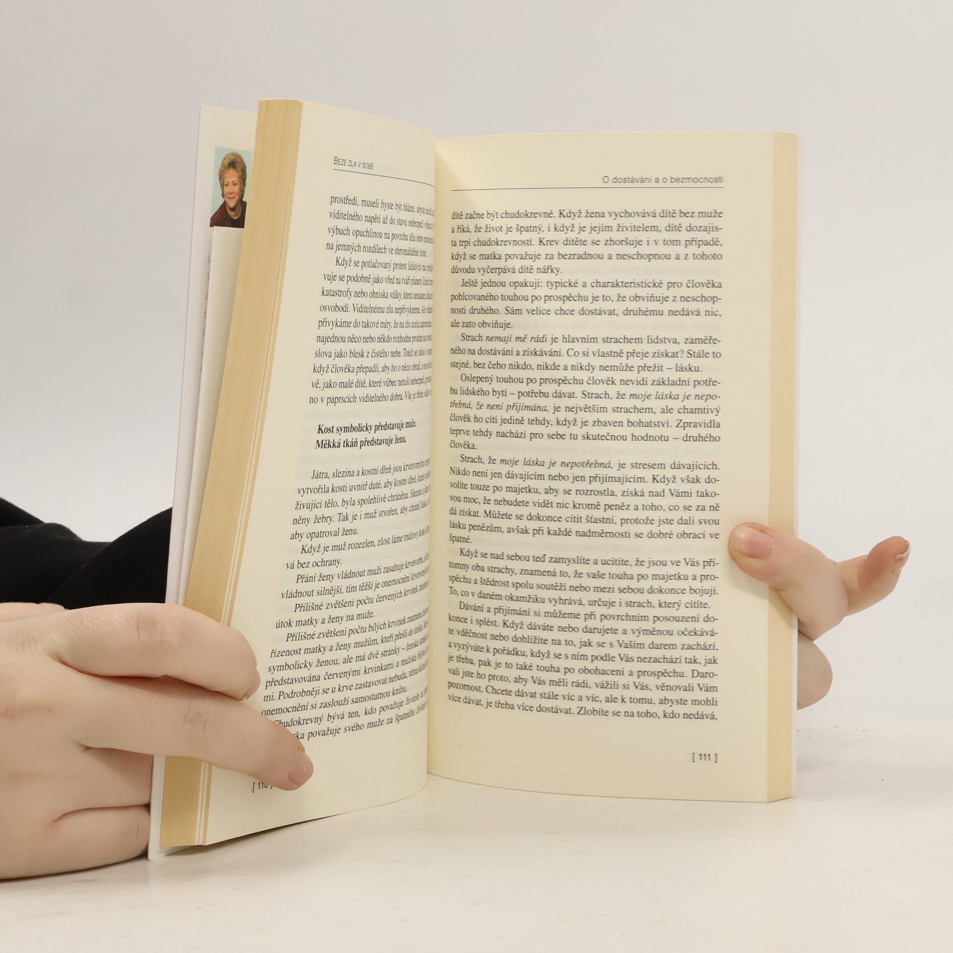 Beze zla v sobě je třetí ze série osmi knih, v nichž autorka předává čtenářům své vědomosti o duši člověka. První dvě knihy jsou Duševní světlo a Zůstat anebo jít. Dnes neexistuje takový člověk, který by necítil strach nemají mě rádi. Čím více člověk existenci tohoto stresu odmítá, tím je stres silnější. Ale každý má právo odmítat své problémy. A učit se pomocí hořkého utrpení.