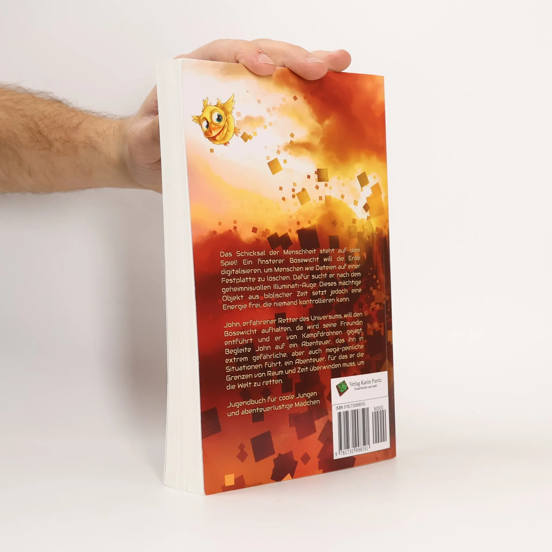 Das Schicksal der Menschheit steht auf dem Spiel! Ein finsterer Bösewicht plant, die Erde zu digitalisieren und Menschen wie Dateien zu löschen. Dazu sucht er das geheimnisvolle Illuminati-Auge, ein mächtiges Objekt aus biblischer Zeit, das unkontrollierbare Energie freisetzt. John, ein erfahrener Retter des Universums, will den Bösewicht aufhalten, doch als seine Freundin entführt wird und er von Kampfdrohnen gejagt wird, wird die Situation brenzlig. Mit dem Illuminati-Auge könnte John seine Freundin befreien und die Digitalisierung stoppen, doch kann er die immense Macht beherrschen? Auf seiner spannenden Jagd nach dem Illuminati-Auge erlebt John ein Abenteuer voller extrem gefährlicher und mega-peinlicher Situationen, bei dem er die Grenzen von Raum und Zeit überwinden muss, um die Welt zu retten. Der aktuelle Jugendthriller behandelt Themen wie künstliche Intelligenz, Rassismus und Rechtsterrorismus und führt den 14-jährigen Helden von einer mittelalterlichen Burg in Bayern über Berlin bis zum Teilchenbeschleuniger CERN in Genf und in ein digitales Universum. Während er in gefährliche Situationen gerät, lernt er, was wahre Opferbereitschaft bedeutet. Neben der dramatischen Handlung gibt es viele wissenschaftliche Informationen und Humor, während die Helden mitten in der Pubertät von einer peinlichen Situation zur nächsten stolpern. Ein Leser beschreibt es als eine Sci-Fi-Geschichte mit rasender Action, überraschenden Wen
