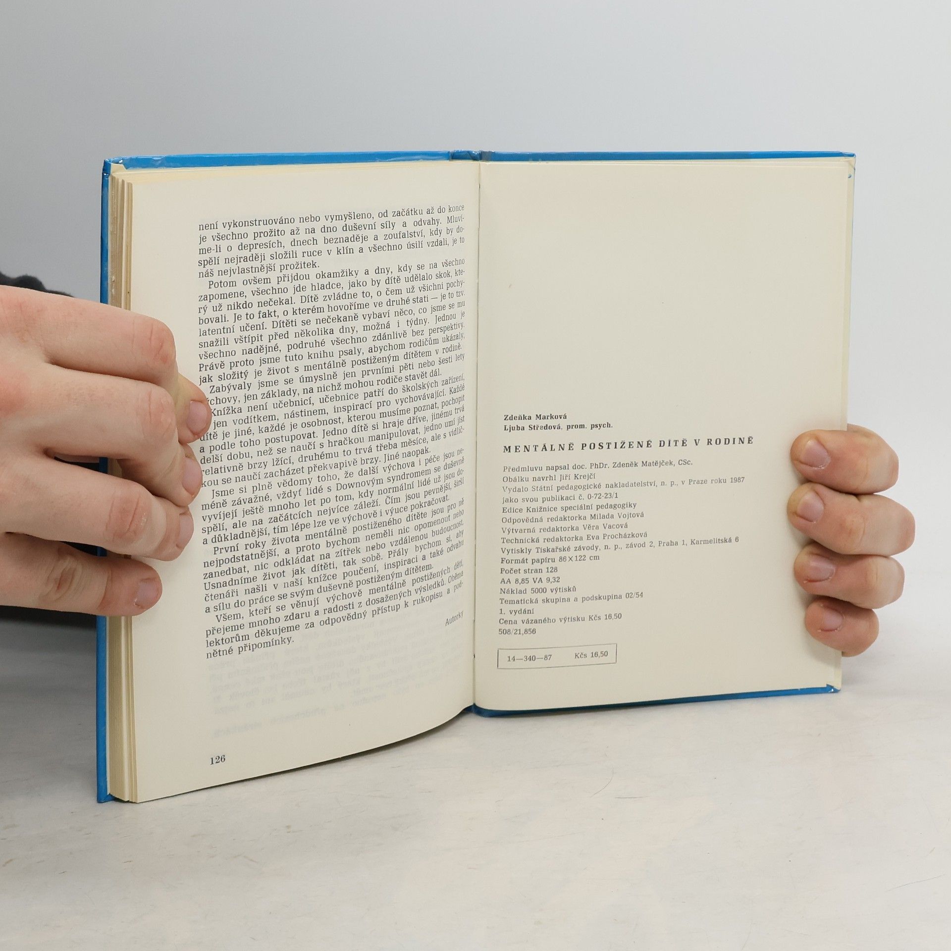 Obsah: Zkušenosti s výchovou mentálně postiženého dítěte-Místo radosti bolest, Těžké rozhodování, Konečně rozhodnuto, Soucit nebo láska, Zdravotní péče o dítě s Downovým syndromem, Výchova začíná už od prvního dne, Jak dál ?, Zvyky, návyky a zlozvyky, Hračky, obrázkové knížky adítě, Řeč a mluvení, Výchova k pracovitosti, Postižené dítě a sourozenci, Dítě a okolní svět. Teorie a praxe psychologa-Individualita mentálně opožděného dítěte, Děti postižené Downovým syndromem, Možnosti učení a stimulace. 14-340-87