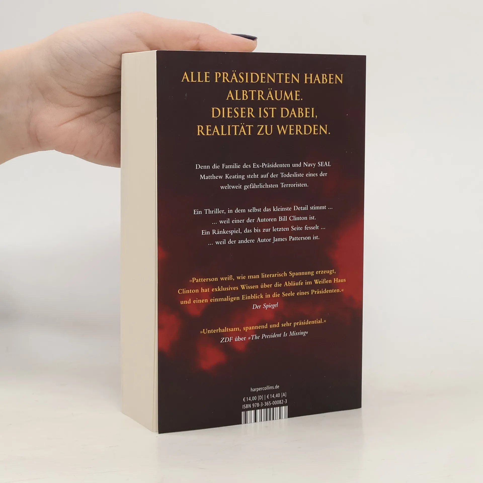 Die Familie des Ex-Präsidenten und Navy SEAL Matthew Keating steht auf der Todesliste eines gefährlichen Terroristen. Nach einer gescheiterten Militäraktion in Libyen, die seine zweite Amtszeit kostete, führt er mit seiner Frau und Tochter ein ruhiges Leben in New Hampshire. Doch als seine Tochter entführt wird, sind es nicht seine politischen Verbindungen, die ihm helfen, sondern sein hartes SEAL-Training. Kann er sie vor den Terroristen retten, bevor es zu spät ist? Bill Clinton äußert seine Dankbarkeit für die Zusammenarbeit mit James Patterson und hofft, dass die Leser das Buch ebenso genießen wie er das Schreiben. Die Pressestimmen loben die spannende Erzählweise und Clintons einzigartige Einsichten in das Weiße Haus und das Leben eines Präsidenten. Der Spiegel hebt hervor, dass Patterson literarische Spannung erzeugt, während die New York Times den Roman als großartig bezeichnet. DPA beschreibt ihn als politischen Thriller erster Güte, und Deutschlandfunk Kultur betont den patriotischen Charakter. ZDF nennt ihn unterhaltsam und spannend, während die Sunday Times den tadellosen Plot und präzisen Stil lobt. Johannes Baumstuhl von Galore hebt die gründliche Konstruktion des Thrillers hervor, der die Erfahrung eines der meistgelesenen Autoren widerspiegelt. Lebensart Kiel vergibt fünf von fünf Sternen, und OÖ Nachrichten empfiehlt ihn für Fans von Hollywood-Action.