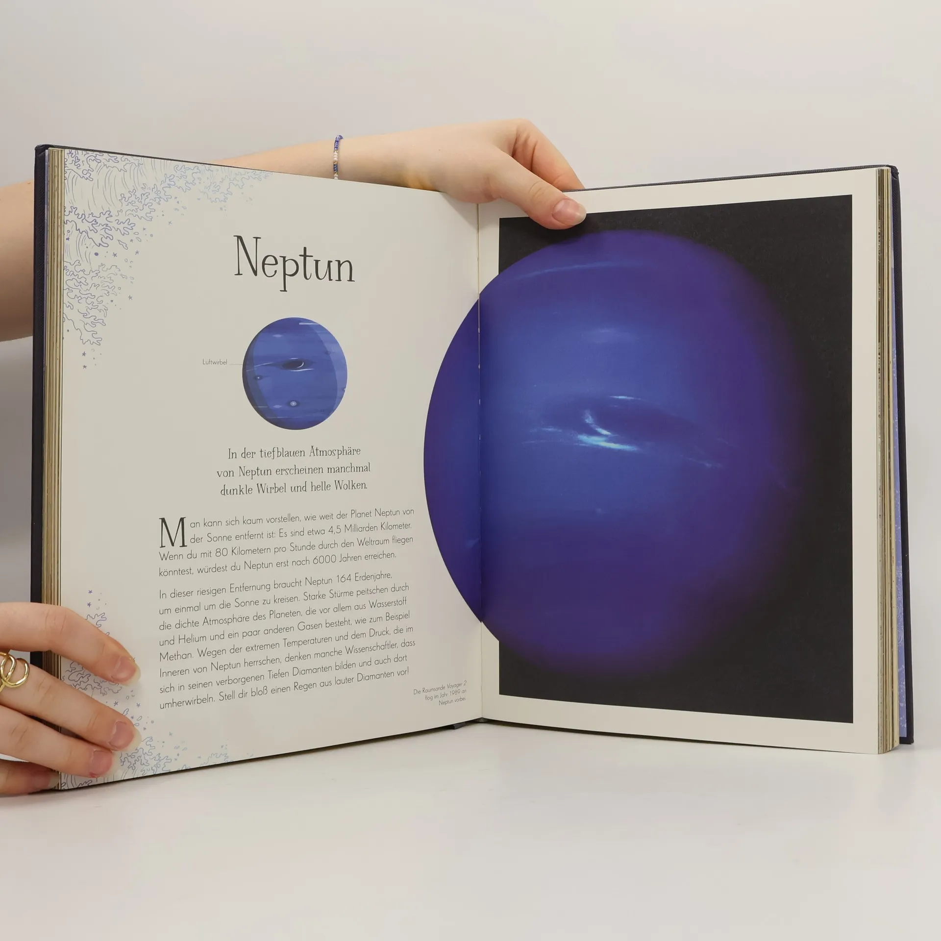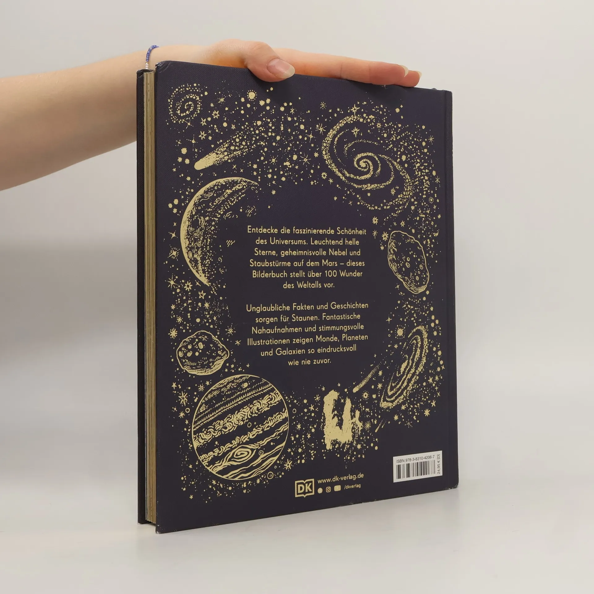 Wunderschönes Weltraumlexikon für die ganze Familie Ob leuchtend helle Sterne oder Staubstürme auf dem Mars – dieses stimmungsvolle Astronomiebuch zeigt über 100 der erstaunlichsten Wunder des Kosmos auf zauberhafte Weise! Beeindruckende Fotografien, Illustrationen und spannende Texte entführen junge Leser*innen in die fantastischen Weiten des Weltalls . Das Sachbilderbuch wird dank Lesebändchen, Goldschnitt und Goldfolie auf dem Cover zum perfekten Geschenk zum Vorlesen und Schmökern für die ganze Familie. Eine atemberaubende Reise durch den Weltraum: - Über 100 Einblicke in das Weltall für Kinder – von unserem Heimatplaneten Erde aus geht es am Mond vorbei zu den Planeten des Sonnensystems bis zum Kuipergürtel und seinen Himmelskörpern. Im interstellaren Raum fliegt man weiter zu leuchtenden Sternen, bunten Nebeln und fernen Galaxien. - Lesenswerte Texte offenbaren Besonderheiten und spannende Fakten wie zum Beispiel, dass jeder Mensch in seinem Körper Elemente hat, die aus einer Sternenexplosion stammen. - Beeindruckende visuelle Gestaltung : fantastische Nahaufnahmen, emotionale Fotografien und stimmungsvolle Illustrationen zeigen beispielsweise Fußspuren auf dem Mond, die eisigen Ringe Saturns oder die pulsierenden Überreste einer Supernova. - Prachtvolle Ausstattung