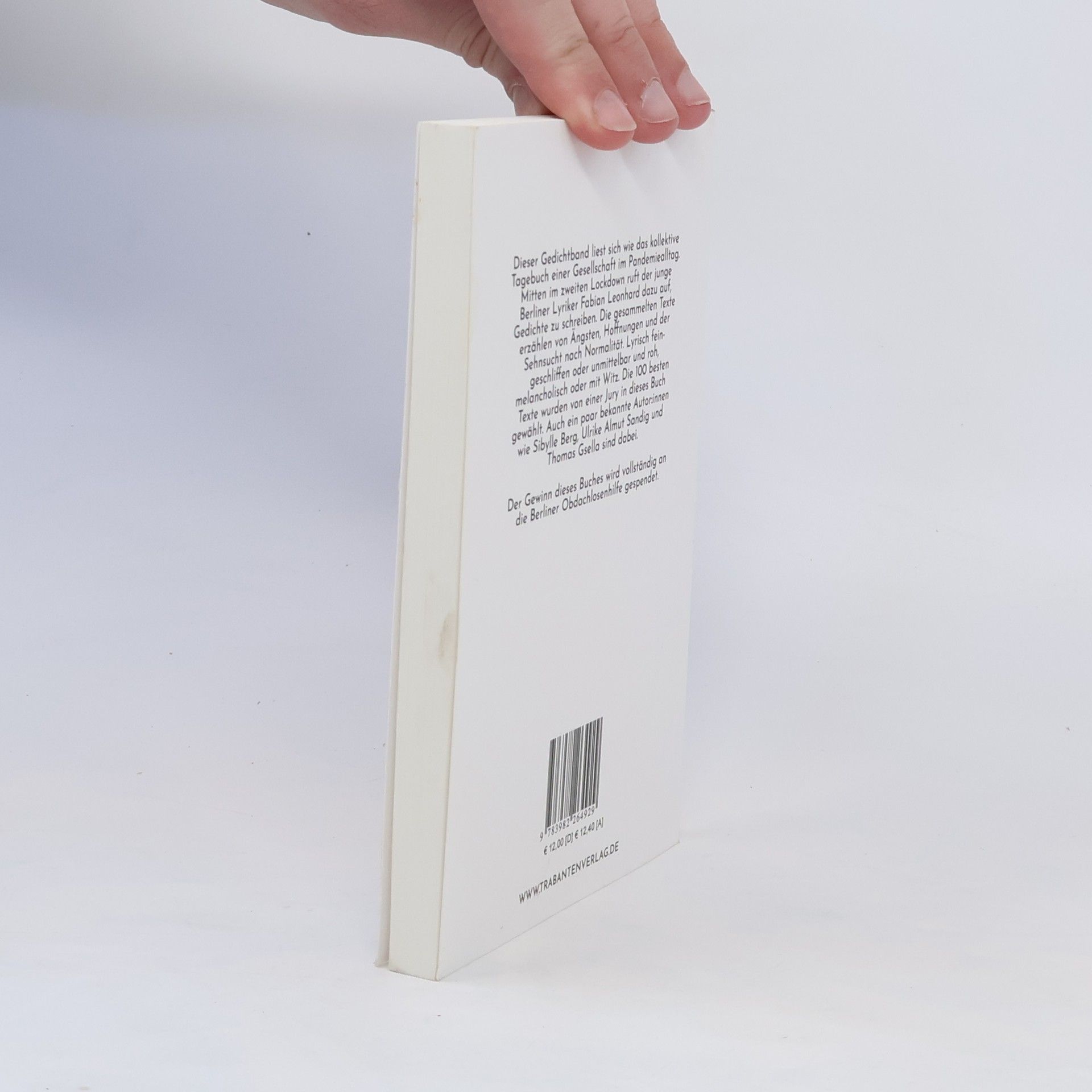 Dieser Gedichtband liest sich wie das kollektive Tagebuch einer Gesellschaft im Pandemiealltag. Mitten im zweiten Lockdown ruft der junge Berliner Lyriker Fabian Leonhard dazu auf, Gedichte zu schreiben. Die gesammelten Texte erzählen von Ängsten, Hoffnungen und der Sehnsucht nach Normalität. Lyrisch fein-geschliffen oder unmittelbar und roh, melancholisch oder mit Witz. Die 100 besten Texte wurden von einer Jury in dieses Buch gewählt. Auch ein paar bekannte Autor: innen wie Sibylle Berg, Thomas Gsella, Ulrike Almut Sandig und Hubertus Koch sind dabei. Der Gewinn dieses Buches wird vollständig an die Obdachlosenhilfe (Berliner Stadtmission) gespendet.