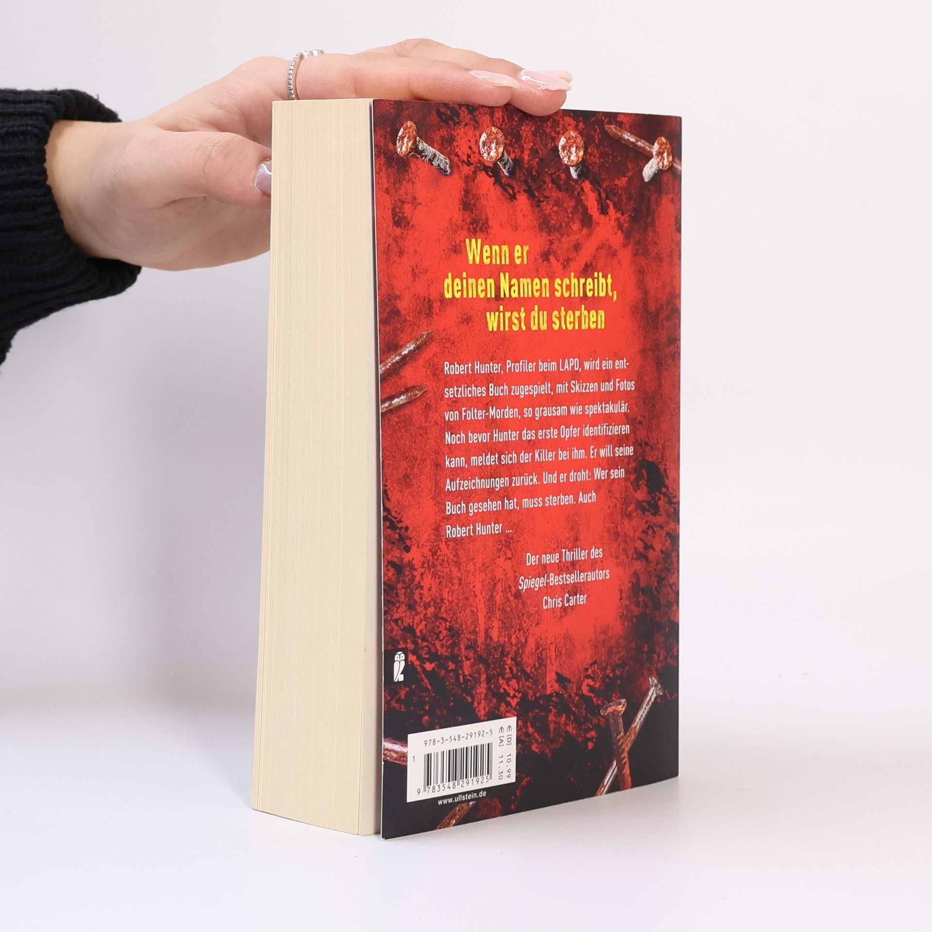 Der neue Thriller von Nr.-1-Bestsellerautor Chris Carter Taschendiebin Angela Wood hatte einen guten Tag. Sie gönnt sich einen Cocktail, als ihr in der Bar ein Gast auffällt, der sich rüpelhaft benimmt. Um ihm eine Lektion zu erteilen, stiehlt sie seine teure Ledertasche. Ein schwerer Fehler, die Tasche enthält nichts Wertvolles, nur ein kleines Notizbuch. Ein Albtraum beginnt. Das Buch enthält Skizzen und Fotos von 16 Folter-Morden. 16 Polaroids der Opfer, 16 DNA-Analysen. In Panik schickt Angela das Buch an das LAPD, wo Robert Hunter und Carlos Garcia sofort erkennen, dass der sadistische Täter ein Experte sein muss. Das ist ihr einziger Hinweis. Eine blinde Jagd beginnt, bis der Killer Hunter ein Ultimatum stellt. Der 11. Fall Robert Hunter und seinem Partner Garcia.