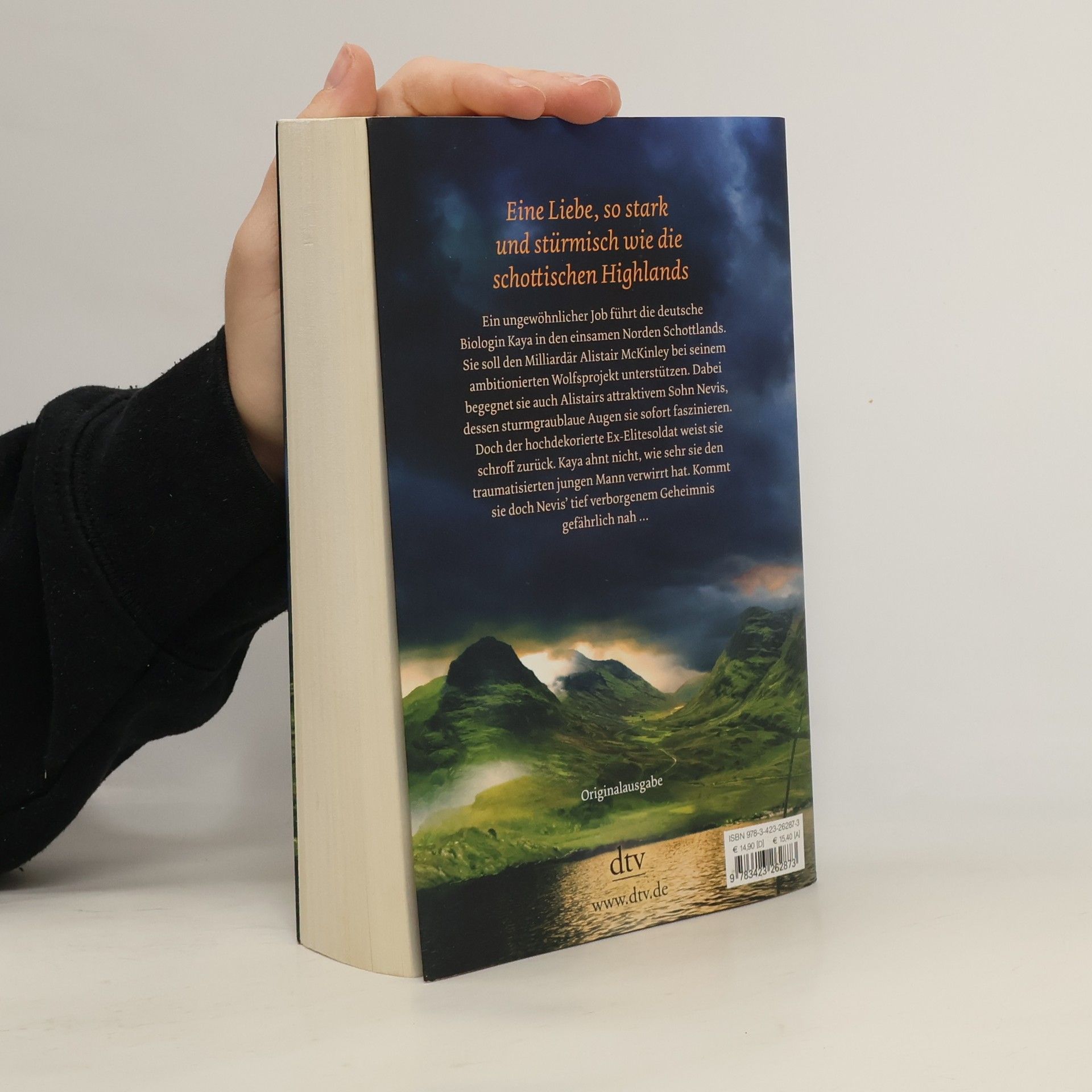 Sturmgraublaue Zeit der Liebe Die junge deutsche Wolfsforscherin Kaya wird von dem schottischen Milliardär Alistair MacKinley angestellt, um auf seinen Ländereien wilde Wölfe anzusiedeln. In dem einsamen Herrenhaus in den Highlands trifft sie auch auf den verschlossenen Nevis, Alistairs attraktiven Sohn, mit Augen wie das Sturmgraublau des schottischen Himmels. Der verwundete Ex-Elitesoldat soll sich von seinen schweren Kriegsverletzungen erholen. Doch er verweigert die Therapie und torpediert das Wolfsprojekt, wo er nur kann. Kaya ist wütend und fasziniert zugleich, ohne das tragische Ausmaß seines Zustands zu ahnen. Eine Zusammenarbeit mit Nevis endet katastrophal. Erst als sich beide ihrer Vergangenheit stellen, können sie ihre Liebe und ihre Zukunft retten.