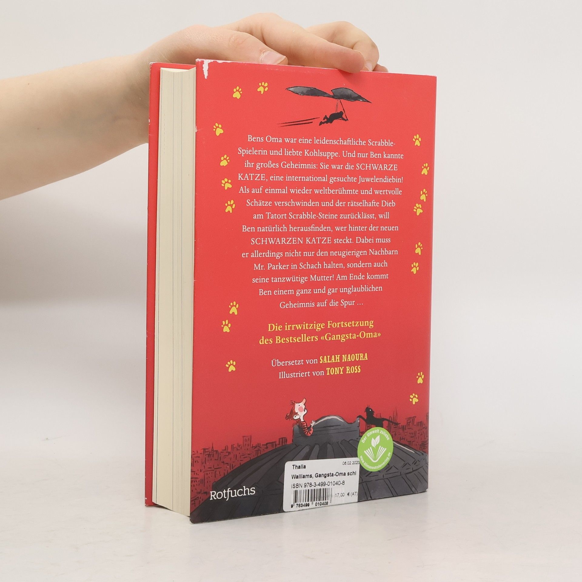 Gangsta-Oma ist wieder da! Für alle kleinen und großen Fans von David Walliams ein irrwitziges Lesevergnügen. Ben muss sich immer noch an das Leben ohne seine geliebte Oma gewöhnen. Sie war nicht nur verrückt nach Kohlsuppe und seine beste Scrabble-Partnerin, sondern außerdem eine internationale Juwelendiebin, bekannt als die Schwarze Katze. Niemals wird Ben ihr gemeinsames Abenteuer vergessen, als sie versuchten, die Kronjuwelen der englischen Königin zu stehlen. Plötzlich aber geschieht etwas Unerklärliches: Es werden weltberühmte Schätze gestohlen, und die Hinweise bei den Tatorten deuten auf niemand anderen als die Schwarze Katze hin! Aber wie ist das möglich ...? Ben ist entschlossen, das Geheimnis um die Rückkehr der Schwarzen Katze zu lüften. Dabei gerät er nicht nur ins Visier seines alten Erzfeindes Mr Parker, sondern erlebt mit seinem Freund, dem Kioskbesitzer Raj ein geradezu irrwitziges Abenteuer in der Londoner Nacht – und dabei kommen sie einem ganz und gar unglaublichen Geheimnis auf die Spur ... Für Jungen und Mädchen ab 10 Jahren