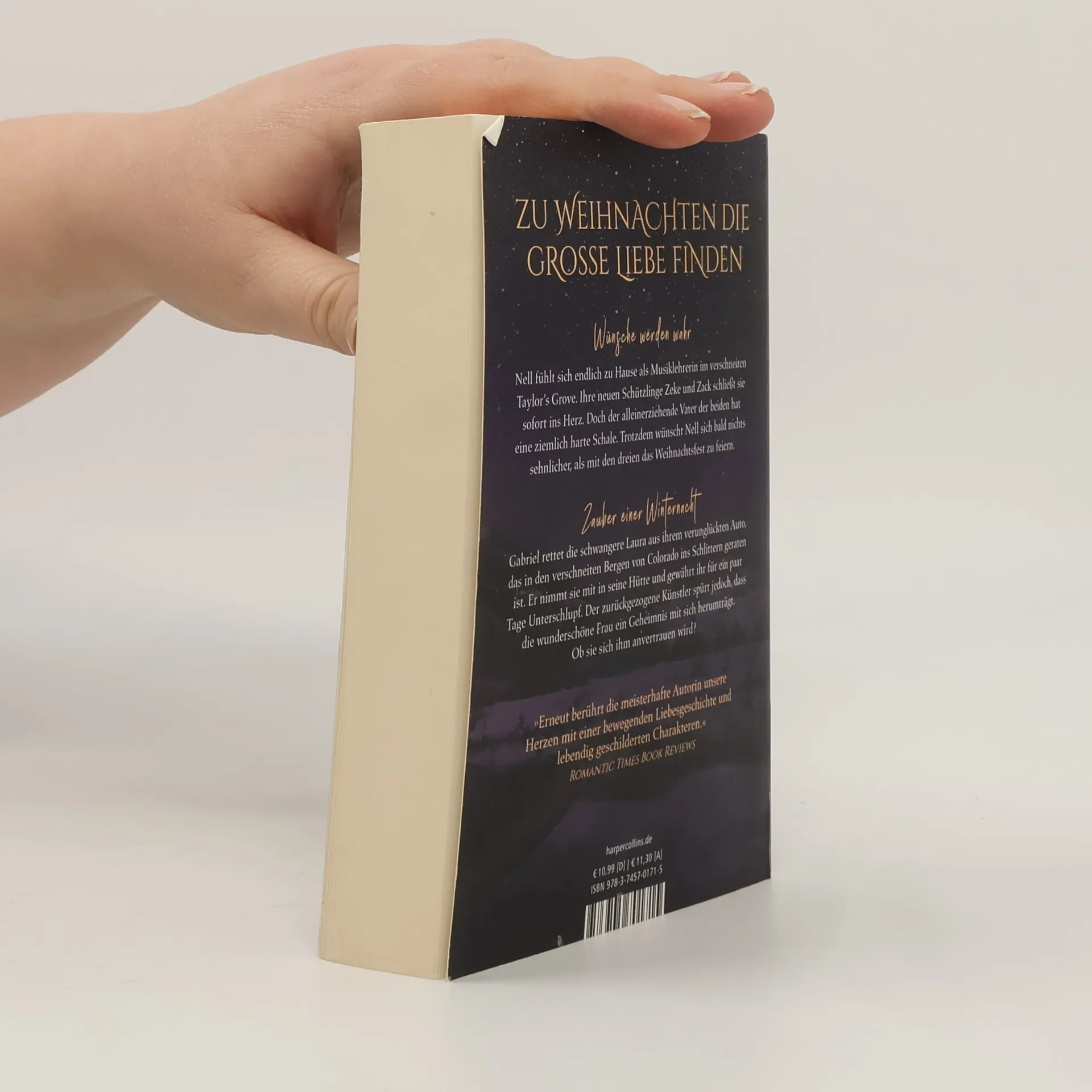 Zu Weihnachten die große Liebe finden Wünsche werden wahr Nell fühlt sich endlich zu Hause als Musiklehrerin im verschneiten Taylor’s Grove. Ihre neuen Schützlinge Zeke und Zack schließt sie sofort ins Herz. Doch der alleinerziehende Vater der beiden hat eine ziemlich harte Schale. Trotzdem wünscht Nell sich bald nichts sehnlicher, als mit den dreien das Weihnachtsfest zu feiern. Zauber einer Winternacht Gabriel rettet die schwangere Laura aus ihrem verunglückten Auto, das in den verschneiten Bergen von Colorado ins Schlittern geraten ist. Er nimmt sie mit in seine Hütte und gewährt ihr für ein paar Tage Unterschlupf. Der zurückgezogene Künstler spürt jedoch, dass die wunderschöne Frau ein Geheimnis mit sich herumträgt. Ob sie sich ihm anvertrauen wird? »Nora Roberts beschreibt ihre Charaktere warmherzig und mit einem sehr genauen Blick fürs Detail.« Chicago Tribune »Erneut berührt die meisterhafte Autorin unsere Herzen mit einer bewegenden Liebesgeschichte und lebendig geschilderten Charakteren.« Romantic Times Book Reviews