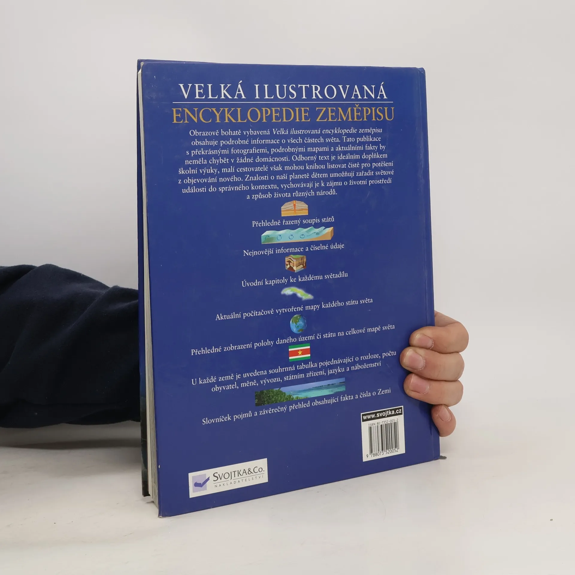 Tato publikace s překrásnými fotografiemi, podrobnými mapami a aktuálními fakty by neměla chybět v žádné domácnosti. Odborný text je ideálním doplňkem školní výuky, malí cestovatelé však mohou knihou listovat čistě pro potěšení z objevování nového. Znalosti o naší planetě dětem umožňují zařadit světové události do správného kontextu, vychovávají je k zájmu o životní prostředí a způsob života různých národů. Aktuální počítačově vytvořené mapy každého státu světa. Přehledné zobrazení polohy daného území či státu na celkové mapě světa. U každé země je uvedena souhrnná tabulka pojednávající o rozloze, počtu obyvatel, měně, vývozu, státním zřízení, jazyku a náboženství.