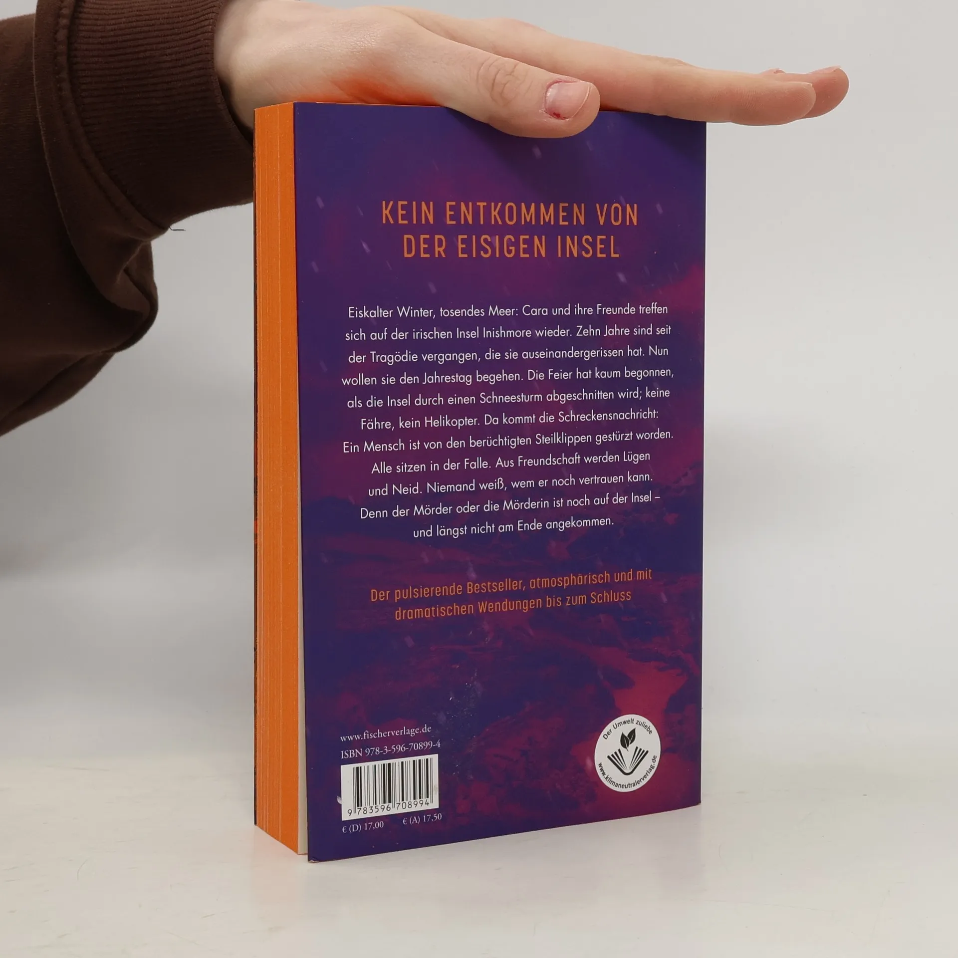 Der atmosphärische Bestseller mit dramatischen Wendungen bis zum Schluss. Eiskalter Winter, tosendes Meer: Cara und ihre Freunde treffen sich auf der irischen Insel Inishmore wieder. Zehn Jahre sind seit der Tragödie vergangen, die sie auseinandergerissen hat. Nun wollen sie den Jahrestag begehen. Die Feier hat kaum begonnen, als die Insel durch einen Schneesturm abgeschnitten wird; keine Fähre, kein Helikopter. Da kommt die Schreckensnachricht: Ein Mensch wurde von den berüchtigten Steilklippen gestürzt. Alle sitzen in der Falle. Die Freundschaft weicht Feindseligkeit, Lügen und Neid. Denn der Mörder oder die Mörderin ist noch auf der Insel – und längst nicht am Ende angekommen.