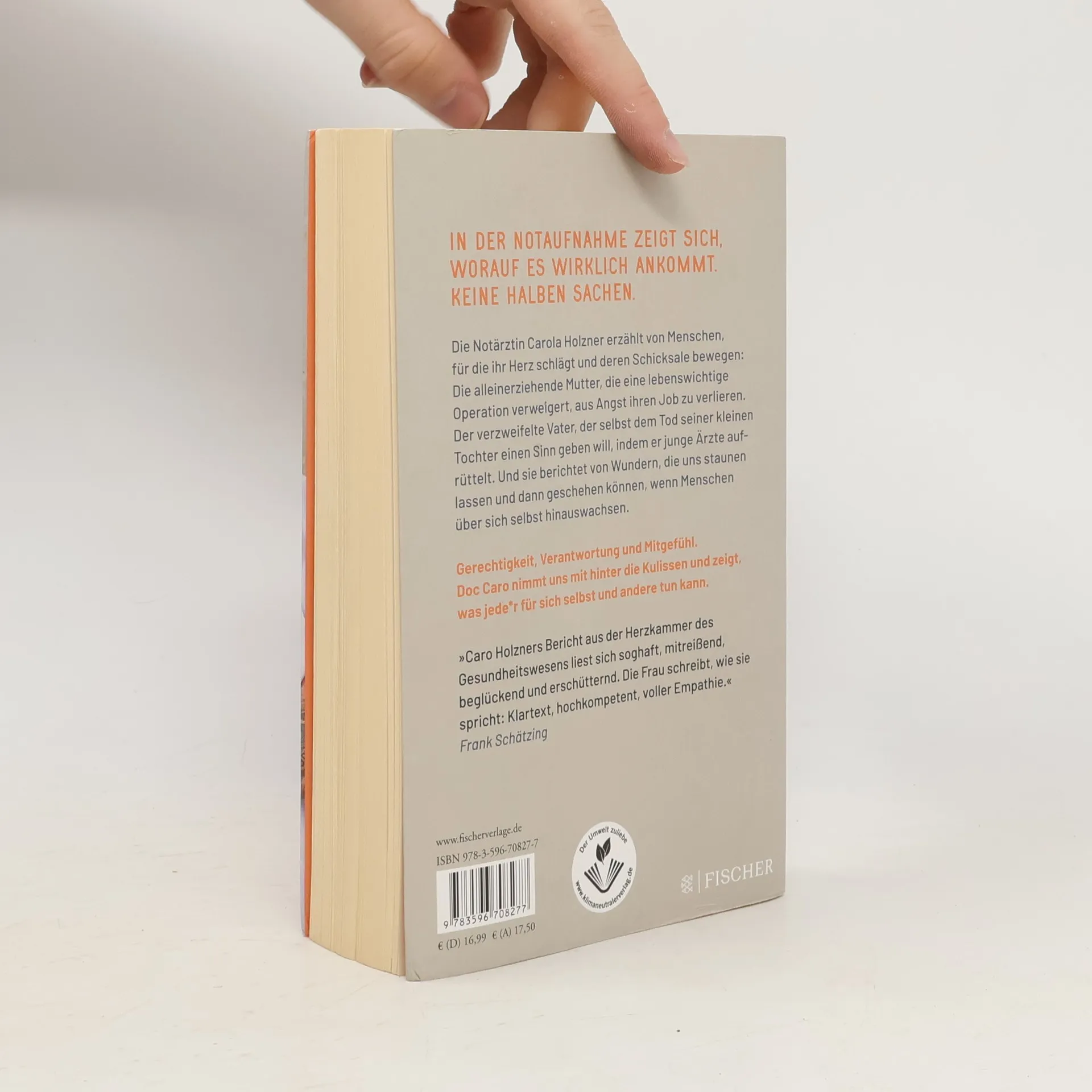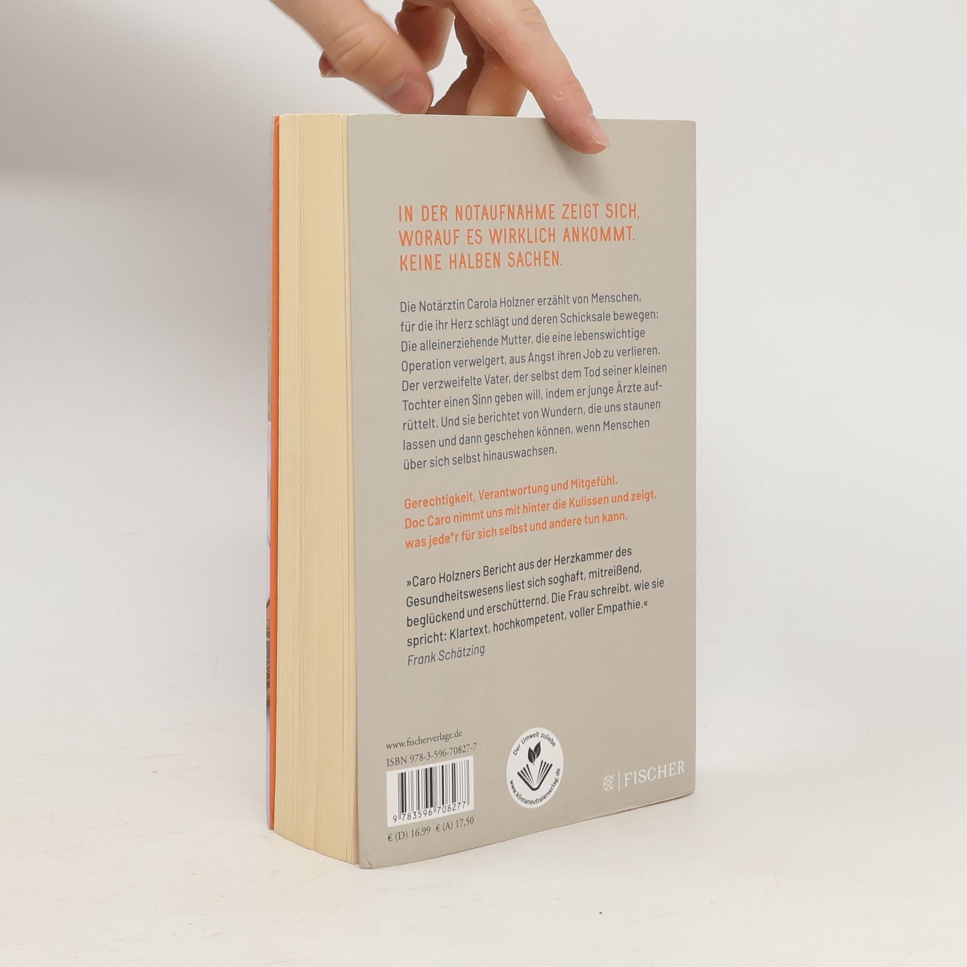 In der Notaufnahme zeigt sich, worauf es wirklich ankommt! Sie verändert den Blick aufs Leben. Keine halben Sachen. Die Notärztin Carola Holzner spricht Klartext. Dabei bleibt sie immer sie selbst mit Blick auf die, für die ihr Herz schlägt: ihre Patientinnen und Patienten und deren Schicksale. Sie berichtet von Menschen, die alle auf ihre Art bewegen: Die alleinerziehende Mutter, die eine lebenswichtige Operation verweigert, aus Angst ihren Job zu verlieren. Der verzweifelte Vater, der selbst dem Tod seiner kleinen Tochter einen Sinn geben will, indem er junge Ärzte aufrüttelt. Und sie berichtet von Wundern, die uns staunen lassen und dann geschehen können, wenn Menschen über sich selbst hinauswachsen. Denn das Leben schreibt immer noch die besten Geschichten. Gerechtigkeit, Verantwortung und Mitgefühl. In der Notaufnahme stellen sich die wichtigen Fragen des Lebens. Doc Caro nimmt uns mit hinter die Kulissen und zeigt, dass jede/r Einzelne für sich selbst und andere etwas tun kann. Wer noch mehr von Doc Caro lesen möchte: »Eine für alle. Als Notärztin zwischen Hoffnung und Wirklichkeit«