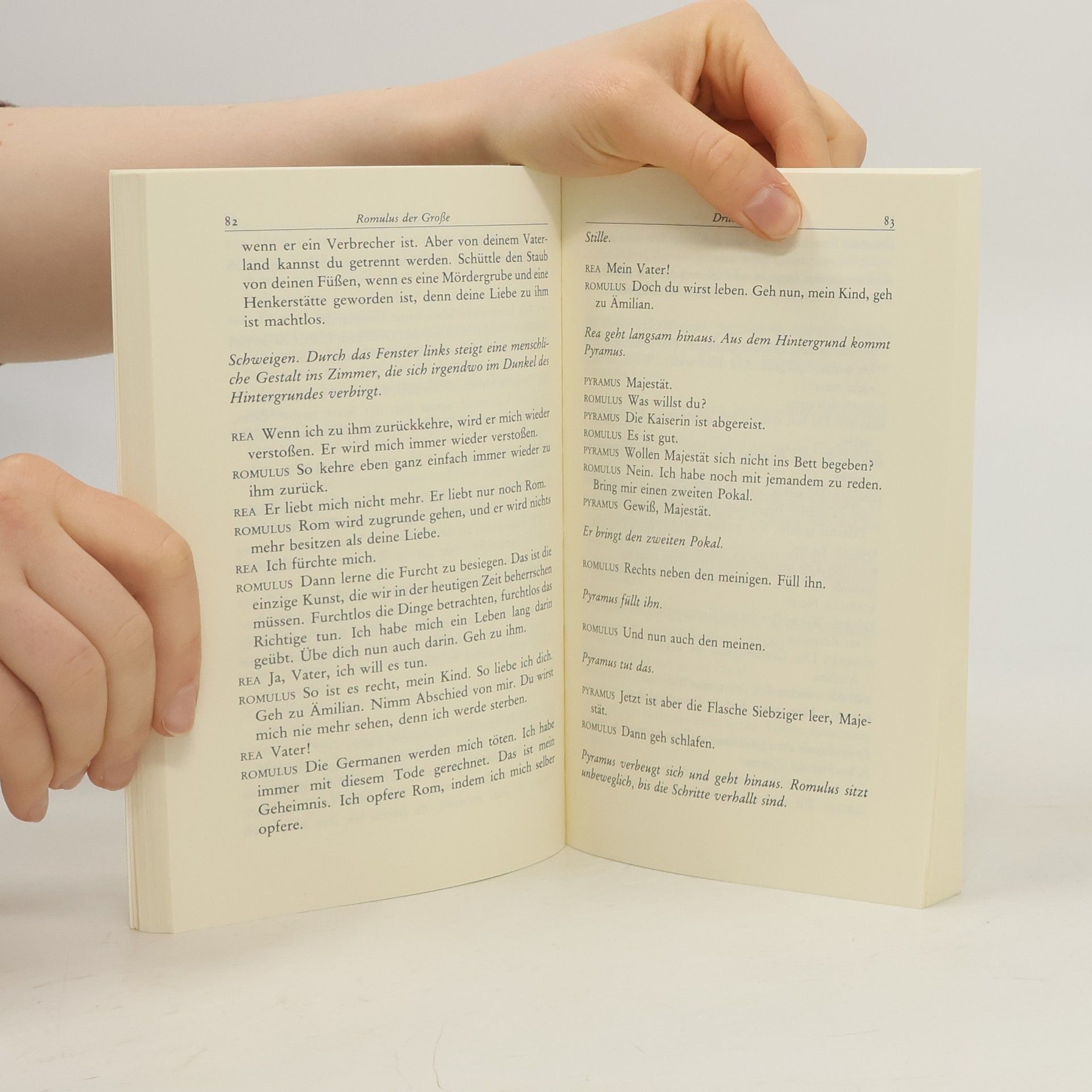 Eine ungeschichtliche historische Komödie in vier Akten»Kaiser Romulus Augustus hält das römische Weltreich für unmoralisch und will es als ›Richter Roms‹ liquidieren, indem er 467 n. Chr. tatenlos die einmarschierenden Germanen erwartet. Germanenfürst Odoaker freilich, ein leidenschaftlicher Hühnerzüchter wie Romulus, hat keinen sehnlicheren Wunsch als sich zu unterwerfen, um zu verhindern, daß die Germanen ›endgültig ein Volk der Helden‹ werden.«