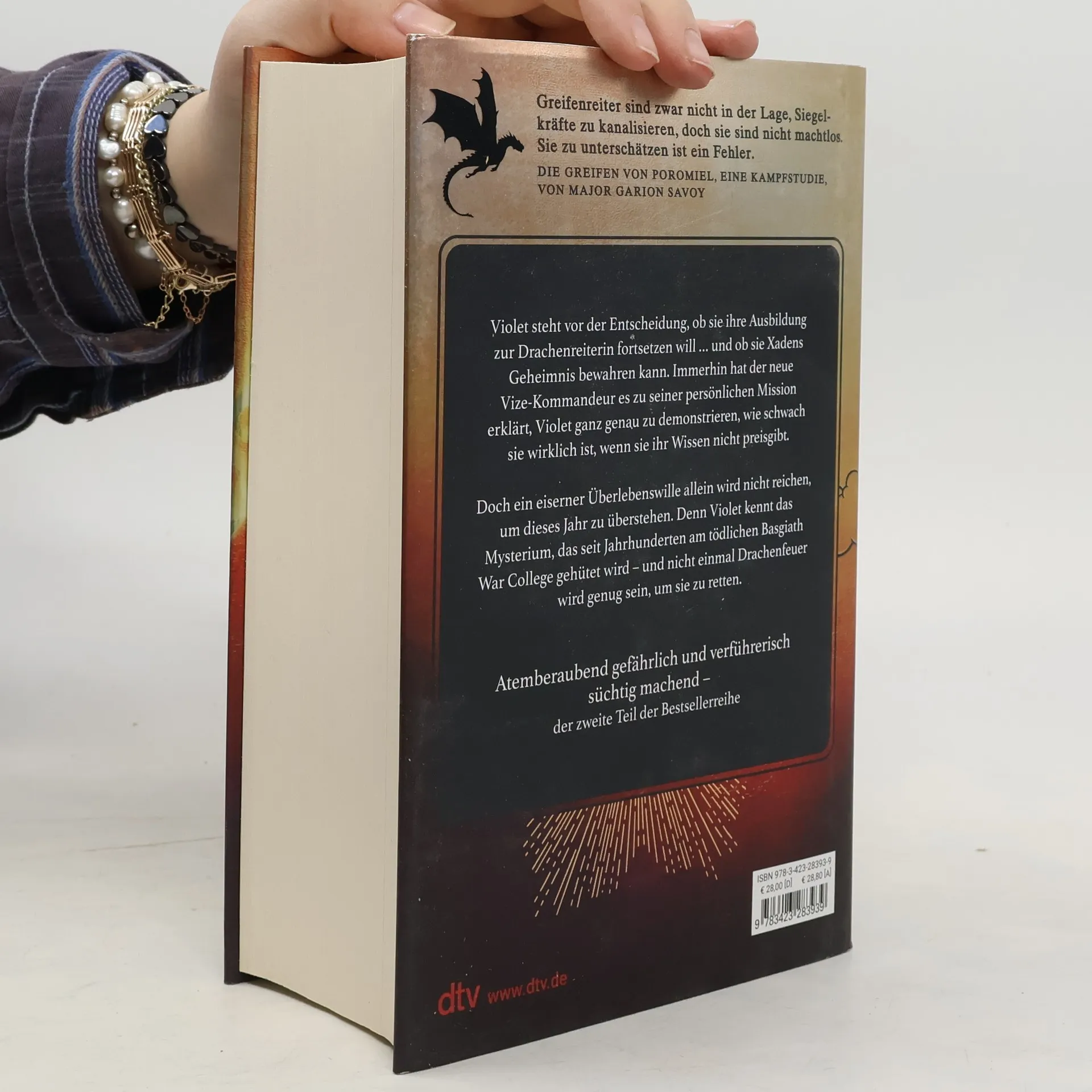 Wem kannst du vertrauen, wenn der größte Verräter dein eigenes Herz ist? In wunderschöner Ausstattung mit veredeltem Schutzumschlag, gestaltetem Einband und farbigen Karten im Innenteil. Jetzt fast 1000 Seiten spannendes Lesevergnügen! mit hochveredeltem Schutzumschlag mit gestaltetem und bedrucktem Einband mit farbigen Karten im Innenteil mit bedrucktem Vor- und Nachsatz Violet muss entscheiden, ob sie ans tödliche Basgiath War College zurückkehren will … und inwieweit sie Xaden vertrauen kann. Alle hatten erwartet, dass Violet Sorrengail während ihres ersten Jahres am Basgiath War College sterben würde – Violet eingeschlossen. Doch sie hat überlebt. Das richtige Training beginnt erst jetzt und Violet fragt sich, wie sie das überstehen soll. Die Herausforderungen sind zermürbend, extrem brutal und dafür gedacht, die Schmerzgrenze der Reiter ins Unermessliche zu treiben, aber das größte Problem ist der neue Vizekommandeur, der Violet brechen will – es sei denn, sie hintergeht den Mann, den sie liebt. Auch wenn Violets Körper schwächer und fragiler ist, hat sie immer noch ihren Verstand – und ihren eisernen Willen. Und die wichtigste Lektion, die sie bisher gelernt hat, scheinen alle anderen zu vergessen: Drachenreiter machen ihre eigenen Regeln ... Dieses Buch gibt es auch in einer Ausgabe mit Farbschnitt (EAN 9783423283830). Alle Bände der Flammengeküsst-Reihe: Band 1: Fourth Wing Band 2: Iron Flame Band 3: Onyx Storm (erscheint am 21. Januar 2025, jetzt vorbestellen) Die Bände sind nicht unabhängig voneinander lesbar. »Rebecca Yarros hat großartige Drachen erschaffen! Stolz, schön und voll einzigartiger Magie .« Christopher Paolini »Eine Fantasy, wie man sie noch nie gelesen hat.« Jennifer L. Armentrout »Unwiderstehliches Abenteuer trifft epische Liebesgeschichte .« Tracy Wolff »Ein Buch, das mich den Schlaf gekostet hat. Ich konnte nicht aufhören! « Millie Bobby Brown