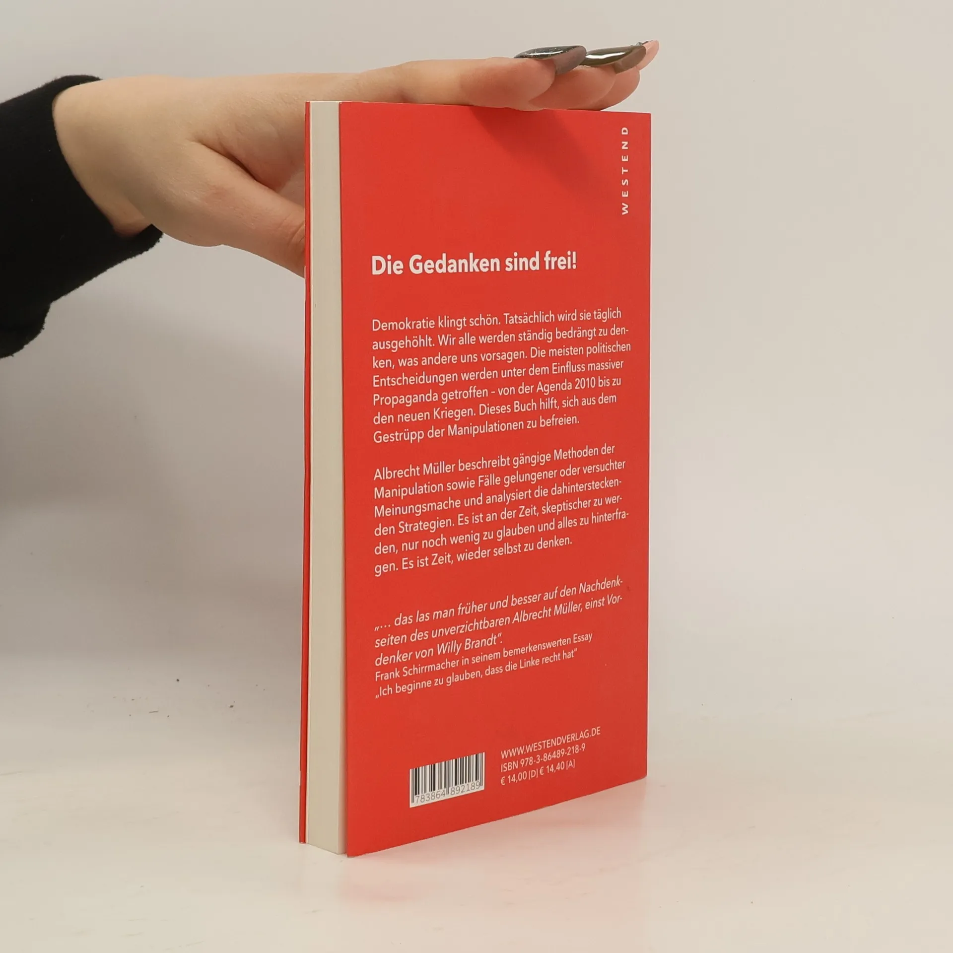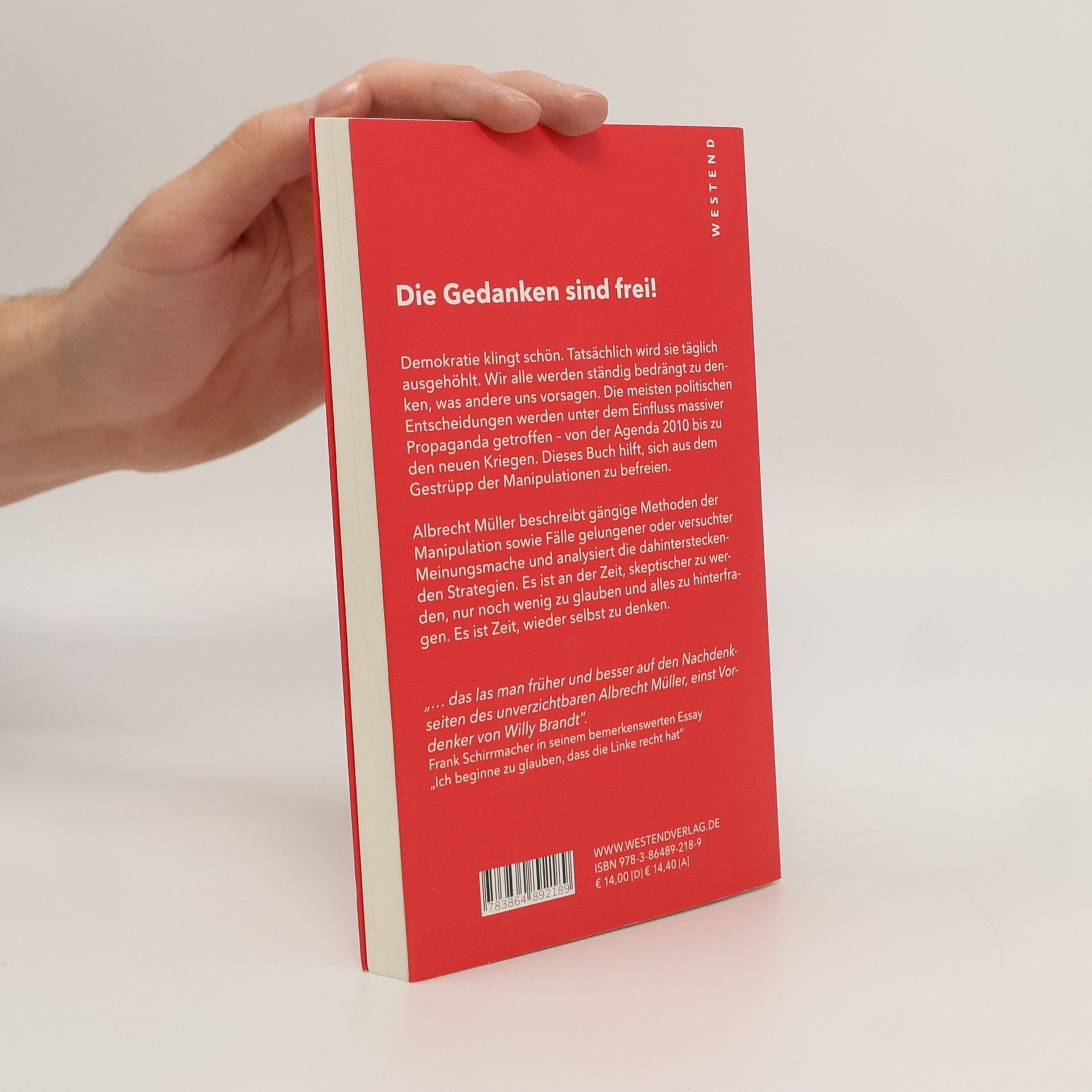 Demokratie klingt schön. Tatsächlich wird sie täglich ausgehöhlt. Wir alle werden ständig bedrängt zu denken, was andere uns vorsagen. Die meisten politischen Entscheidungen werden unter dem Einfluss massiver Propaganda getroffen - von der Agenda 2010 bis zu den neuen Kriegen. Dieses Buch hilft, sich aus dem Gestrüpp der Manipulationen zu befreien. Albrecht Müller beschreibt gängige Methoden der Manipulation sowie Fälle gelungener oder versuchter Meinungsmache und analysiert die dahintersteckenden Strategien. Es ist an der Zeit, skeptischer zu werden, nur noch wenig zu glauben und alles zu hinterfragen. Es ist Zeit, wieder selbst zu denken.