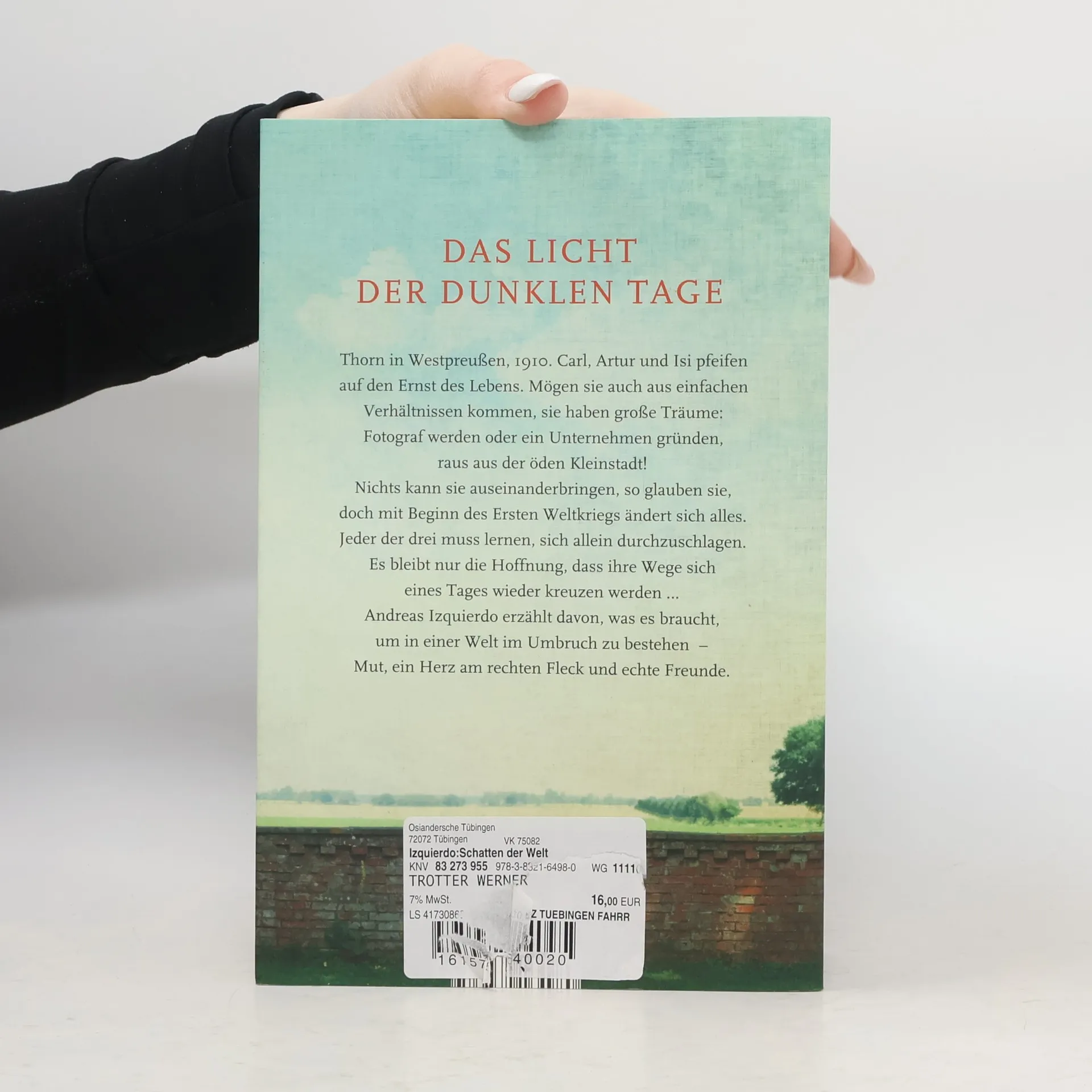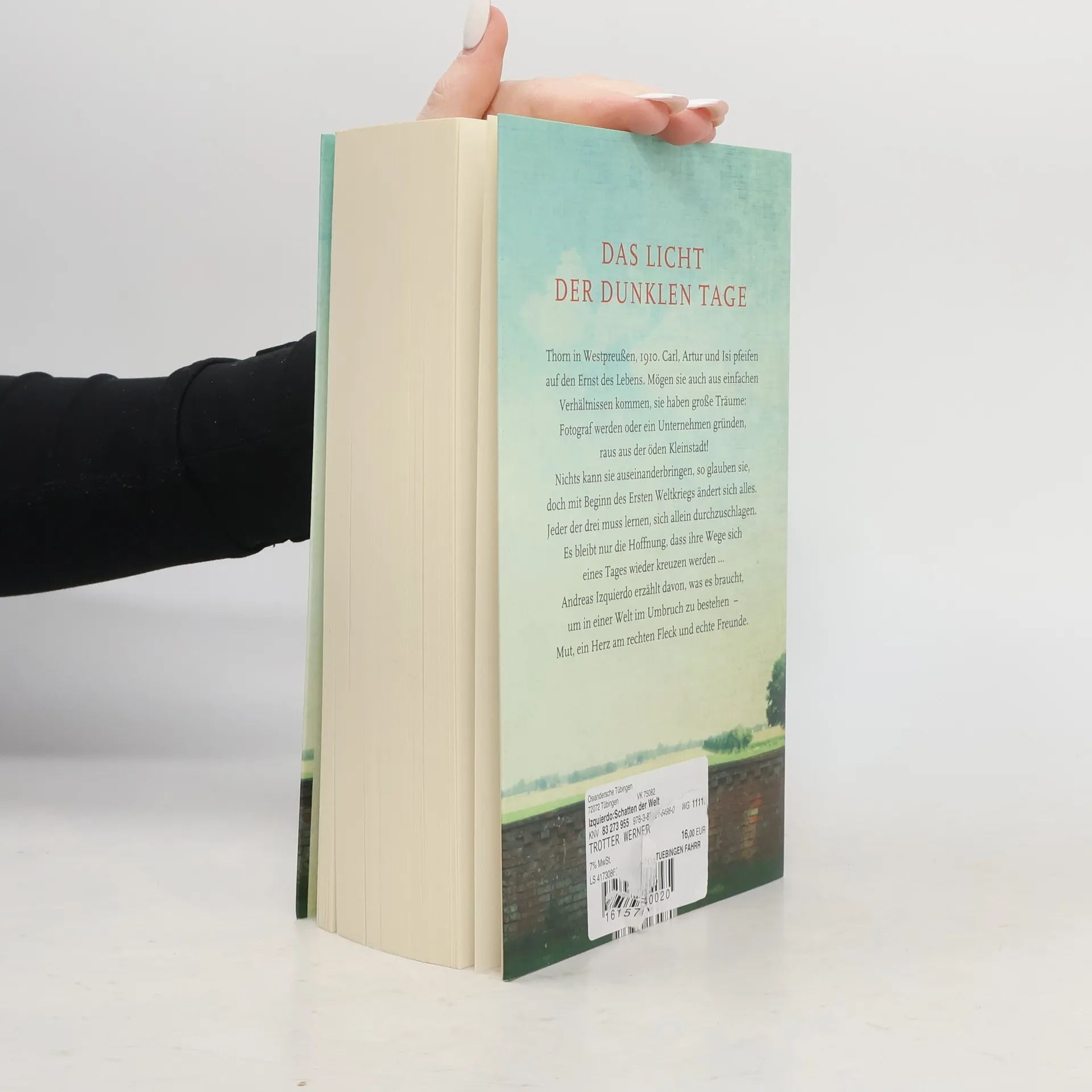 Thorn in Westpreußen, 1910. Der schüchterne Carl, der draufgängerische Artur und die freche Isi sind frohen Mutes, dass der Ernst des Lebens noch ein wenig auf sich warten lässt. Nicht einmal die Nachricht, dass ein Komet namens »Halley« die Menschheit zu vernichten droht, kann die drei Jugendlichen schockieren. Im Gegenteil – ungerührt verkaufen sie Pillen gegen den Weltuntergang, während Halley still vorbeizieht. Doch das Erwachsenwerden lässt sich nicht aufhalten: Carl beginnt eine Ausbildung zum Fotografen, Artur und Isi werden ein Paar. Als 1914 die große Weltpolitik über sie hineinbricht, reißt es die Freunde auseinander. Artur und Carl werden eingezogen, fernab der Heimat werden die beiden Teil eines Kriegs, der jede Vorstellungskraft sprengt. Derweil hat Isi zuhause in Thorn ganz andere Kämpfe auszufechten. 1918 ist der Krieg endlich vorbei. Nichts ist geblieben, wie es einmal war – und doch scheint ein Neuanfang möglich ... Mitreißend und mit viel Gefühl für seine Figuren erzählt Andreas Izquierdo die Geschichte dreier Jugendlicher, die in den Wirren des frühen 20. Jahrhunderts ihren Weg suchen. ›Schatten der Welt‹ ist Abenteuerroman, Coming-of-Age-Geschichte und spannender historischer Roman zugleich.