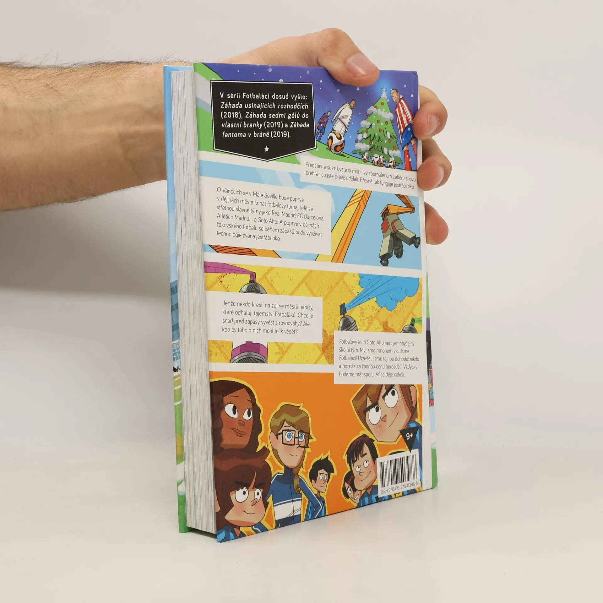 Představte si, že byste si mohli ve zpomaleném záběru znovu přehrát, co jste právě udělali. Přesně tak funguje jestřábí oko. O Vánocích se v Malé Seville bude poprvé v dějinách města konat fotbalový turnaj, kde se střetnou slavné týmy jako Real Madrid, FC Barcelona, Atlético Madrid… A Soto Alto! A poprvé v dějinách žákovského fotbalu se během zápasů bude využívat technologie zvaná jestřábí oko. Jenže někdo zaplňuje zdi ve městě graffiti, která odhalují soukromí Fotbaláků. Chce je snad vyvést z rovnováhy? Ale kdo by toho o nich mohl tolik vědět? Fotbaláci jsou vtipná, poutavě napsaná ilustrovaná série, která vypráví o odhodlání, přátelství a spolupráci. Rozhodně bude bavit i ty, kdo fotbal nehrají, ale pokud fotbal miluješ, je to knížka pro tebe!