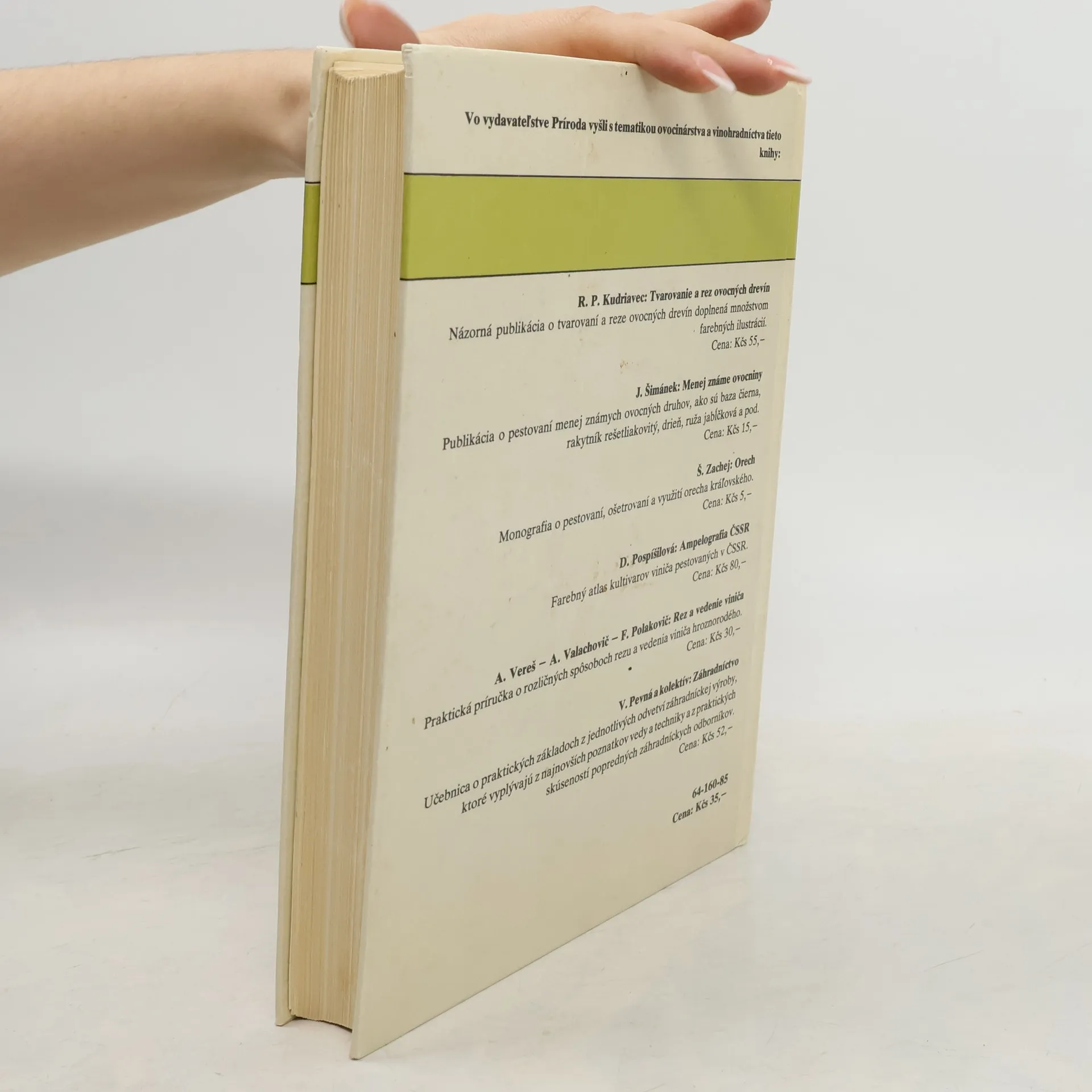 Kapitoly: Podmienky ovocinárskej výroby v ČSSR, Ovocné rastliny a prostredie, Biologické základy ovocinárstva, Technológia výroby ovocného sadiva, Pestovanie ovocných rastlín na trvalom stanovišti, Rez a tvarovanie ovocných rastlín, Agrotechnické opatrenia v ovocných výsadbách, Spôsoby ovocinárenia, Pestovanie netradičných druhov ovocia, Pestovateľská pomológia, Ekonomika a organizácia ovocinárstva. Cena knihy v čase vydania: 35 Kčs.