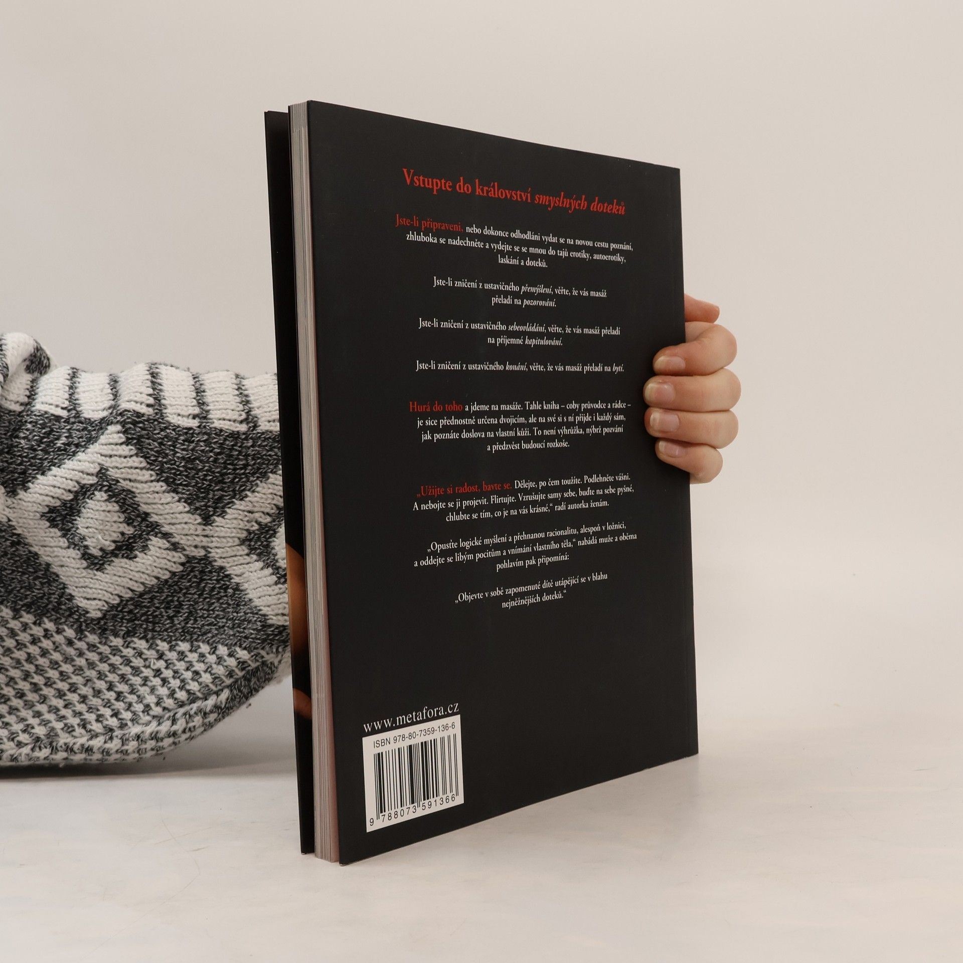 Jste-li připraveni vydat se na novou cestu poznání, zhluboka se nadechněte a vydejte se s naší nejnovější publikací do tajů erotiky, autoerotiky, laskání a doteků. Hurá do toho a jdeme na masáže. Tahle kniha – coby průvodce a rádce - je sice přednostně určena dvojicím, ale na své si s ní přijde i každý sám. Líbí se vám drsnější a razantnější zacházení? Nebo máte raději jemnost a něhu? Ať už je to cokoli, každopádně si vyberete. Nezáleží na tom, jaký způsob upřednostňujete – rychlý, pomalý, divoký či smyslný –, tím, čeho nebudete mít nikdy dost, jsou doteky. Od elektrizujících masáží přejdete k závratnému laskání ústy, načež vás autorka a vynikající „profesorka“ sexu Charla Hathawayová naučí probudit nejen svá vlastní centra rozkoše, ale samozřejmě i partnerova. Je tak jednoduché přejít od teorie k praxi...
