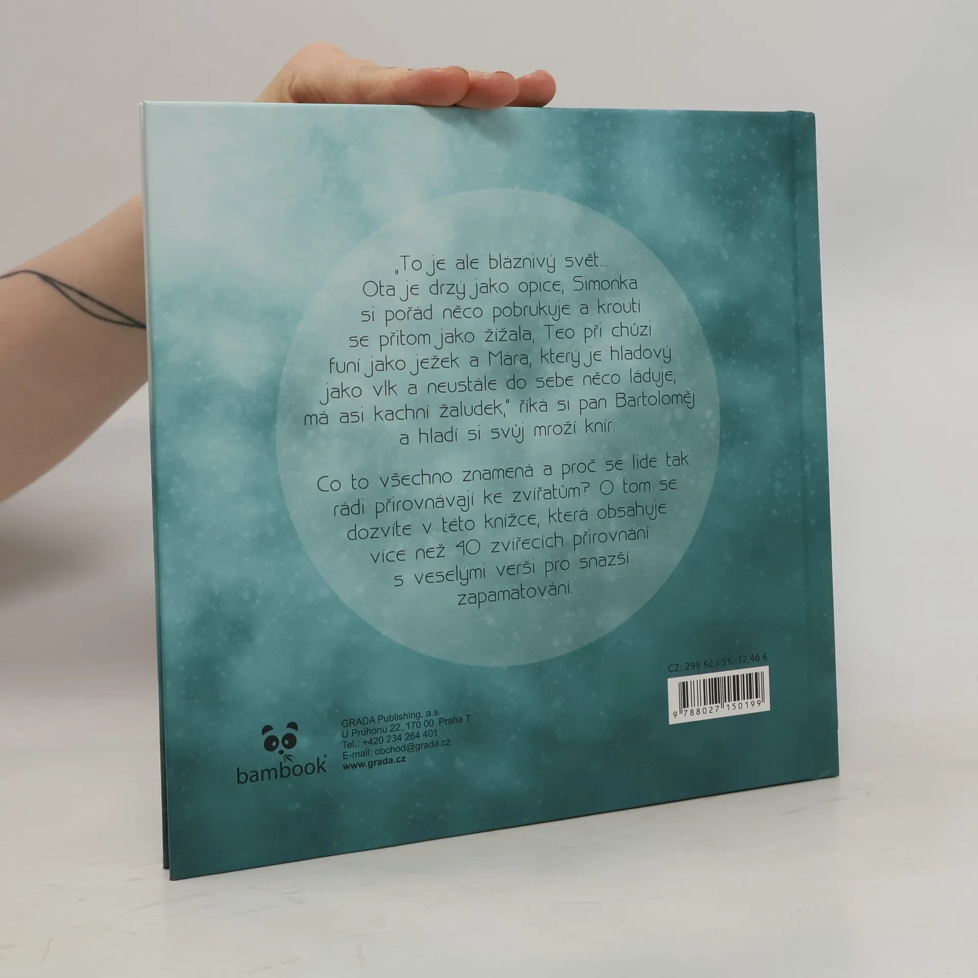 „To je ale bláznivý svět…Ota je drzý jako opice, Simonka si pořád něco pobrukuje a kroutí se přitom jako žížala, Teo při chůzi funí jako ježek a Mára, který je hladový jako vlk a neustále do sebe něco láduje, má asi kachní žaludek,“ říká si pan Bartoloměj a hladí si svůj mroží knír. Co to všechno znamená a proč se lidé tak rádi přirovnávají ke zvířatům? O tom se dozvíte v této knížce, která obsahuje více než 40 zvířecích přirovnání s veselými verši pro snazší zapamatování.