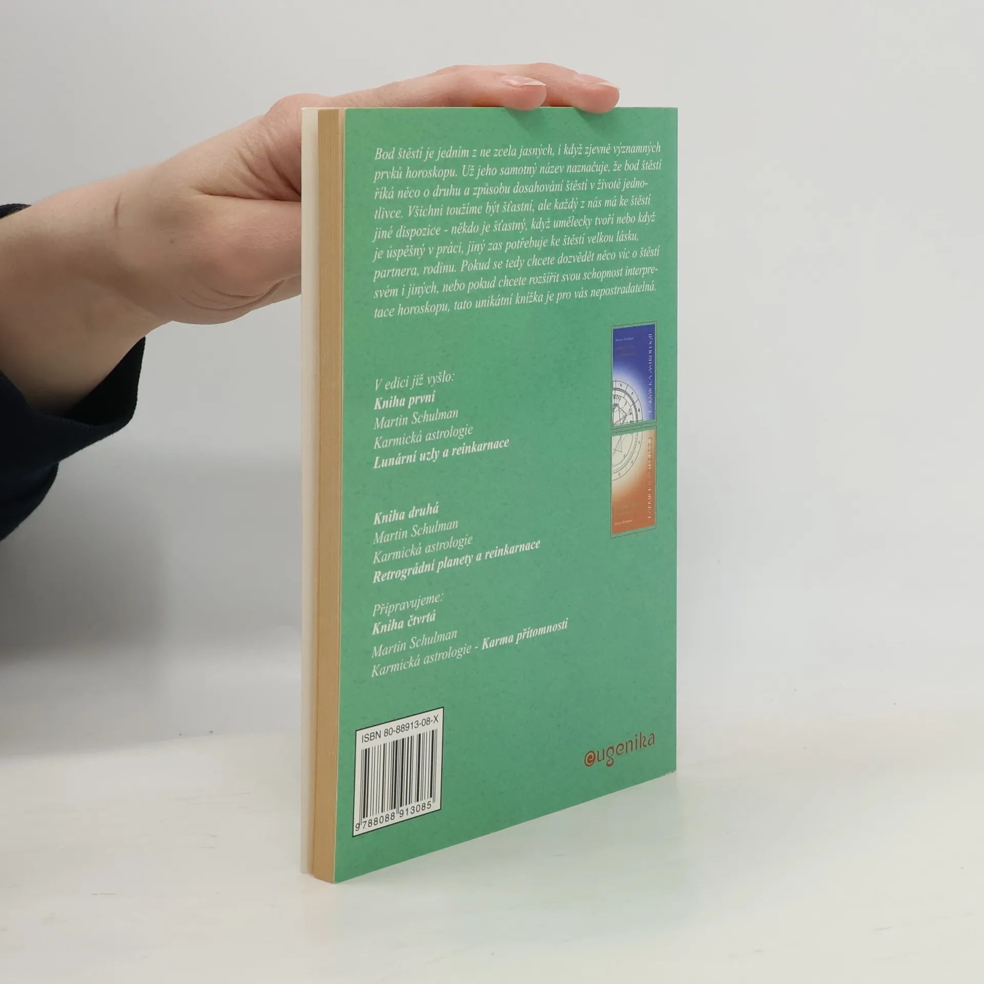 Martin Schulman je jedním z nejpozoruhodnějších astrologů současnosti. Vlivy či vlastnosti naznačené jednotlivými prvky horoskopu chápe jako potenciál, jehož cílem není nic menšího než dovést jedince k osvícení, naplnění poslání a vyčištění karmy. Severní lunární uzel určujě směr nového vývoje. Dům a znamení, kde se nachází, odhalují, co by měl člověk v tomto životě rozvíjet. Jižní lunární uzel naopak znamená, nač je zvyklý a čeho se nechce vzdát, čeho se však vzdát musí ve prospěch opačného přístupu, symbolizovaného uzlem severním. Když je planeta retrográdní, má to zvláštní význam. Každá je podrobně analyzovaná ve všech znameních i domech: co symbolizuje, jak utváří osobnost a jakou karmu představuje. Velmi důležitý je bod štěstí. Podrobně se zde vysvětluje jeho význam nejprve ve všeobecnosti a potom konkrétně podle postavení v horoskopu v domech a znameních; rovněž analyzuje jeho aspekty. Karma přítomnosti představuje zvláštní výklad všech planet: podle toho, jak nás motivují k pozitivnímu vnímání a jednání; k tomu, abychom naplnili své potřeby a zaujali své místo ve světě s plnou odpovědností za svůj život.