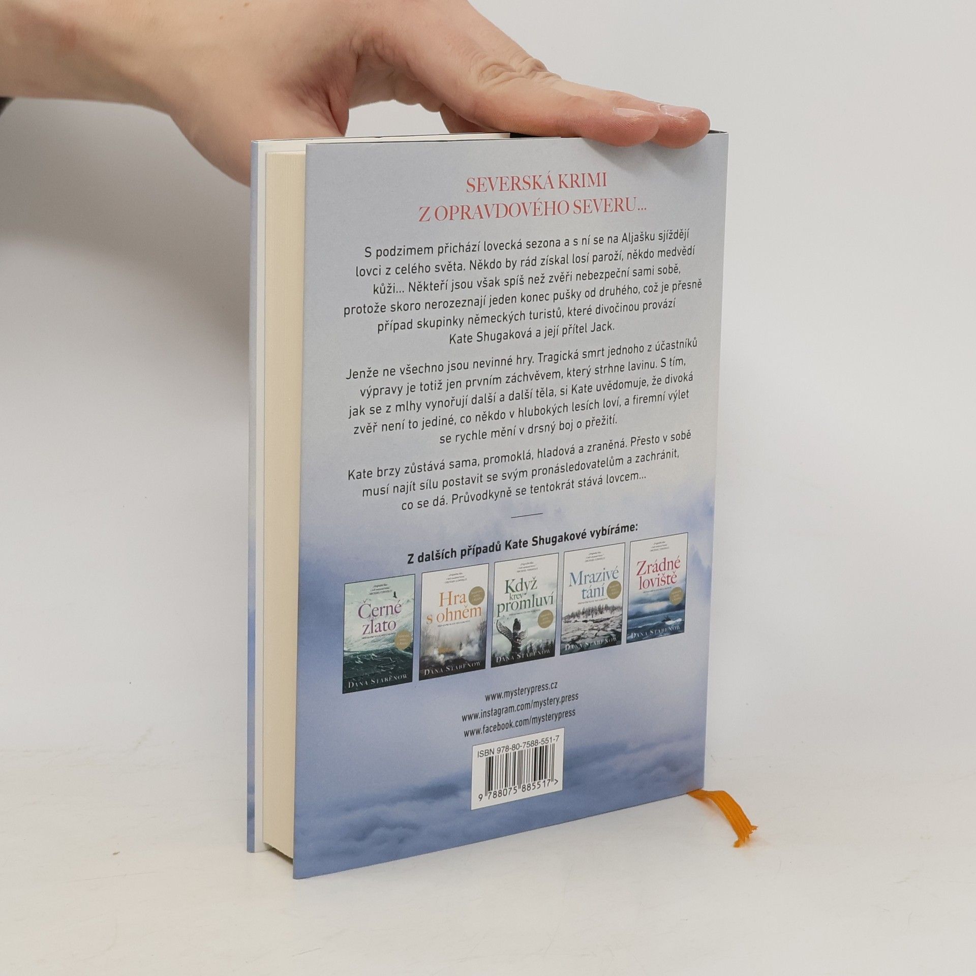 SEVERSKÁ KRIMI Z OPRAVDOVÉHO SEVERU… S podzimem přichází lovecká sezona a s ní se na Aljašku sjíždějí lovci z celého světa. Někdo by rád získal losí paroží, někdo medvědí kůži… Někteří jsou však spíš než zvěři nebezpeční sami sobě, protože skoro nerozeznají jeden konec pušky od druhého, což je přesně případ skupinky německých turistů, které divočinou provází Kate Shugaková a její přítel Jack. Jenže ne všechno jsou nevinné hry. Tragická smrt jednoho z účastníků výpravy je totiž jen prvním záchvěvem, který strhne lavinu. S tím, jak se z mlhy vynořují další a další těla, si Kate uvědomuje, že divoká zvěř není to jediné, co někdo v hlubokých lesích loví, a firemní výlet se rychle mění v drsný boj o přežití. Kate brzy zůstává sama, promoklá, hladová a zraněná. Přesto v sobě musí najít sílu postavit se svým pronásledovatelům a zachránit, co se dá. Průvodkyně se tentokrát stává lovcem…