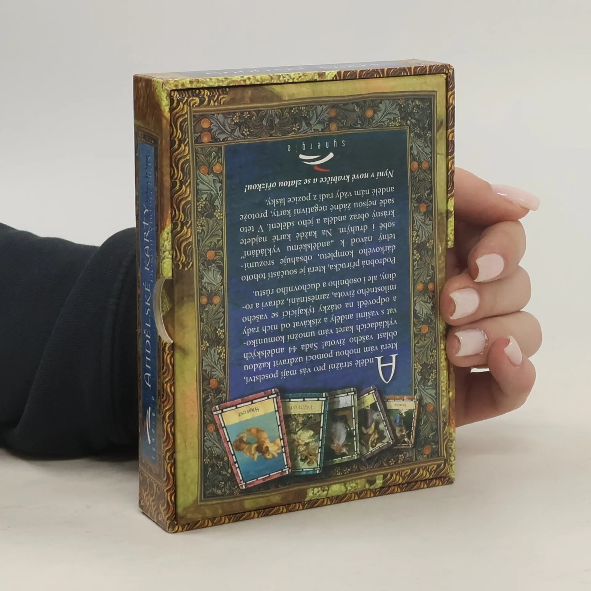 Sada 44 andělských vykládacích karet vám pomůže komunikovat s vašimi anděly a získat od nich rady a odpovědi na otázky týkající se vašeho milostného života, zaměstnání, zdraví a rodiny, ale i osobního a duchovního růstu. Podrobná příručka, která je součástí tohoto dárkového kompletu, obsahuje srozumitelný návod k "andělskému vykládání" sobě i druhým. Na každé kartě je krásný obraz anděla a jeho sdělení. V této sadě nejsou žádné negativní karty, protože andělé nám vždy radí z pozice lásky.