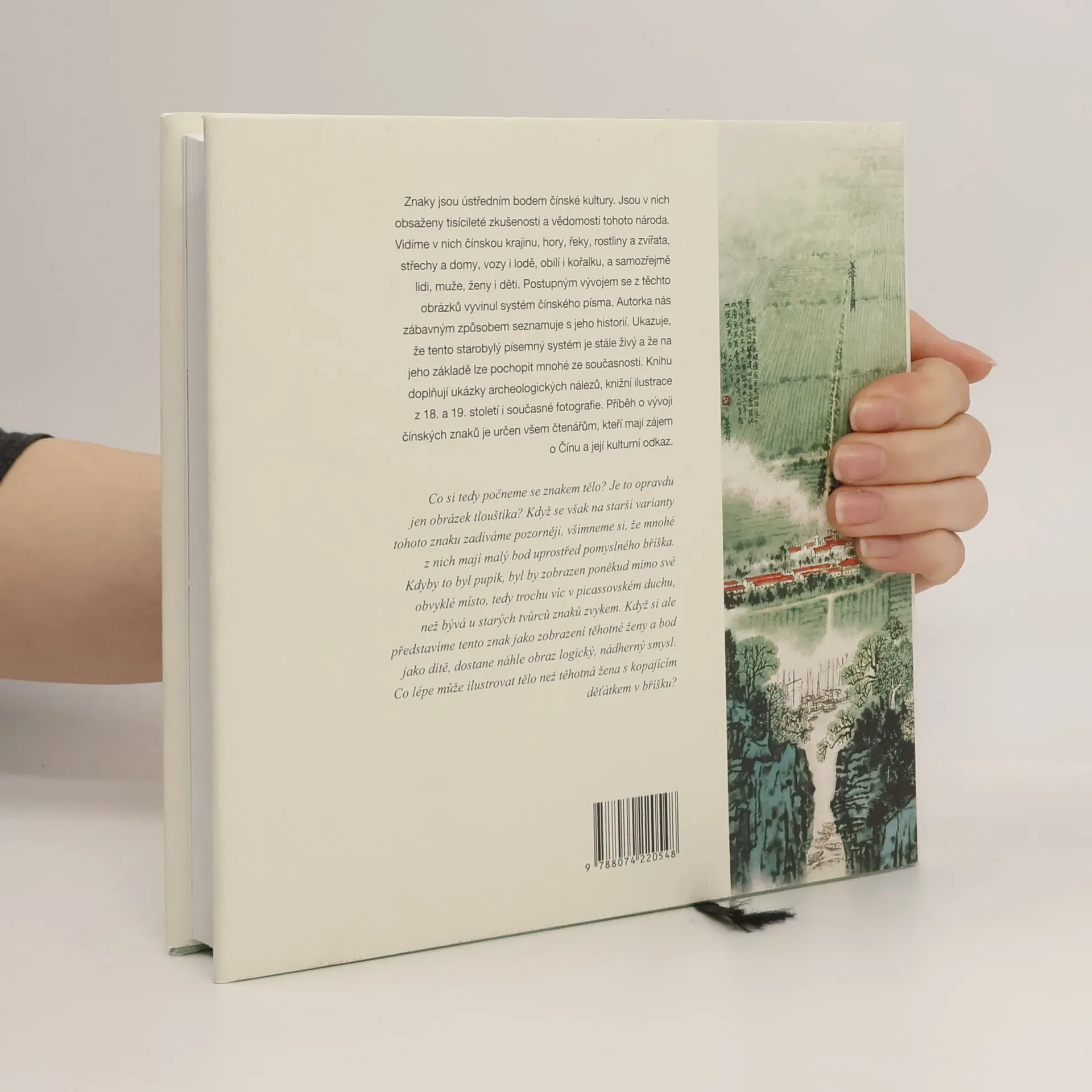 Překlad populární práce zabývající se vývojem čínského znakového písma. Autorka, lingvistka a vysokoškolská učitelka čínštiny, snadno uchopitelnou formou seznamuje čtenáře se složitou historií čínského písemného systému. Vysvětluje vznik a vývoj několika desítek nejpoužívanějších znaků, které navíc vztahuje k sociálním a kulturním dějinám Číny. Ukazuje, že tento starobylý písemný systém je stále živý a lze na jeho základě pochopit i mnohé skutečnosti současné čínské kultury a společnosti. Jako vynikající pedagog dokáže stručně, jasně a zábavně osvětlit i komplikované jevy. Tato práce je vhodná pro zájemce o čínskou kulturu a historii.