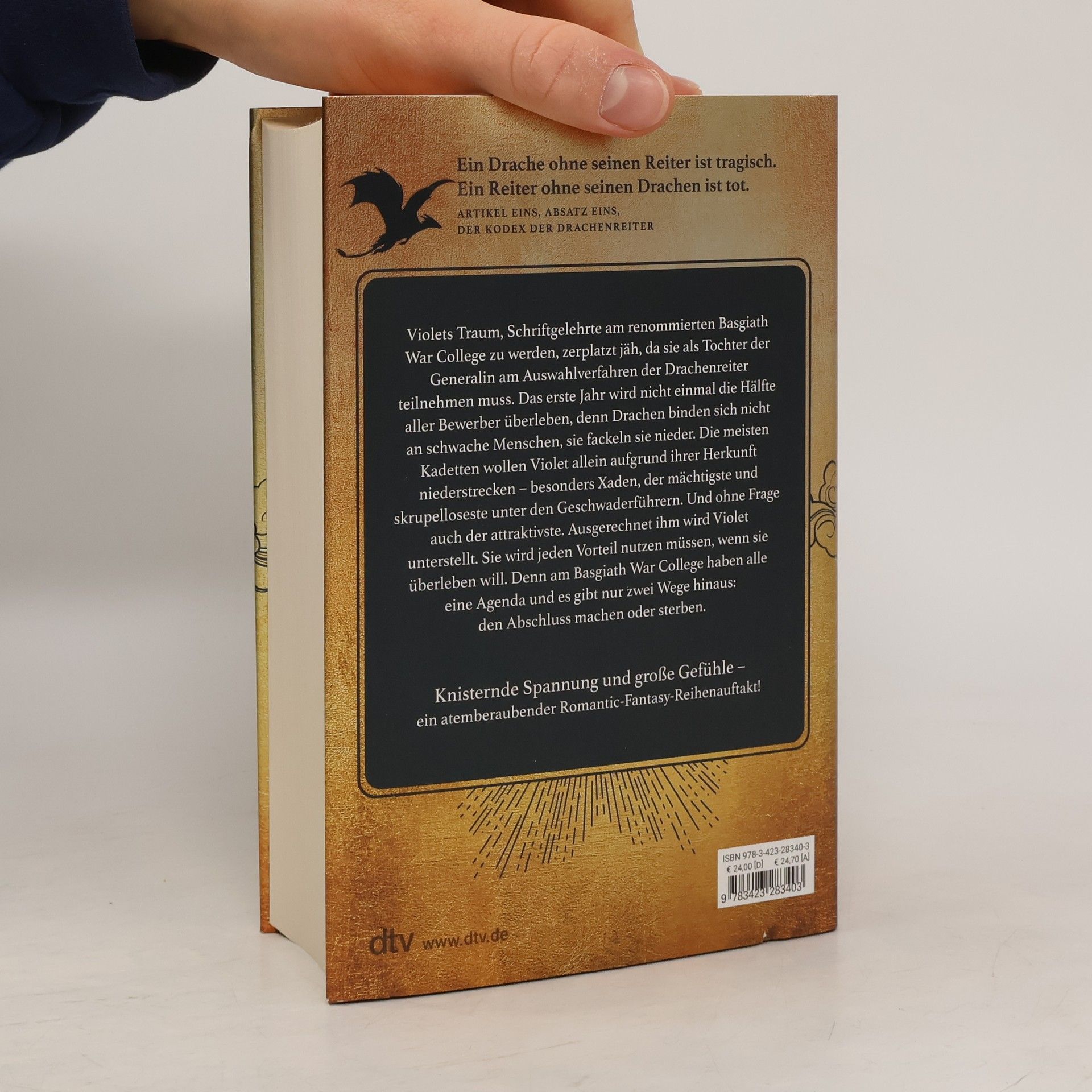 Ein Drache ohne seinen Reiter ist tragisch. Ein Reiter ohne seinen Drachen ist tot. In wunderschöner, hochwertiger Ausstattung mit aufwendig veredeltem Schutzumschlag, gestaltetem Einband und farbigen Karten im Innenteil. Knisternde Spannung und große Gefühle – ein atemberaubender Romantic-Fantasy-Reihenauftakt! Perfekt für alle Fans von Jennifer L. Armentrout, Naomi Novik und Sarah J. Maas. Violets Traum, Schriftgelehrte am renommierten Basgiath War College zu werden, zerplatzt jäh, da sie als Tochter der Generalin am Auswahlverfahren der Drachenreiter teilnehmen muss. Das erste Jahr wird nicht einmal die Hälfte aller Bewerber überleben, denn Drachen binden keine schwachen Menschen, sie fackeln sie nieder. Die meisten Kadetten wollen Violet allein aufgrund ihrer Herkunft niederstrecken – besonders Xaden, der mächtigste und skrupelloseste unter den Geschwaderführern. Und ohne Frage auch der attraktivste. Ausgerechnet ihm wird Violet unterstellt. Sie wird jeden Vorteil nutzen müssen, wenn sie überleben will. Denn am Basgiath War College haben alle eine Agenda und es gibt nur zwei Wege hinaus: den Abschluss machen oder sterben.
