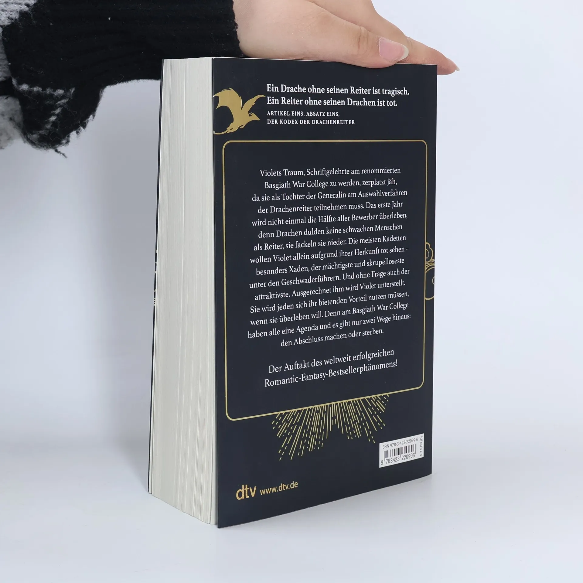 Ein Drache ohne seinen Reiter ist tragisch. Ein Reiter ohne seinen Drachen ist tot.Violets Traum, Schriftgelehrte am renommierten Basgiath War College zu werden, zerplatzt jäh, da sie als Tochter der Generalin am Auswahlverfahren der Drachenreiter teilnehmen muss. Das erste Jahr wird nicht einmal die Hälfte aller Bewerber überleben, denn Drachen binden sich nicht an schwache Menschen, sie fackeln sie nieder. Die meisten Kadetten wollen Violet allein aufgrund ihrer Herkunft niederstrecken – besonders Xaden, der mächtigste und skrupelloseste unter den Geschwaderführern. Und ohne Frage auch der attraktivste. Ausgerechnet ihm wird Violet unterstellt. Sie wird jeden Vorteil nutzen müssen, wenn sie überleben will. Denn am Basgiath War College haben alle eine Agenda und es gibt nur zwei Wege hinaus: den Abschluss machen oder sterben.
