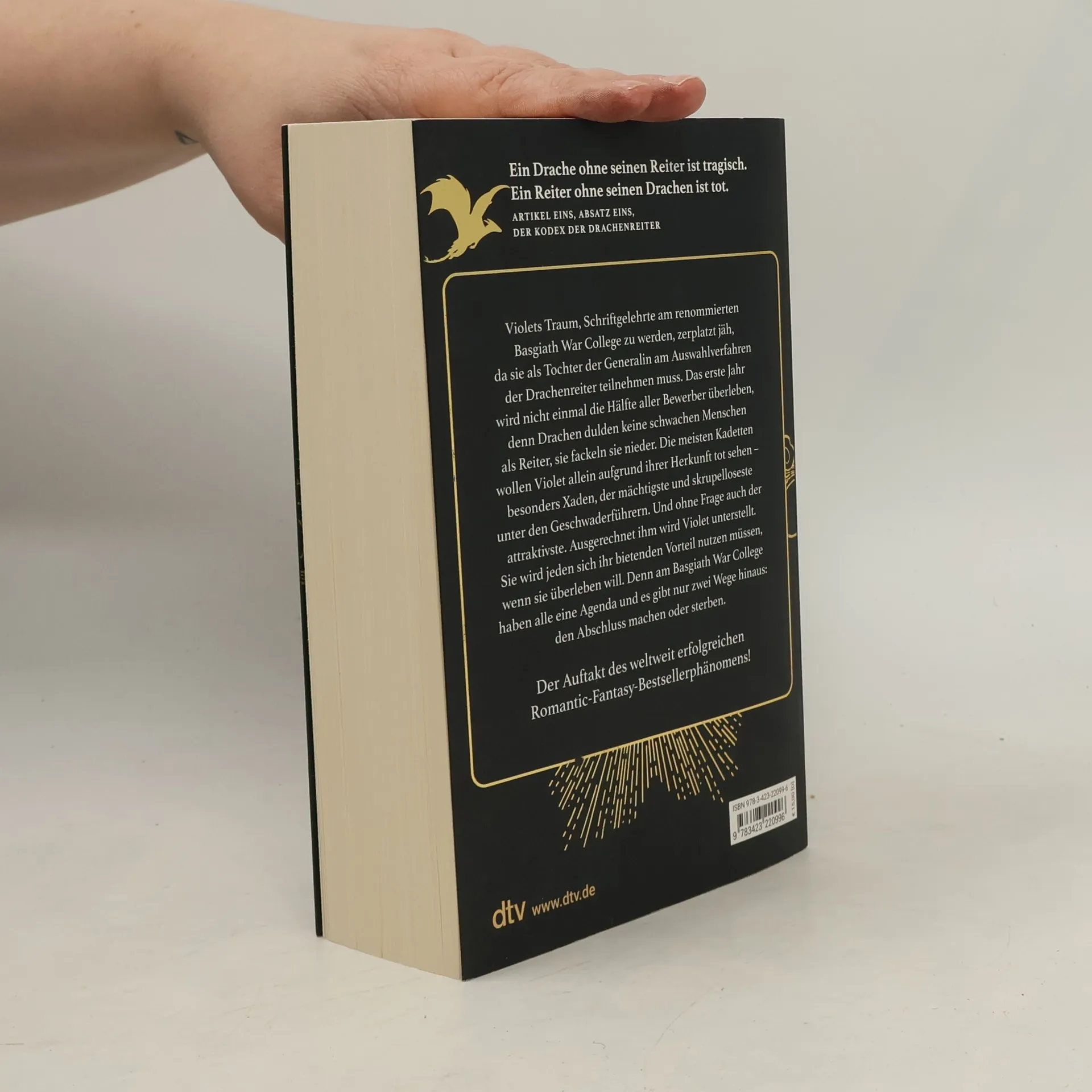 Ein Drache ohne seinen Reiter ist tragisch. Ein Reiter ohne seinen Drachen ist tot.Violets Traum, Schriftgelehrte am renommierten Basgiath War College zu werden, zerplatzt jäh, da sie als Tochter der Generalin am Auswahlverfahren der Drachenreiter teilnehmen muss. Das erste Jahr wird nicht einmal die Hälfte aller Bewerber überleben, denn Drachen binden sich nicht an schwache Menschen, sie fackeln sie nieder. Die meisten Kadetten wollen Violet allein aufgrund ihrer Herkunft niederstrecken – besonders Xaden, der mächtigste und skrupelloseste unter den Geschwaderführern. Und ohne Frage auch der attraktivste. Ausgerechnet ihm wird Violet unterstellt. Sie wird jeden Vorteil nutzen müssen, wenn sie überleben will. Denn am Basgiath War College haben alle eine Agenda und es gibt nur zwei Wege hinaus: den Abschluss machen oder sterben.