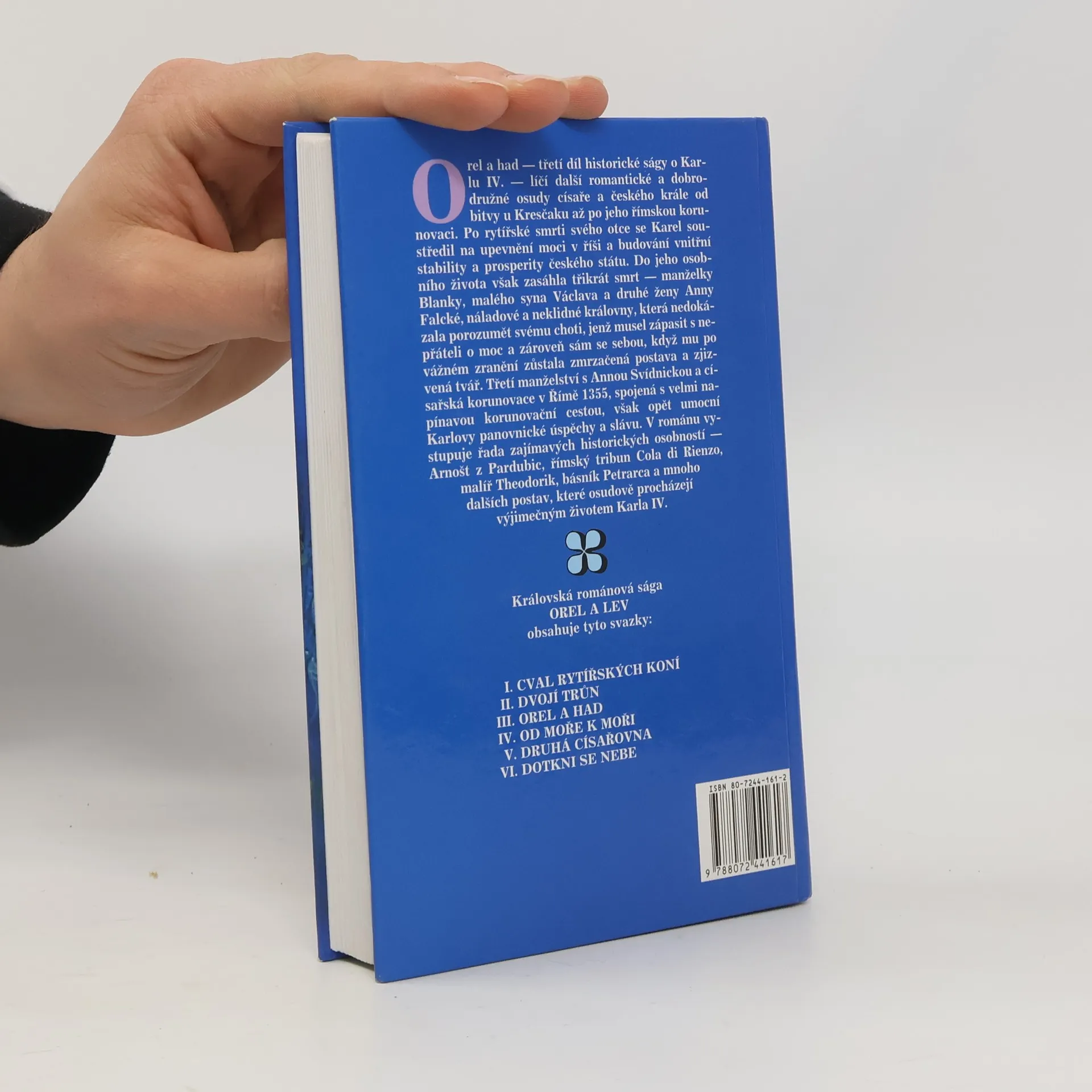 Třetí díl šestidílné románové ságy o Karlu IV. a jeho době. Po bitvě u Kresčaku zasáhla do Karlova života ještě třikrát smrt – manželky Blanky, malého syna Václava a druhé ženy Anny Falcké, náladové a neklidné královny, která nedokázala porozumět svému choti, když mu po vážném zranění zůstala zmrzačená postava a zjizvená tvář. Až třetí manželství s Annou Svídnickou a dobrodružná cesta do Říma k císařské korunovaci opět umocní Karlovy panovnické úspěchy a slávu. Laminovazba, dobrý stav