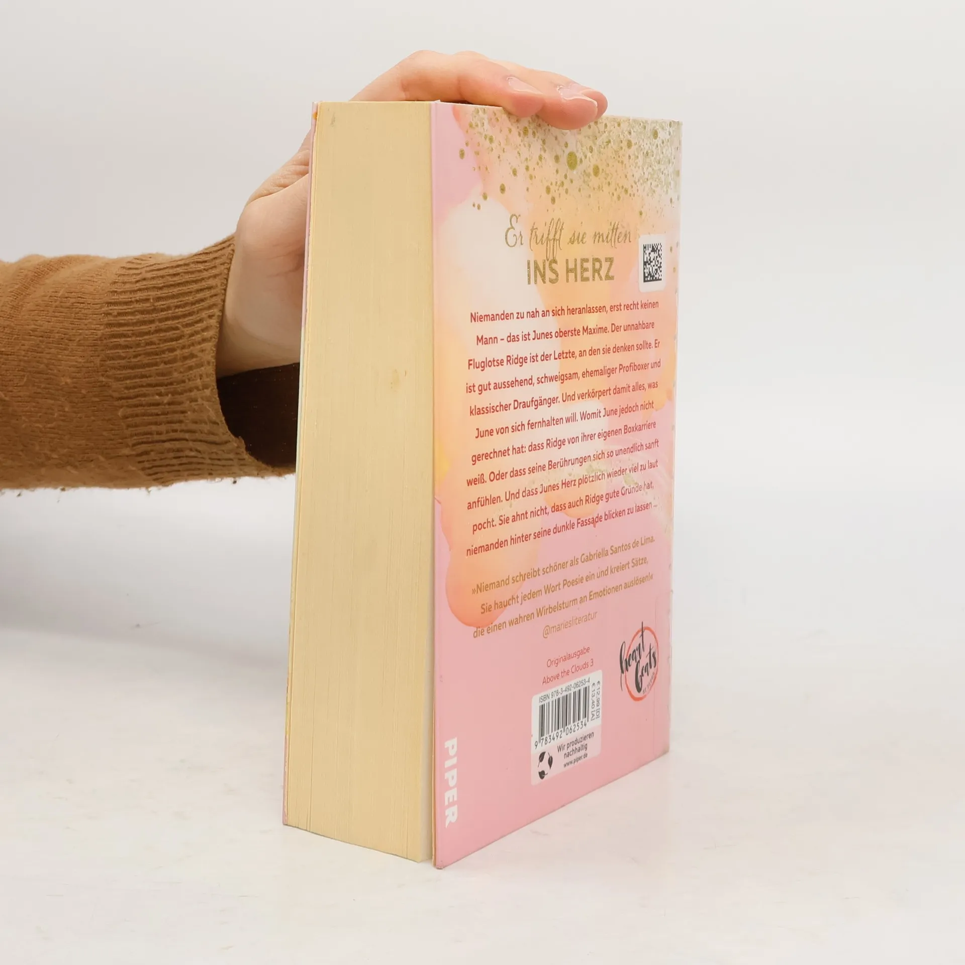 Niemanden zu nah an sich heranlassen, erst recht keinen Mann – das ist Junes oberste Maxime. Der unnahbare Fluglotse Ridge Chapman verkörpert alles, was June meiden möchte: gut aussehend, schweigsam, mysteriös und ehemaliger Profiboxer. Dennoch ist er der Einzige, der für ihr geheimes Fotoprojekt infrage kommt, da er ihr einen Gefallen schuldet. Überraschend weiß Ridge von Junes bisher verschwiegender Boxkarriere und seine Berührungen lassen ihr Herz plötzlich wieder laut pochen. Dabei ahnt sie nicht, dass auch Ridge Gründe hat, niemanden hinter seine dunkle Fassade blicken zu lassen. Die LeserInnen sind begeistert von der „Above the Clouds“-Trilogie, die sie auf eine emotionale Reise mitnimmt. „Flaming Clouds“ und „Endless Skies“ werden als tief und kraftvoll beschrieben, mit Charakteren, in die man sich verliebt. Die Bücher sind wie Lieblingssongs, die mitreißen und Gänsehaut verleihen. Gabriella Santos de Lima, geboren 1997 in São Paulo, studiert Kreatives Schreiben in Hildesheim und arbeitet nebenberuflich als Flugbegleiterin. Sie schreibt am liebsten mit Blick auf pulsierende Innenstädte und teilt auf Instagram unter @gabriellasantosdelimaa Buchtipps und Neuigkeiten aus ihrem Leben.
