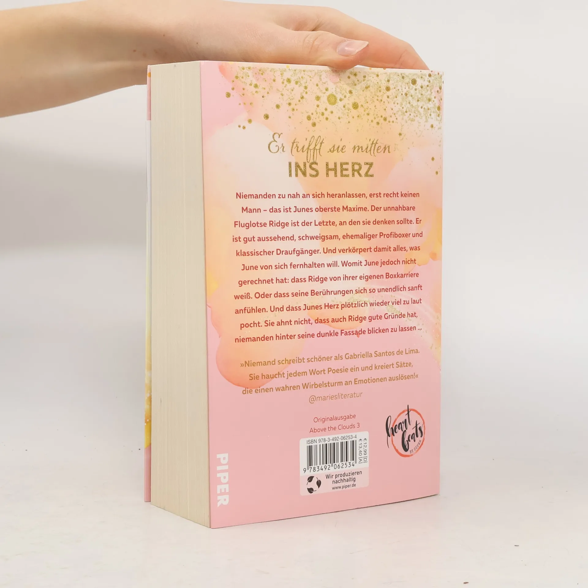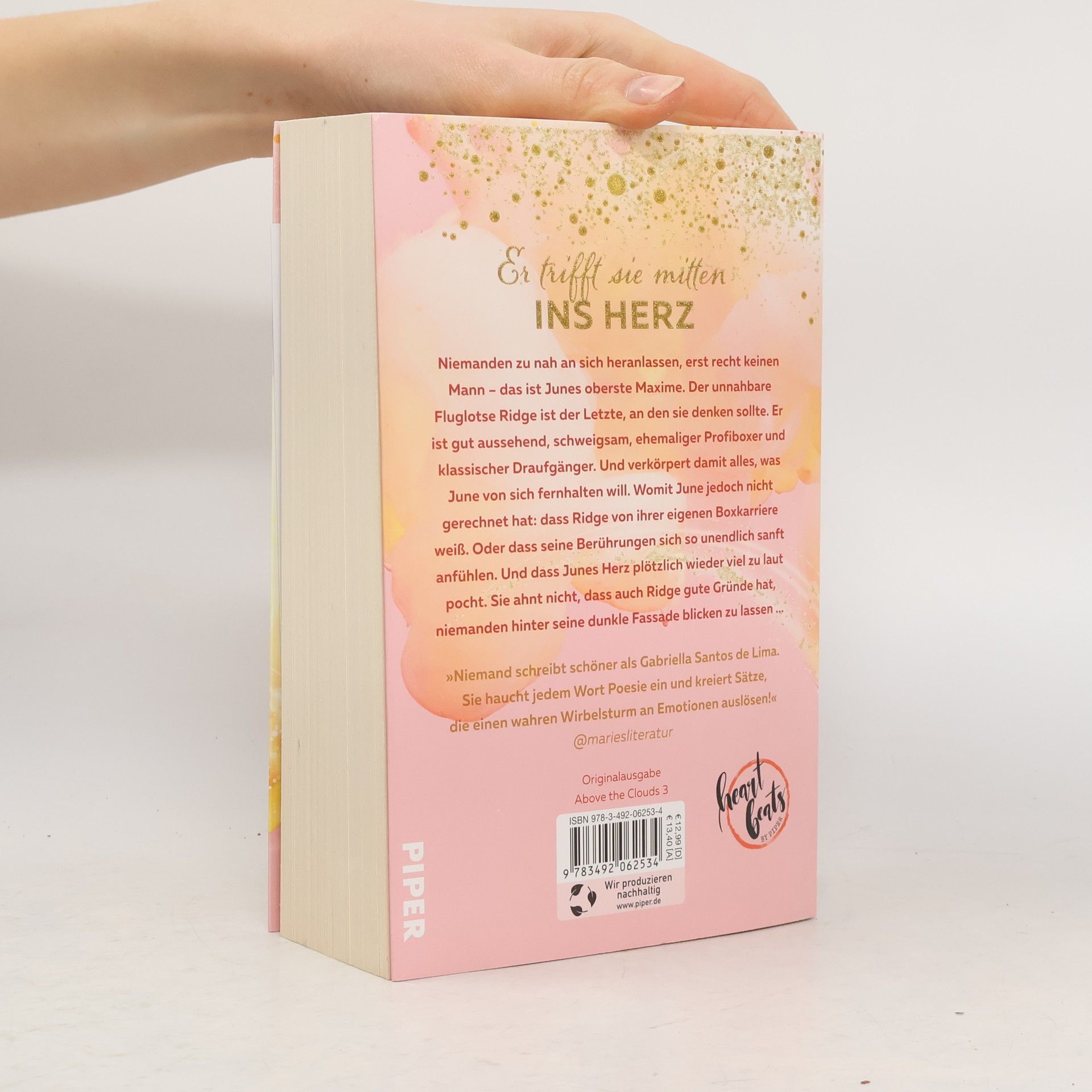 Niemanden zu nah an sich heranlassen, erst recht keinen Mann – das ist Junes oberste Maxime. Der unnahbare Fluglotse Ridge Chapman verkörpert alles, was June meiden möchte: gut aussehend, schweigsam, mysteriös und ehemaliger Profiboxer. Dennoch ist er der Einzige, der für ihr geheimes Fotoprojekt infrage kommt, da er ihr einen Gefallen schuldet. Überraschend weiß Ridge von Junes bisher verschwiegender Boxkarriere und seine Berührungen lassen ihr Herz plötzlich wieder laut pochen. Dabei ahnt sie nicht, dass auch Ridge Gründe hat, niemanden hinter seine dunkle Fassade blicken zu lassen. Die LeserInnen sind begeistert von der „Above the Clouds“-Trilogie, die sie auf eine emotionale Reise mitnimmt. „Flaming Clouds“ und „Endless Skies“ werden als tief und kraftvoll beschrieben, mit Charakteren, in die man sich verliebt. Die Bücher sind wie Lieblingssongs, die mitreißen und Gänsehaut verleihen. Gabriella Santos de Lima, geboren 1997 in São Paulo, studiert Kreatives Schreiben in Hildesheim und arbeitet nebenberuflich als Flugbegleiterin. Sie schreibt am liebsten mit Blick auf pulsierende Innenstädte und teilt auf Instagram unter @gabriellasantosdelimaa Buchtipps und Neuigkeiten aus ihrem Leben.