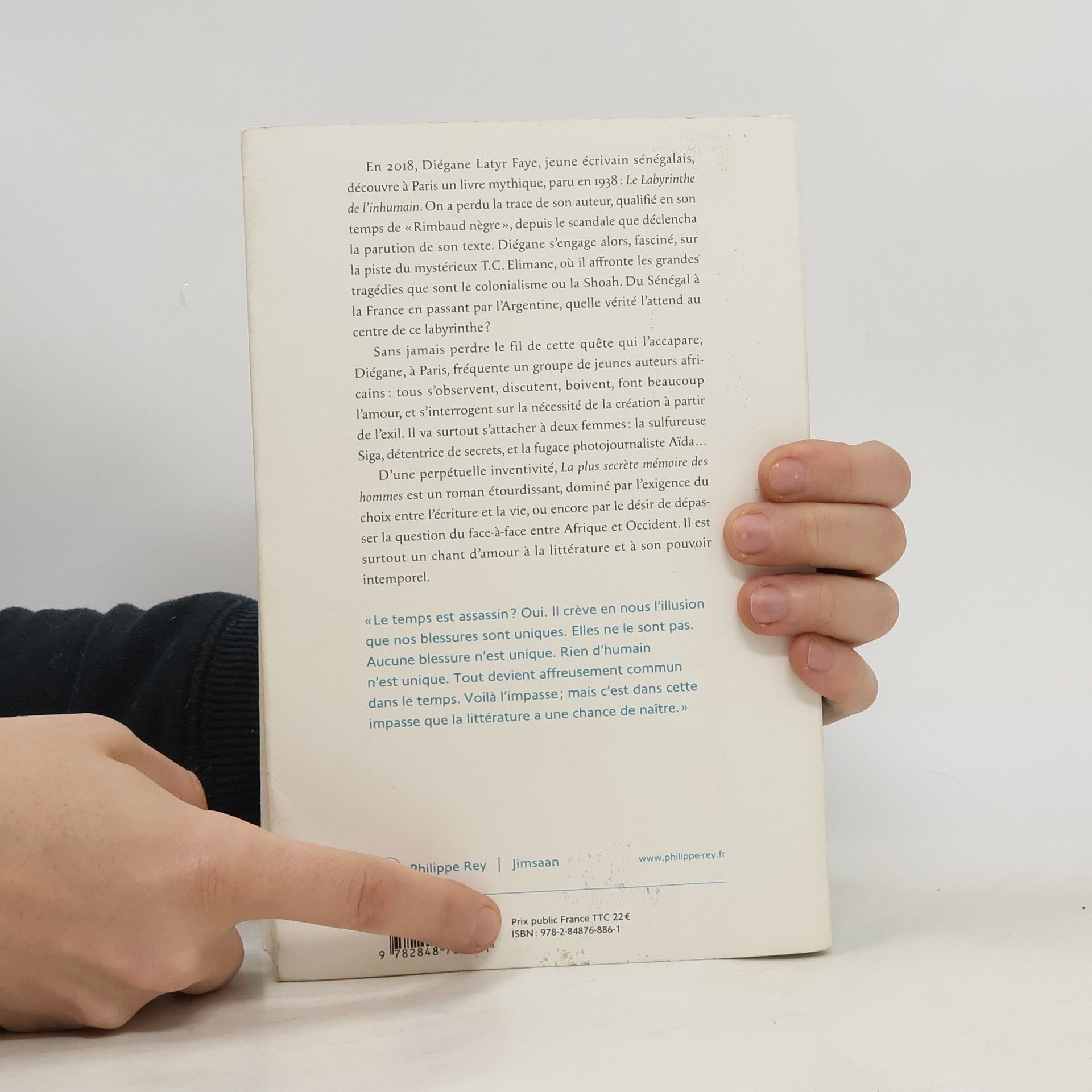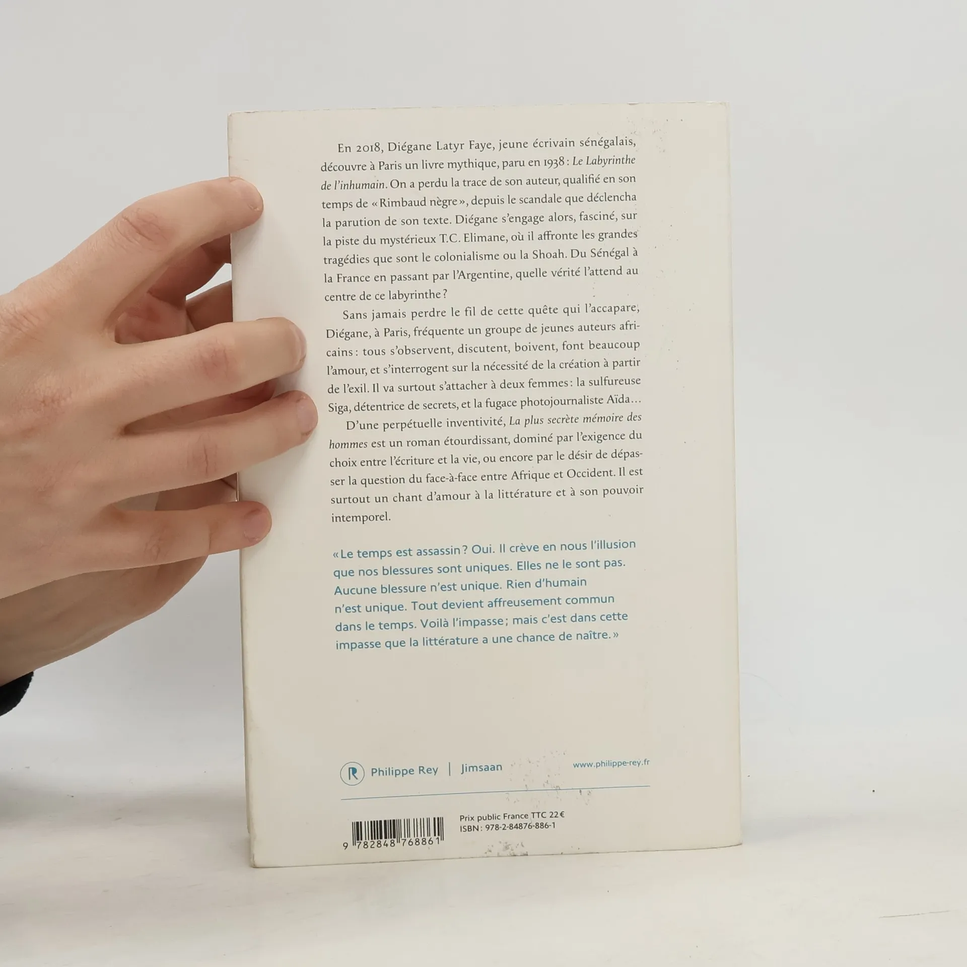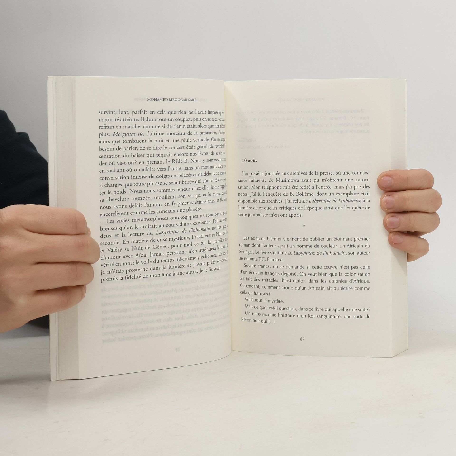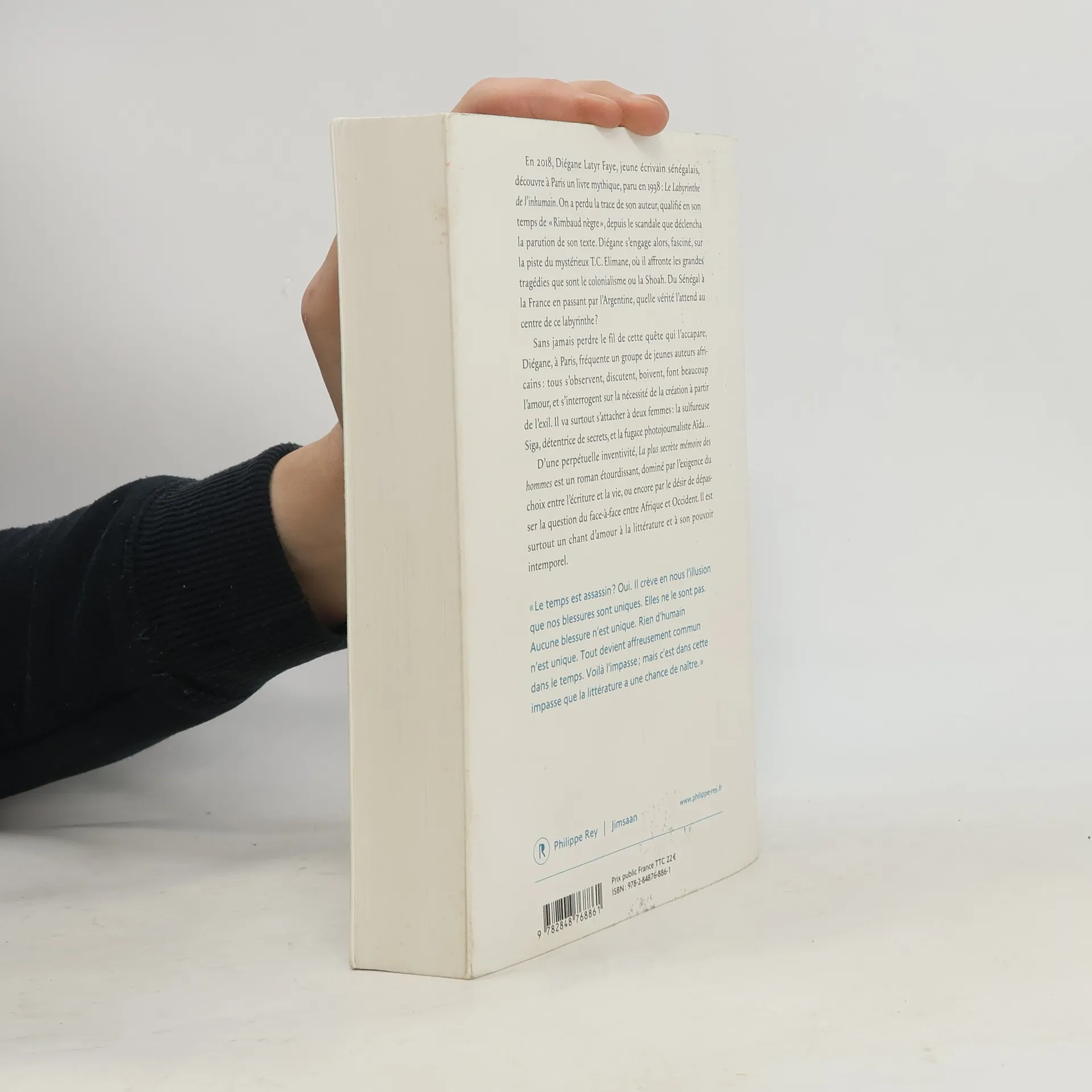 "En 2018, Diégane Latyr Faye, jeune écrivain sénégalais, découvre à Paris un livre mythique, paru en 1938 : Le labyrinthe de l'inhumain. On a perdu la trace de son auteur, qualifié en son temps de 'Rimbaud nègre', depuis le scandale que déclencha la parution de son texte. Diégane s'engage alors, fasciné, sur la piste du mystérieux T.C. Elimane, se confrontant aux grandes tragédies que sont le colonialisme ou la Shoah. Du Sénégal à la France en passant par l'Argentine, quelle vérité l'attend au centre de ce labyrinthe? Sans jamais perdre le fil de cette quête qui l'accapare, Diégane, à Paris, fréquente un groupe de jeunes auteurs africains : tous s'observent, discutent, boivent, font beaucoup l'amour, et s'interrogent sur la nécessité de la création à partir de l'exil. Il va surtout s'attacher à deux femmes : la sulfureuse Siga, détentrice de secrets, et la fugace photojournaliste Aïda... D'une perpétuelle inventivité, La plus secrète mémoire des hommes est un roman étourdissant, dominé par l'exigence du choix entre l'écriture et la vie, ou encore par le désir de dépasser la question du face-à-face entre Afrique et Occident. Il est surtout un chant d'amour à la littérature et à son pouvoir intemporel."--Page 4 of cover.