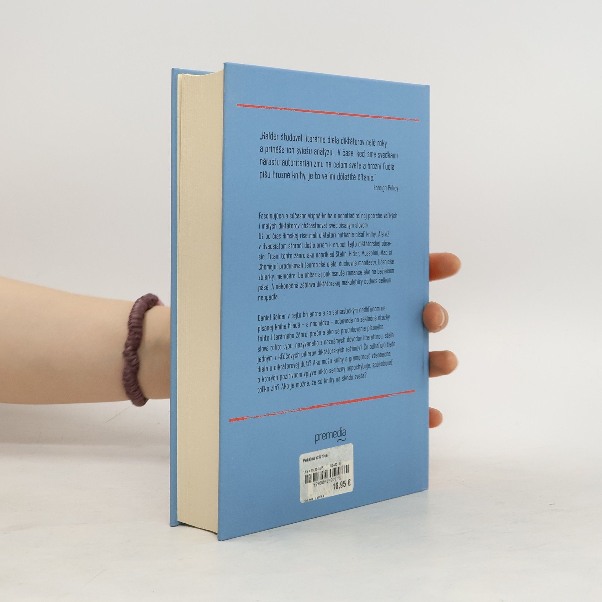 Fascinujúca a vtipná kniha skúma potrebu diktátorov obšťastňovať svet písaným slovom. Od čias Rímskej ríše mali diktátori nutkanie písať, ale až v dvadsiatom storočí sa táto obsesia rozšírila. Titani ako Stalin, Hitler, Mussolini, Mao či Chomejní produkovali teoretické dielo, duchovné manifesty, básne a dokonca aj romány. Tieto dielo, často považované za literatúru, sa stali kľúčovým pilierom diktátorských režimov. Daniel Kalder v knihe sarkasticky hľadá odpovede na otázky týkajúce sa tohto literárneho žánru: prečo a ako sa tieto písané slová stali súčasťou moci, čo odhaľujú o duši diktátorov a ako môžu knihy a gramotnosť, považované za pozitívne, spôsobovať zlo. Pekelná knižnica sa zameriava na dielo najkrvavejších diktátorov histórie, ktorí boli presvedčení o svojom historickom poslaní a spisovateľskej genialite. Tieto knihy sa predávali v miliónových nákladoch a čítali ich milióny ľudí, no väčšina z nich dnes predstavuje len dobovú kuriozitu bez literárnej hodnoty. Autor nás pozýva na fascinujúcu prechádzku týmto literárnym panoptikom.