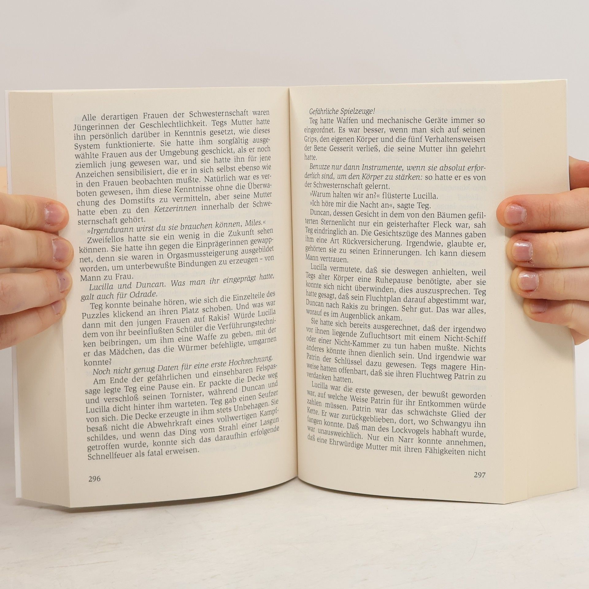 Hinter starken Barrieren verborgen wird das Herz zu Eis. Unter Gottkaiser Leto II. wurde die Menschheit über die Galaxis verstreut. Nun kehrt sie aus der Diaspora zurück. Neue Kräfte haben sich entwickelt, neue Technologen wurden entwickelt, und der Orden der Bene Gesserit, der seit Jahrtausenden über das genetische Erbe der Atreides wacht, sieht sich mit Mächten konfrontiert, wie es sie bisher nicht gab. Von Arrakis ist keine Hilfe zu erwarten, dort lebt nur noch eine zerstrittene Priesterschaft, die Leto in Gestalt Shai-Huluds, des gigantischen Sandwurms, anbetet, und die einstmals stolzen Fremen, jetzt nur noch ein Schatten ihrer selbst. Doch dann kommt ein Mädchen aus der Wüste, das mit geheimnisvollen Kräften über den Shai-Hulud gebietet und ihm seinen Willen aufzwingt.