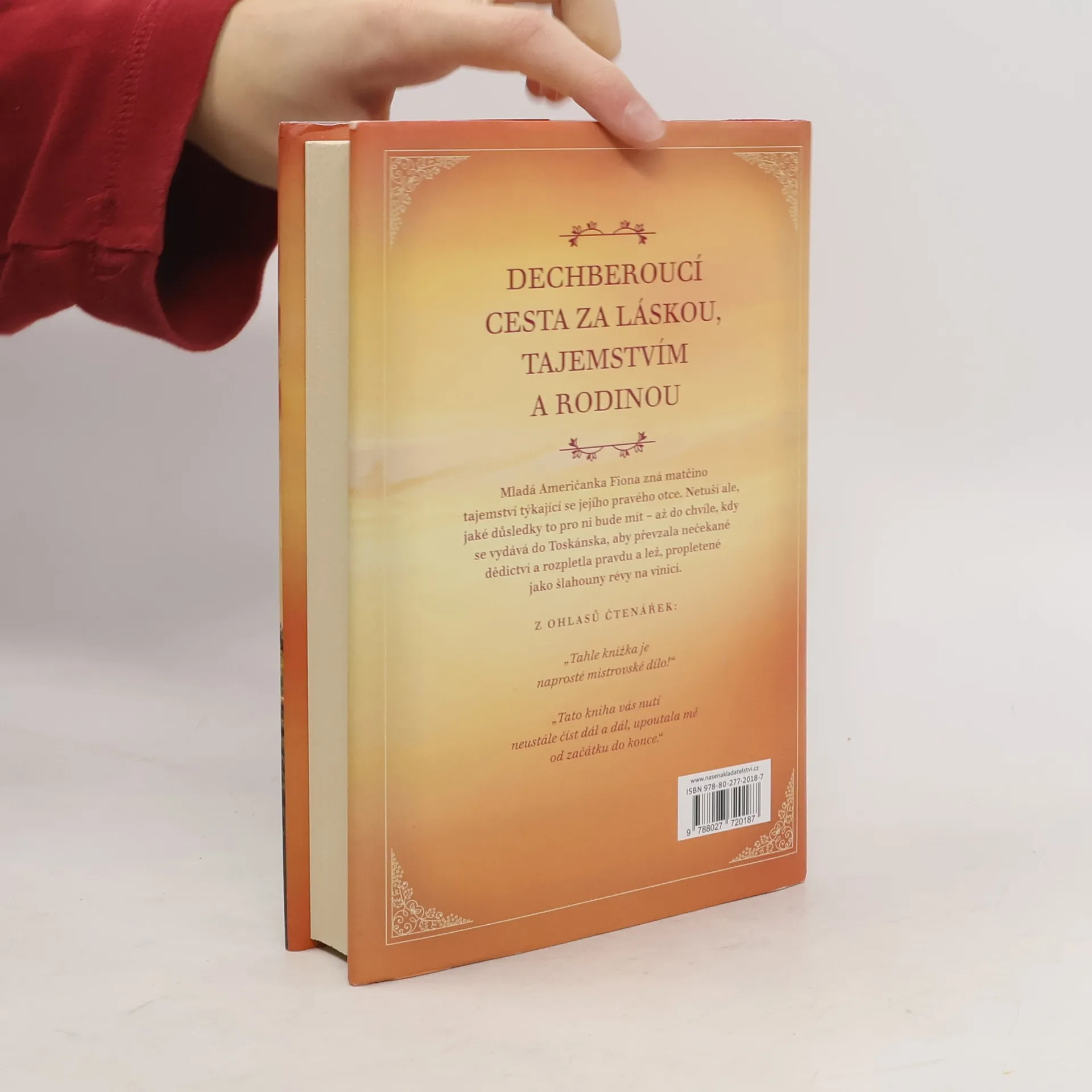 Jestli se Fiona ve svém životě něco naučila, pak to, jak udržet tajemství. Neprozradí jej ani otci, který ji vychoval. Je jediná, kdo ví o matčině milostném románku, který se odehrál před třiceti lety v Toskánsku, a nehodlá na tom nic měnit. Dokud jí jednoho dne nezavolá advokátka s překvapivou zprávou: její biologický otec zemřel a přenechal jí jisté dědictví. A navíc dva sourozence. Fiona odjíždí do Itálie, kde její pouhá existence šokuje celou rodinu. Nevlastní sourozenci se ze všech sil snaží popřít její právo na dědický podíl, zatímco ona pomalu rozplétá zamotané nitky tajemství matčina románku. Fiona se musí vypořádat se složitými rodinnými vztahy a napjatou atmosférou sourozenecké rivality. Během pátrání po pravdě o osudném létě, které její matka strávila v Itálii s jejím vlastním otcem, kterého nikdy nepoznala, čelí Fiona mnohým obavám, ale zároveň touží přijmout svůj nový osud.