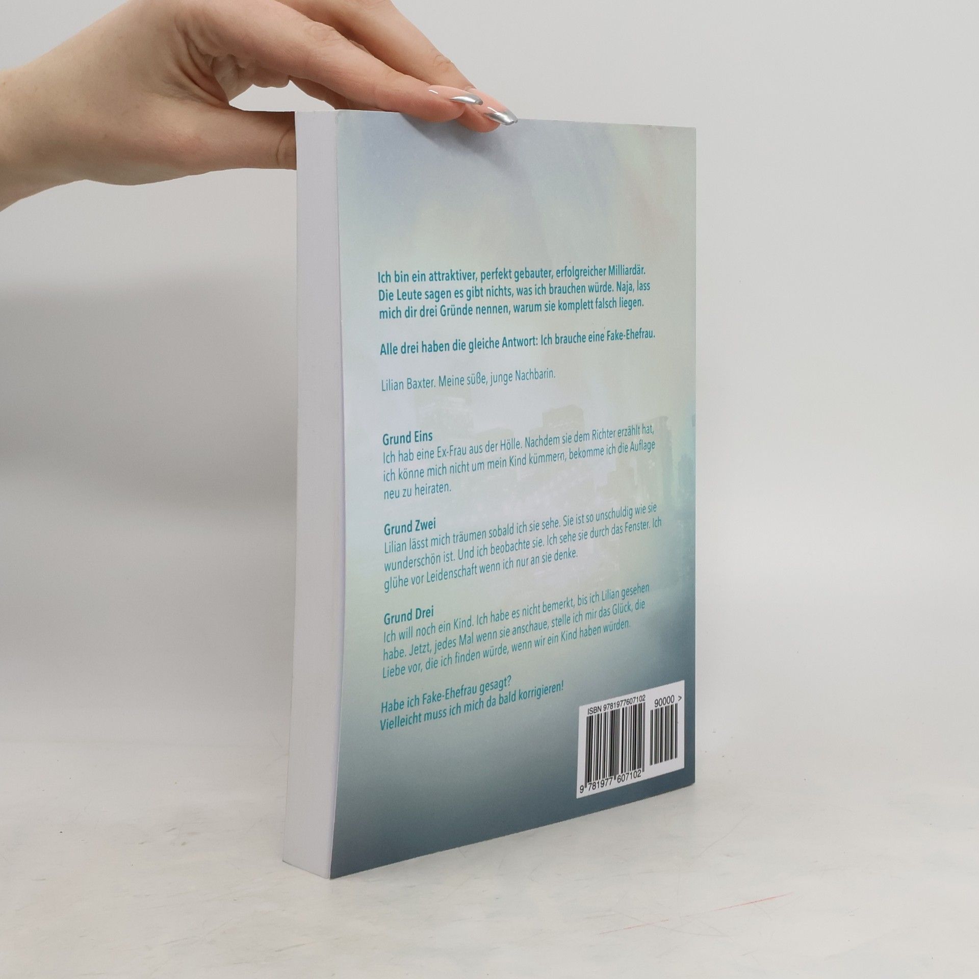 Ich bin ein attraktiver, perfekt gebauter, erfolgreicher Milliard�r.Die Leute sagen es gibt nichts, was ich brauchen w�rde.Naja, lass mich dir drei Gr�nde nennen, warum sie komplett falsch liegen.Alle drei haben die gleiche Antwort: Ich brauche eine Fake-Ehefrau. Lilian Baxter. Meine s��e, junge Nachbarin. Grund EinsIch hab eine Ex-Frau aus der H�lle. Nachdem sie dem Richter erz�hlt hat, ich k�nne mich nicht um mein Kind k�mmern, bekomme ich die Auflage neu zu heiraten.Grund ZweiLilian l�sst mich tr�umen sobald ich sie sehe.Sie ist so unschuldig wie sie wundersch�n ist.Und ich beobachte sie. Ich sehe sie durch das Fenster.Ich gl�he vor Leidenschaft wenn ich nur an sie denke.Grund DreiIch will noch ein Kind. Ich habe es nicht bemerkt, bis ich Lilian gesehen habe. Jetzt, jedes Mal wenn sie anschaue, stelle ich mir das Gl�ck, die Liebe vor, die ich finden w�rde, wenn wir ein Kind haben w�rden. Habe ich Fake-Ehefrau gesagt? Vielleicht muss ich mich da bald korrigieren!