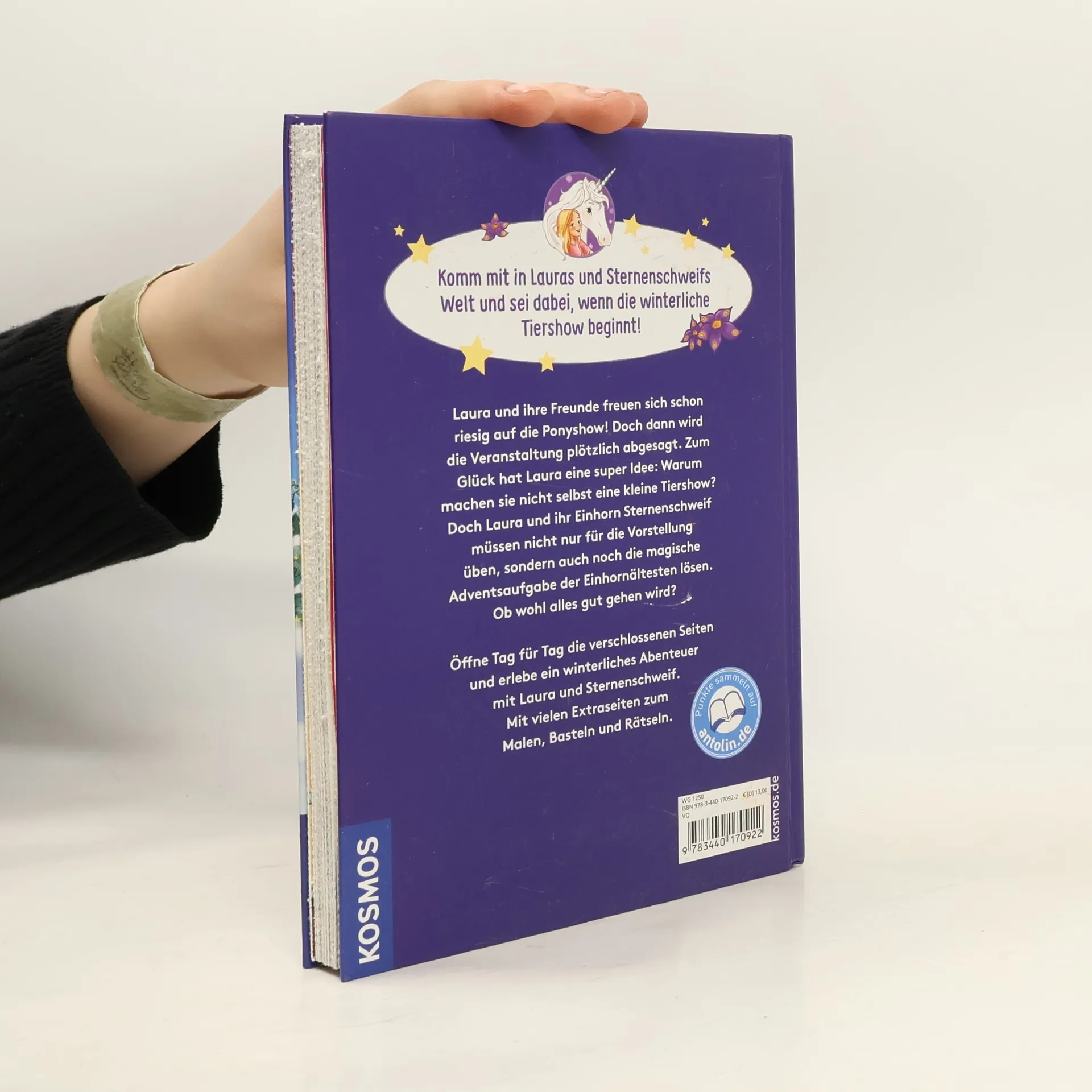 Ein weihnachtliches Sternenschweif-Abenteuer in 24 Kapiteln, versteckt hinter verschlossenen Seiten. Zusätzlich zu jedem Kapitel gibt es weihnachtliche Bastelideen, Rezepte, Rätsel und zauberhafte Sternenschweif Stickerbogen. Laura und ihre Freunde planen eine weihnachtliche Tiershow. Doch dann kommt es zum Streit und Pony Buddy verschwindet. Wird der magische Spiegel Laura und Sternenschweif helfen, die Show zu retten?