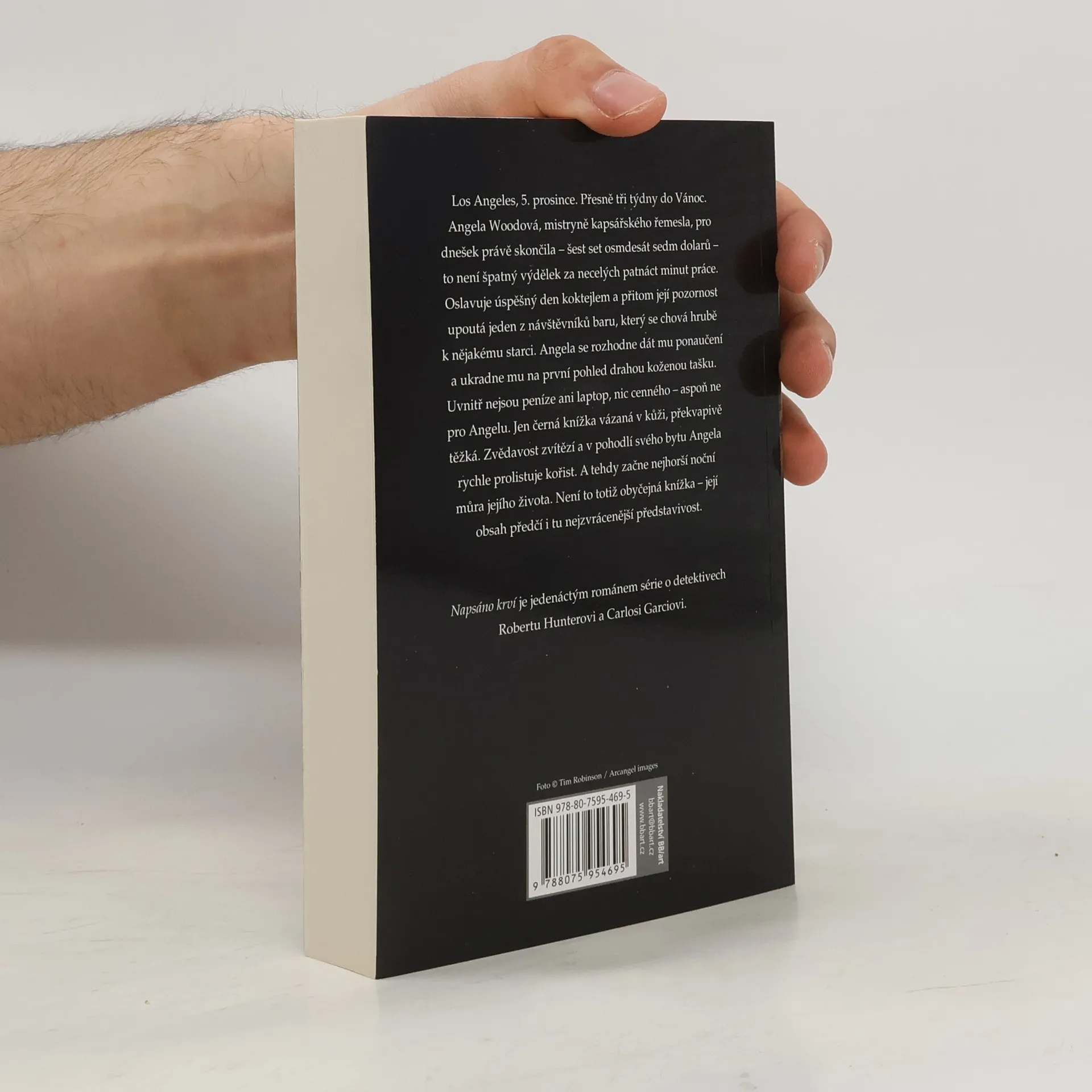 Když si napíše vaše jméno, je to rozsudek smrti… Los Angeles, 5. prosince. Přesně tři týdny do Vánoc. Angela Woodová, mistryně kapsářského řemesla, pro dnešek právě skončila – šest set osmdesát sedm dolarů – to není špatný výdělek za necelých patnáct minut práce. Oslavuje úspěšný den koktejlem a přitom její pozornost upoutá jeden z návštěvníků baru, který se chová hrubě k nějakému starci. Angela se rozhodne dát mu ponaučení a ukradne mu na první pohled drahou koženou tašku. Uvnitř nejsou peníze ani laptop, nic cenného – aspoň ne pro Angelu. Jen černá knížka vázaná v kůži, překvapivě těžká. Zvědavost zvítězí a v pohodlí svého bytu Angela rychle prolistuje kořist. A tehdy začne nejhorší noční můra jejího života. Není to totiž obyčejná knížka – její obsah předčí i tu nejzvrácenější představivost. Napsáno krví je jedenáctým románem série o detektivech Robertovi Hunterovi a Carlosi Garciovi.