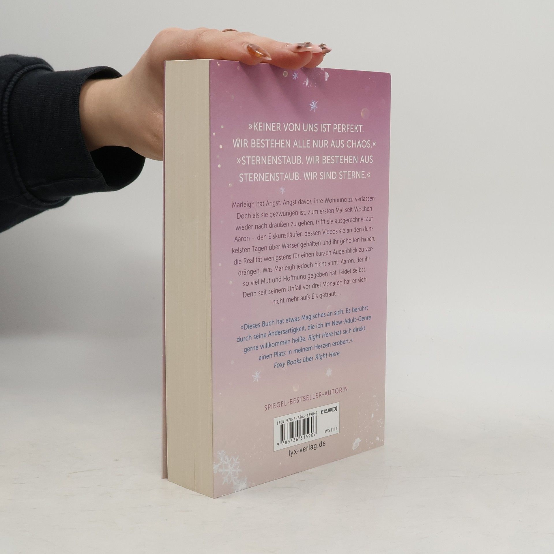 „Keiner von uns ist perfekt. Wir bestehen alle nur aus Chaos.“ „Sternenstaub. Wir bestehen aus Sternenstaub. Wir sind Sterne.“ Marleigh hat Angst. Angst davor, ihre Wohnung zu verlassen. Doch als sie gezwungen ist, zum ersten Mal seit Wochen wieder nach draußen zu gehen, trifft sie ausgerechnet auf Aaron - den Eiskunstläufer, dessen Videos sie an den dunkelsten Tagen über Wasser gehalten und ihr geholfen haben, die Realität wenigstens für einen kurzen Augenblick zu verdrängen. Was Marleigh jedoch nicht ahnt: Aaron, der ihr so viel Mut und Hoffnung gegeben hat, leidet selbst. Denn seit seinem Unfall vor drei Monaten hat er sich nicht mehr aufs Eis getraut ... „Dieses Buch hat etwas Magisches an sich. Es berührt durch seine Andersartigkeit, die ich im New-Adult-Genre gerne willkommen heiße. RIGHT HERE hat sich direkt einen Platz in meinem Herzen erobert.“ FOXY BOOKS über RIGHT HERE Band 2 der ON ICE -Reihe von SPIEGEL -Bestseller-Autorin Anne Pätzold
