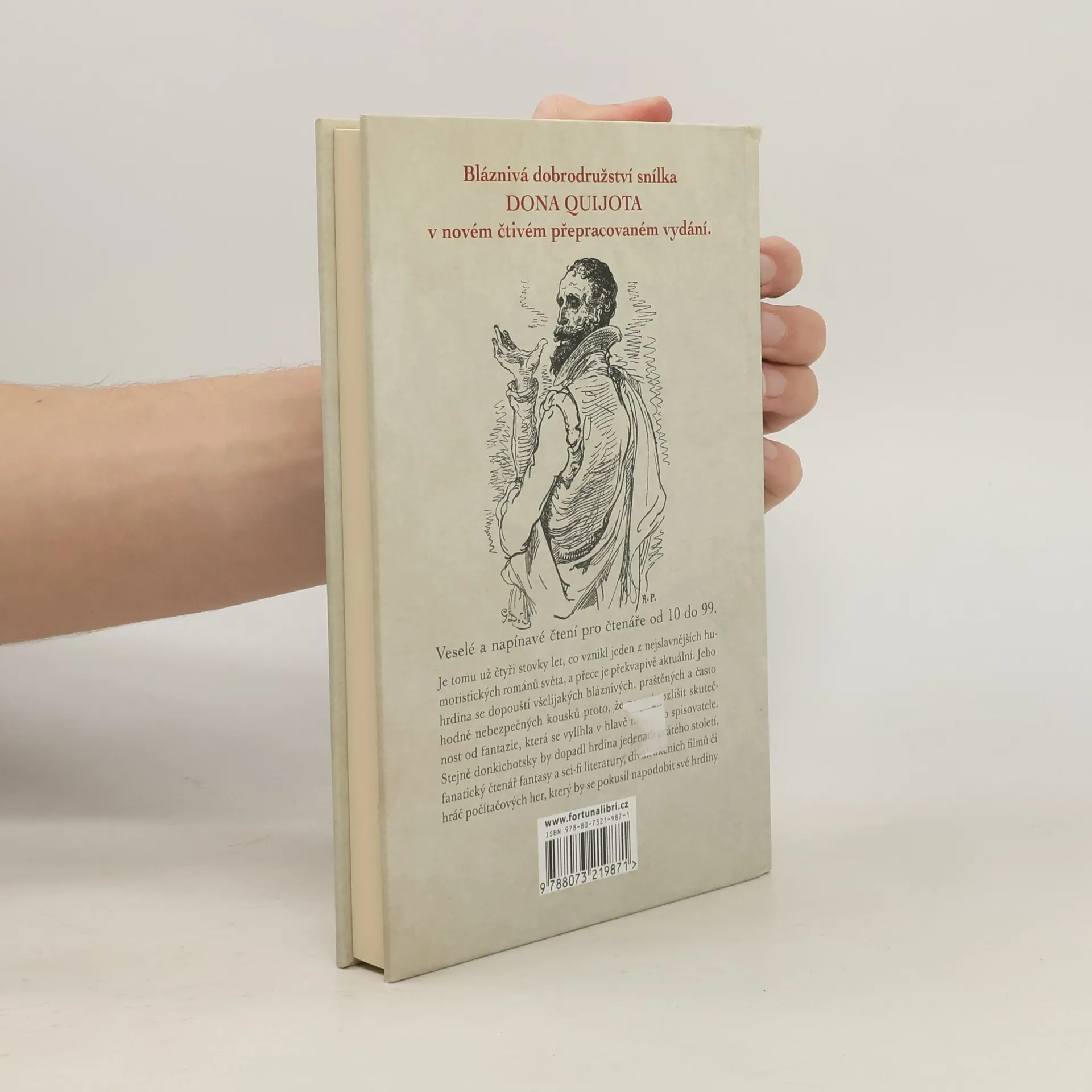 Bláznivá dobrodružství snílka Dona Quijota v novém čtivém přepracovaném vydání. Je tomu už čtyři stovky let, co vznikl jeden z nejslavnějších humoristických románů světa, a přece je překvapivě aktuální. Jeho hrdina se dopouští všelijakých bláznivých, praštěných a často hodně nebezpečných kousků proto, že neumí rozlišit skutečnost od fantazie, která se vylíhla v hlavě nějakého spisovatele. Stejně donkichotsky by dopadl hrdina jedenadvacátého století, fanatický čtenář fantasy a sci-fi literatury, divák akčních filmů či hráč počítačových her, který by se pokusil napodobit své hrdiny.