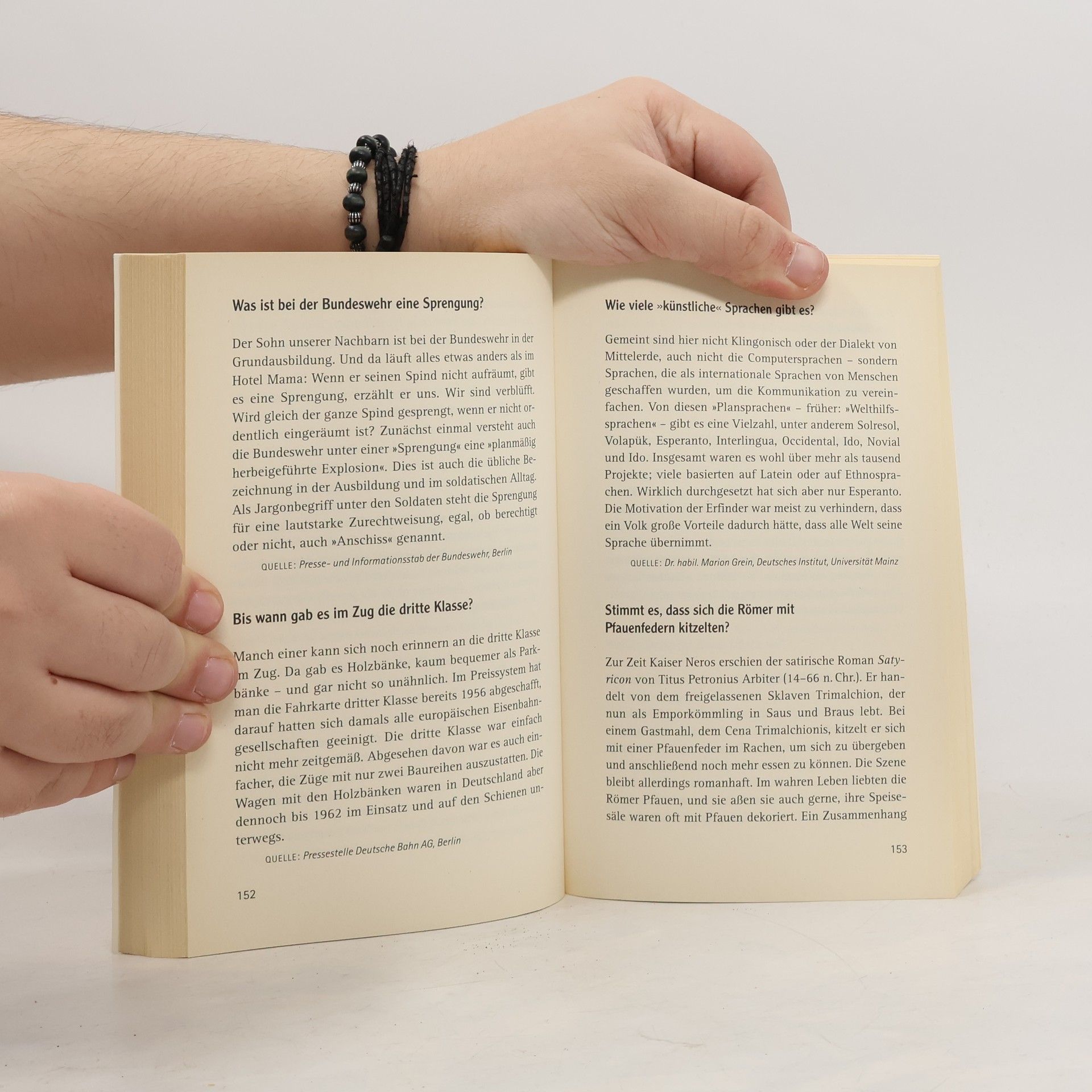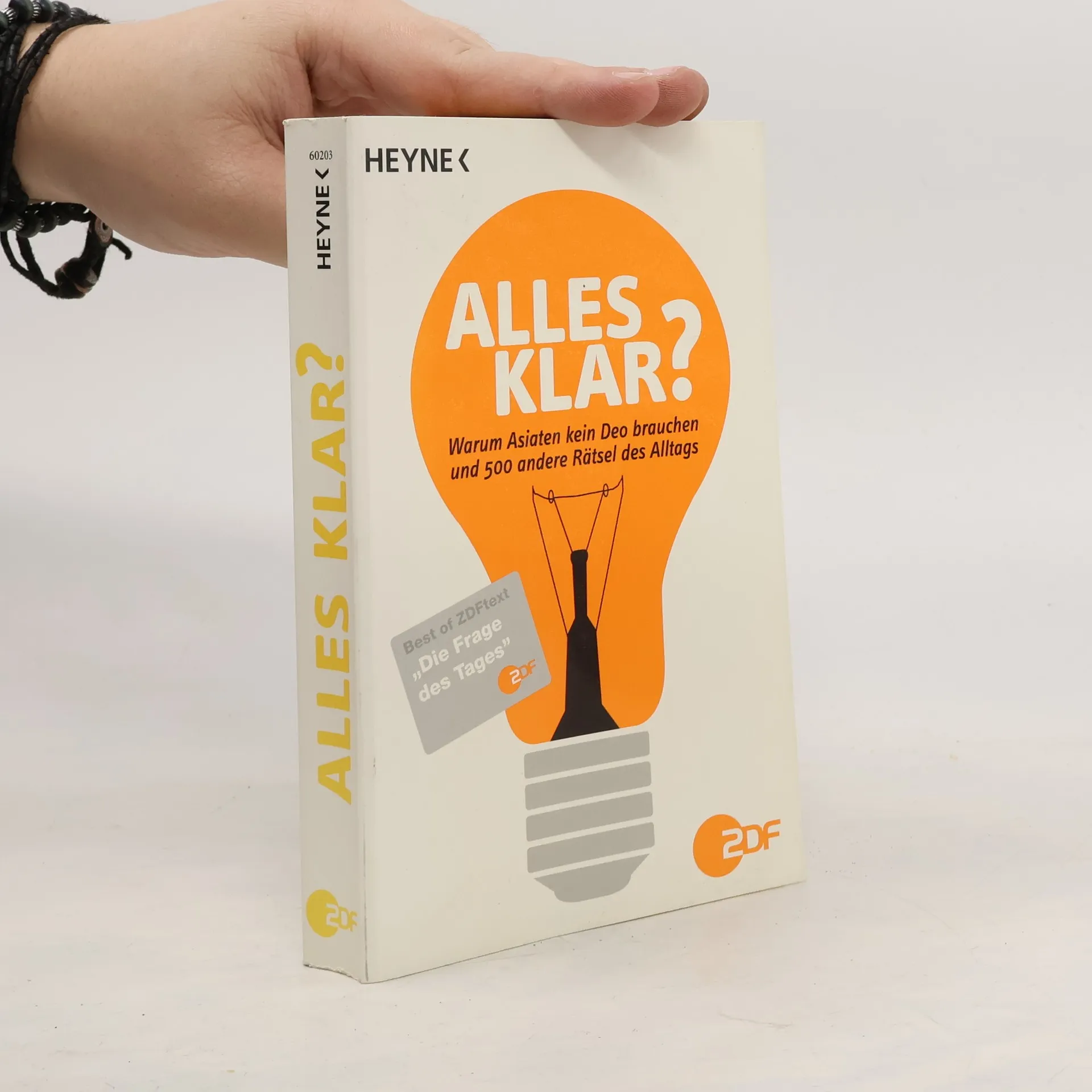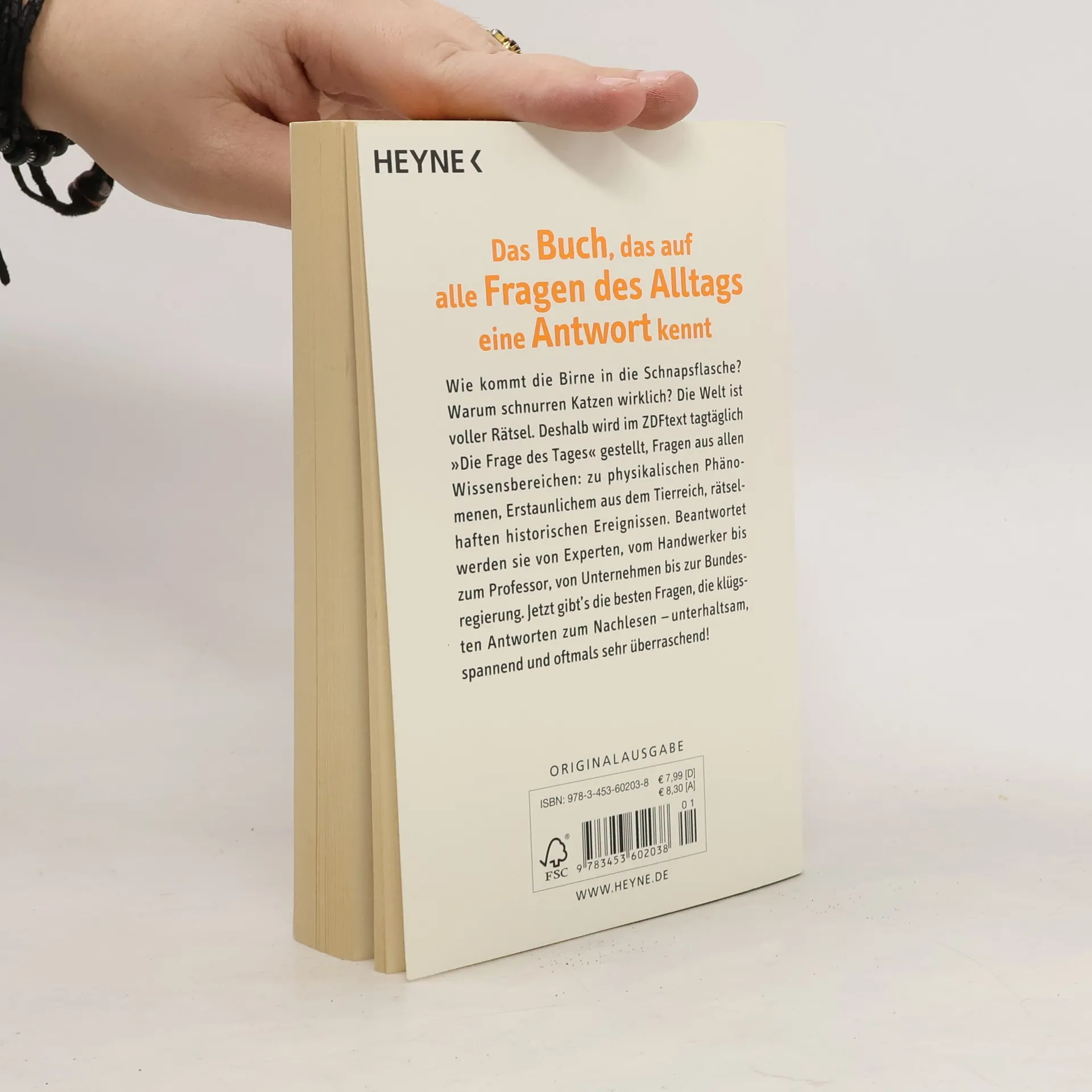 Das Buch, das auf alle Fragen des Alltags eine Antwort kennt Wie kommt die Birne in die Schnapsflasche? Warum schnurren Katzen wirklich? Die Welt ist voller Rätsel. Deshalb wird im ZDF-text tagtäglich »Die Frage des Tages« gestellt, Fragen aus allen Wissensbereichen: zu physikalischen Phänomenen, Erstaunlichem aus dem Tierreich, rätselhaften historischen Ereignissen. Beantwortet werden sie von Experten, vom Hand werker bis zum Professor, von Unternehmen bis zur Bundes regierung. Jetzt gibt’s die besten Fragen, die klügsten Antworten zum Nachlesen – unterhaltsam, spannend und oftmals sehr überraschend!