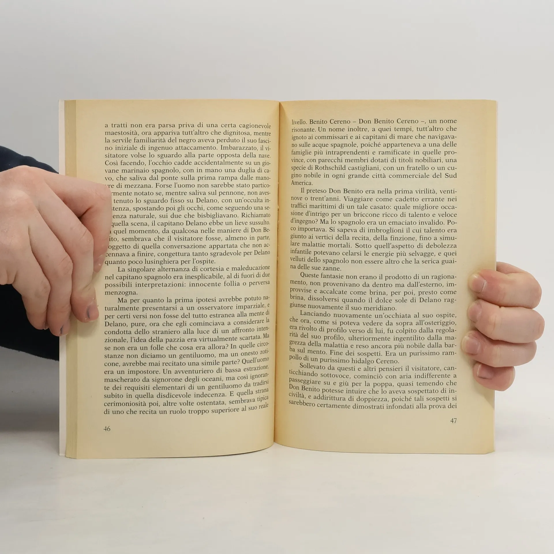 Benito Cereno è una grande e tragica avventura di mare, è un racconto denso di suspence e tensione, è una vicenda disperata che rivela l'aspetto buio, profondo dell'umanità, sempre adombrato dalla superficie del mare. Ma è anche il dramma dell'inesplicabile mistero che lega l'uomo alla natura, la messa in scena dell'impotenza umana sotto la cappa plumbea della bonaccia. È un incubo di prodigiosa potenza, simile alle più crude tragedie shakespeariane, ma anche l'enigma dei differenti comportamenti e destini umani di fronte all'irruzione del mondo infero nella realtà quotidiana. Cinquant'anni dopo la celebre traduzione di Cesare Pavese, Benito Cereno torna al lettore italiano nella traduzione di un poeta che svolge da tempo un lavoro di ricognizione e proposta entro il filone-metafisico della letteratura, da Marlowe a Whitman, da Coleridge a Melville.