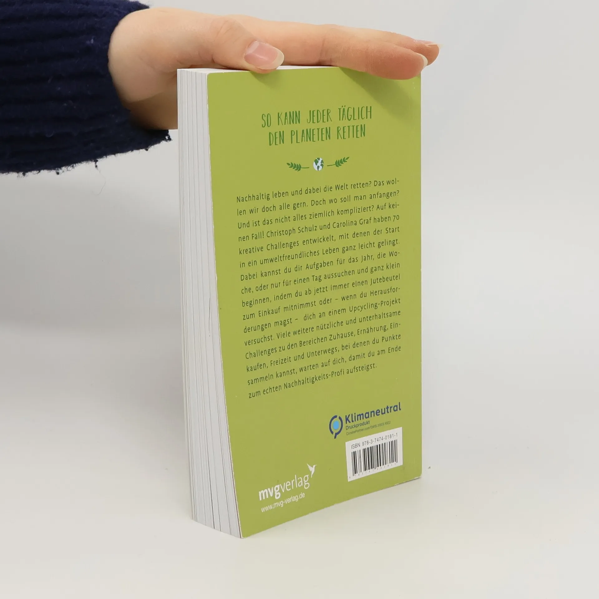 Nachhaltig leben und dabei die Welt retten? Das wollen wir doch alle gern. Doch wo soll man anfangen? Und ist das nicht alles ziemlich kompliziert? Auf keinen Fall! Christoph Schulz und Carolina Graf haben 70 kreative Challenges entwickelt, mit denen der Start in ein umweltfreundliches Leben ganz leicht gelingt. Dabei kannst du dir Aufgaben für das Jahr, die Woche, oder nur für einen Tag aussuchen und ganz klein beginnen, indem du ab jetzt immer einen Jutebeutel zum Einkauf mitnimmst oder – wenn du Herausforderungen magst – dich an einem Upcycling-Projekt versuchst. Viele weitere nützliche und unterhaltsame Challenges zu den Bereichen Zuhause, Ernährung, Einkaufen, Freizeit und Unterwegs, bei denen du Punkte sammeln kannst, warten auf dich, damit du am Ende zum echten Nachhaltigkeits-Profi aufsteigst.