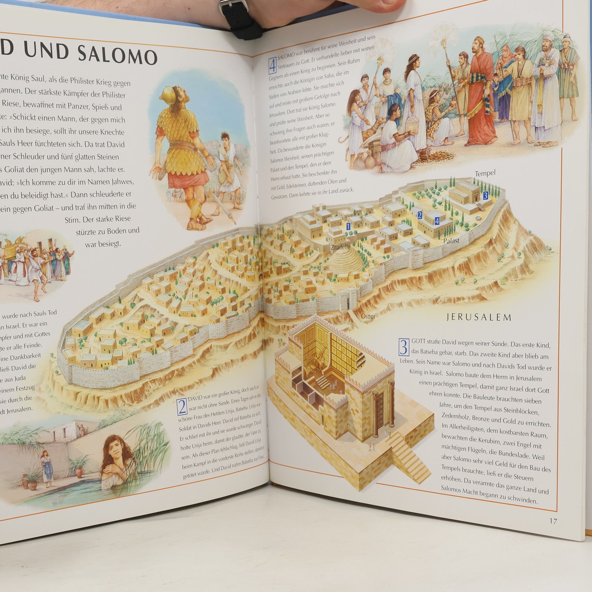 Mehr als ein Atlas: Das grossformatige Buch ist eine gelungene Mischung von Atlas, Erzähl- und Sachbuch. Da sind die übersichtlich gestalteten Karten, bei denen man nicht durch eine Fülle von Namen "erschlagen" wird: Nur gerade die Orte, die bei einem bestimmten Thema wichtig sind, sind eingezeichnet. Kleine Nummern bei den Orten verweisen auf die Texte rings um die Karten: Hier werden die biblischen Geschichten kurz, aber gut, nacherzählt. Aufgelockert werden die Karten durch viele Bilder, die zu den geschilderten Ereignissen gehören, oder die das Leben der damaligen Zeit darstellen. So sehen wir in den Tempel Salomons hinein oder blicken auf die Stadt Jerusalem. In Kästchen gibt es weitere Informationen, etwa über die Sumerer oder Alexander den Grossen. Menschen und Orte von A bis Z sowie ein Register helfen mit, sich zurecht zu finden. So bietet das Buch eine spannende Entdeckungsreise in die Welt der Bibel! Ab 9 Jahren, ausgezeichnet, Irene Beglinger-Flückiger