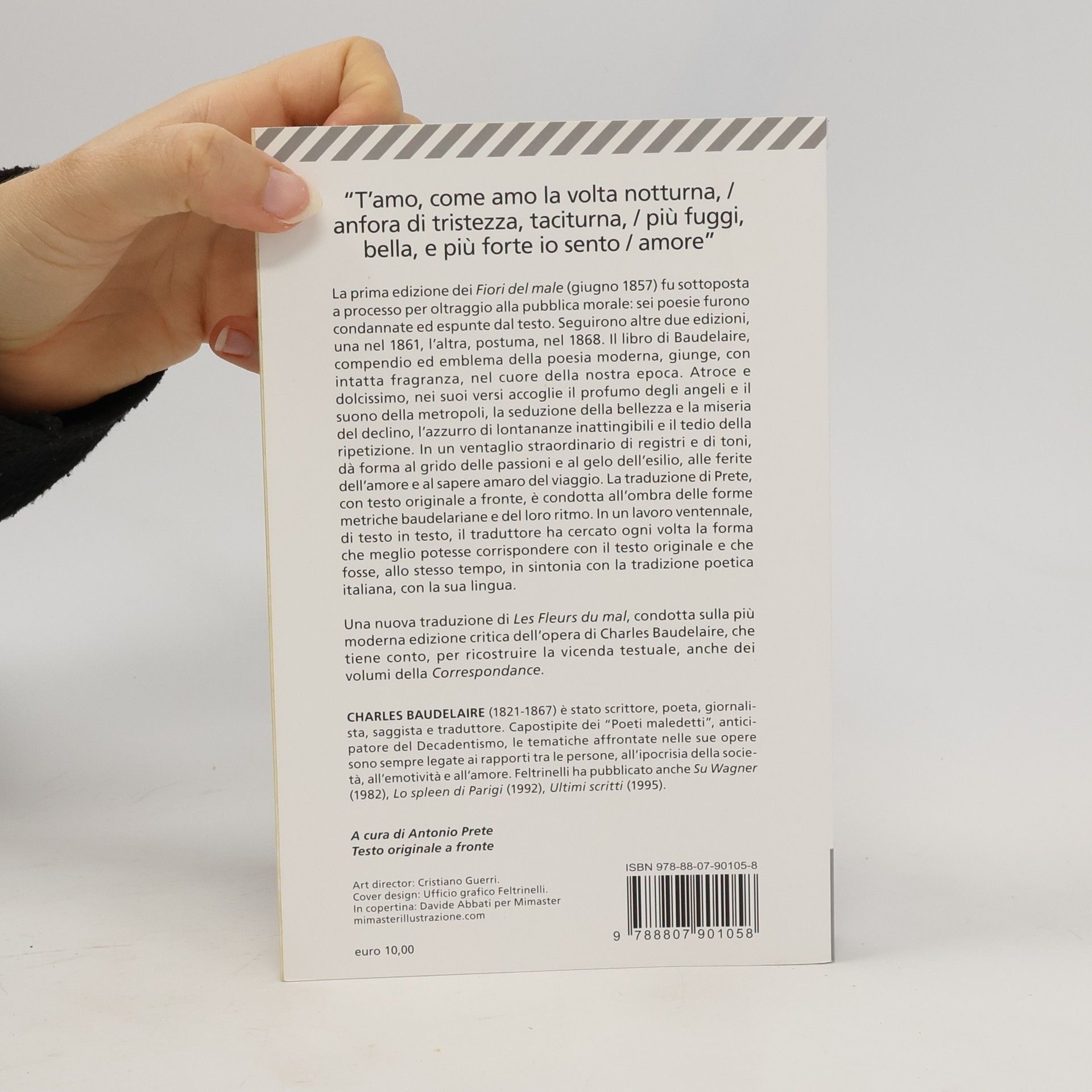 Testo originale a fronte. La prima edizione dei Fiori del male risale al giugno del 1857 e comprende cento testi poetici. È messa in vendita in circa 1100 esemplari, dagli editori Poulet-Malassis et De Broise. Attaccata da "Le Figaro", l'opera sarà sottoposta a sequestro e l'autore e gli editori, nell'agosto 1857, saranno condannati per oltraggio alla pubblica morale e al buon costume. Il volume verrà rimesso in circolazione privato delle sei pièces condamnées ed esaurirà la tiratura in un anno. Seguiranno altre due edizioni (l'ultima postuma) accresciute. La presente edizione segue il testo de Les Fleurs du mal tratto dalle Œuvres Complètes nella Pléiade (Gallimard 1975). Curata da Claude Pichois, l'edizione risulta ormai fondamentale e di riferimento per tutti gli studiosi baudelairiani. La traduzione di Prete è condotta "all'ombra delle forme metriche baudelairiane, anzi, persino, quando è stato possibile, all'ombra del loro ritmo". Prete ha cercato, in un lavoro pressoché ventennale, di testo in testo, un'analogia metrica, cioè la forma metrica italiana che garantisse allo stesso tempo una corrispondenza con il testo originale e una corrispondenza e plausibilità, nella nostra lingua poetica, della sua tradizione. [Dal sito della casa editrice.]